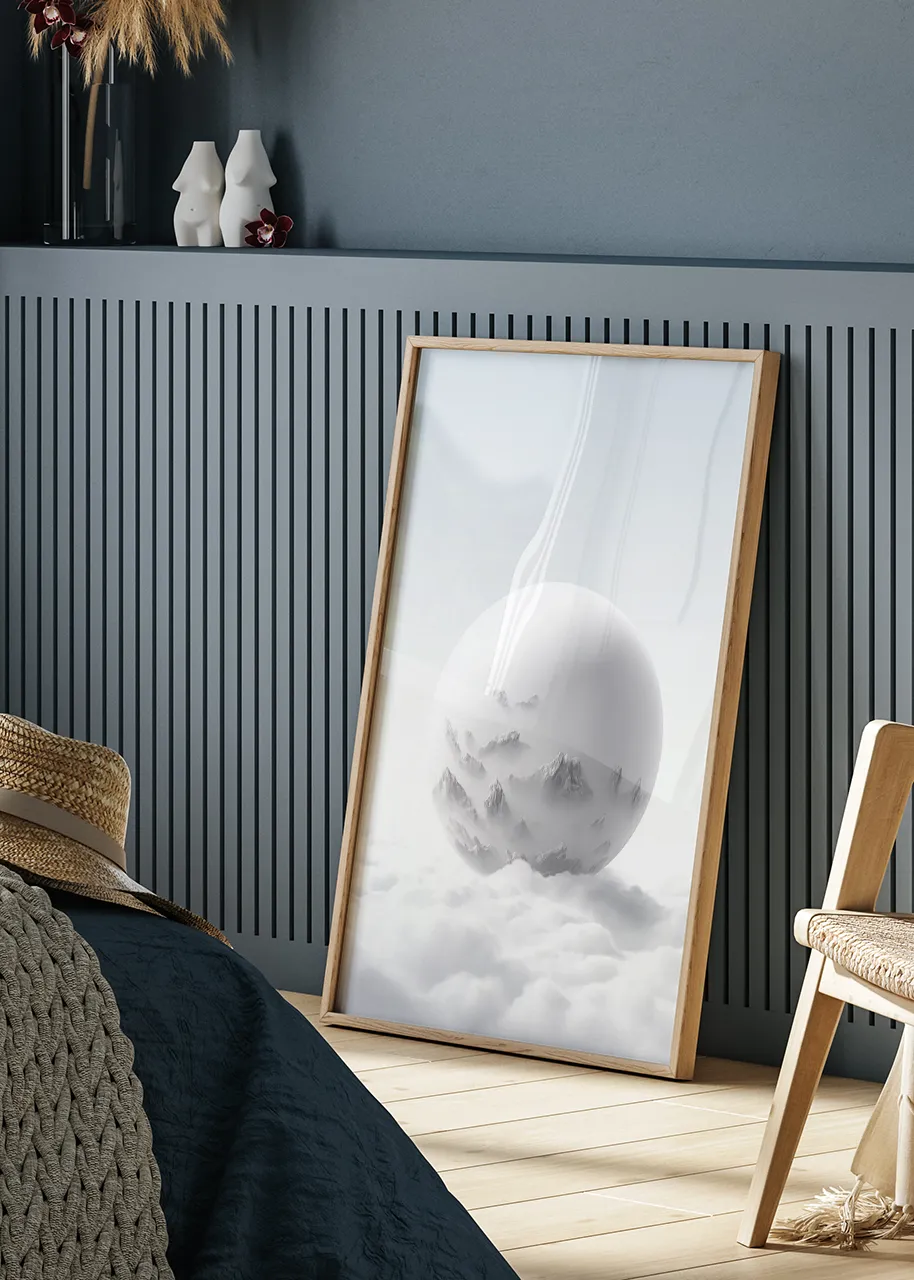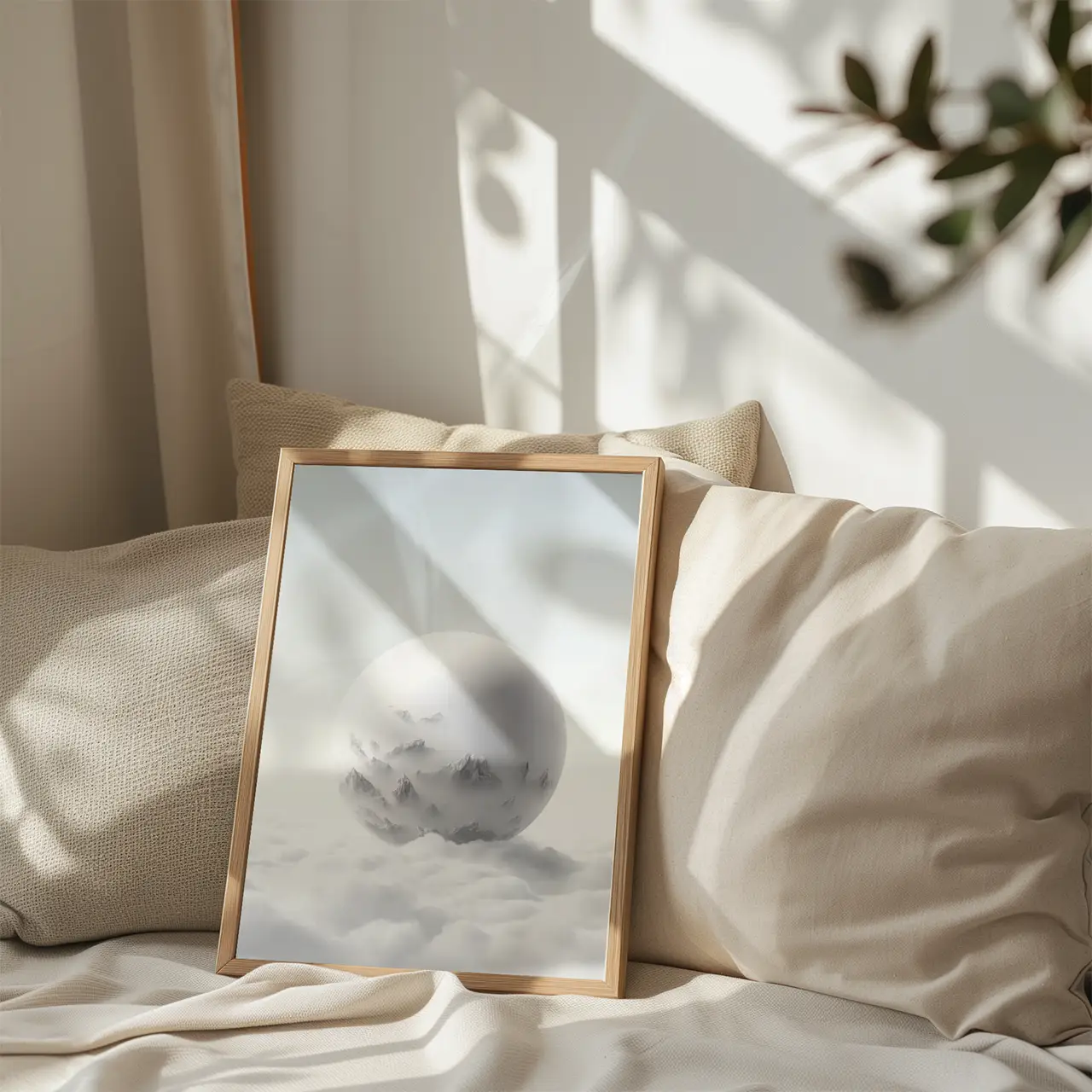 Kulista forma nadaje kompozycji wyraźny punkt skupienia. Kontrast między gładką powierzchnią a detalem górskiego reliefu buduje głębię. Miękka struktura chmur w dolnej części obrazu wprowadza równowagę i lekkość.