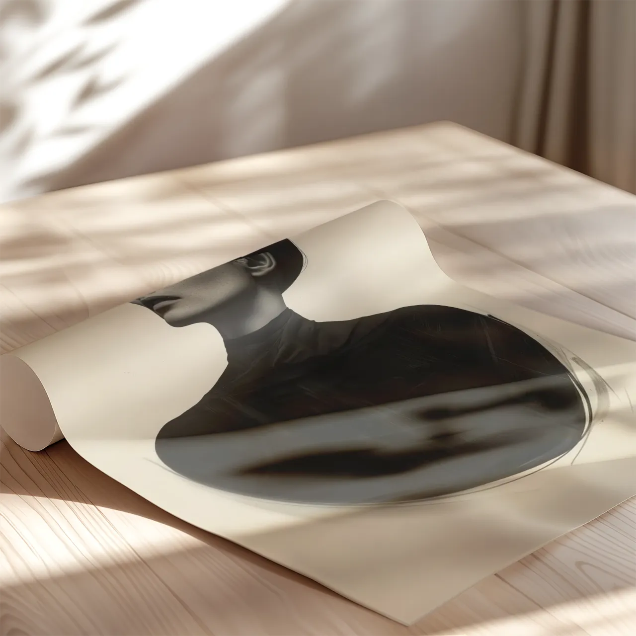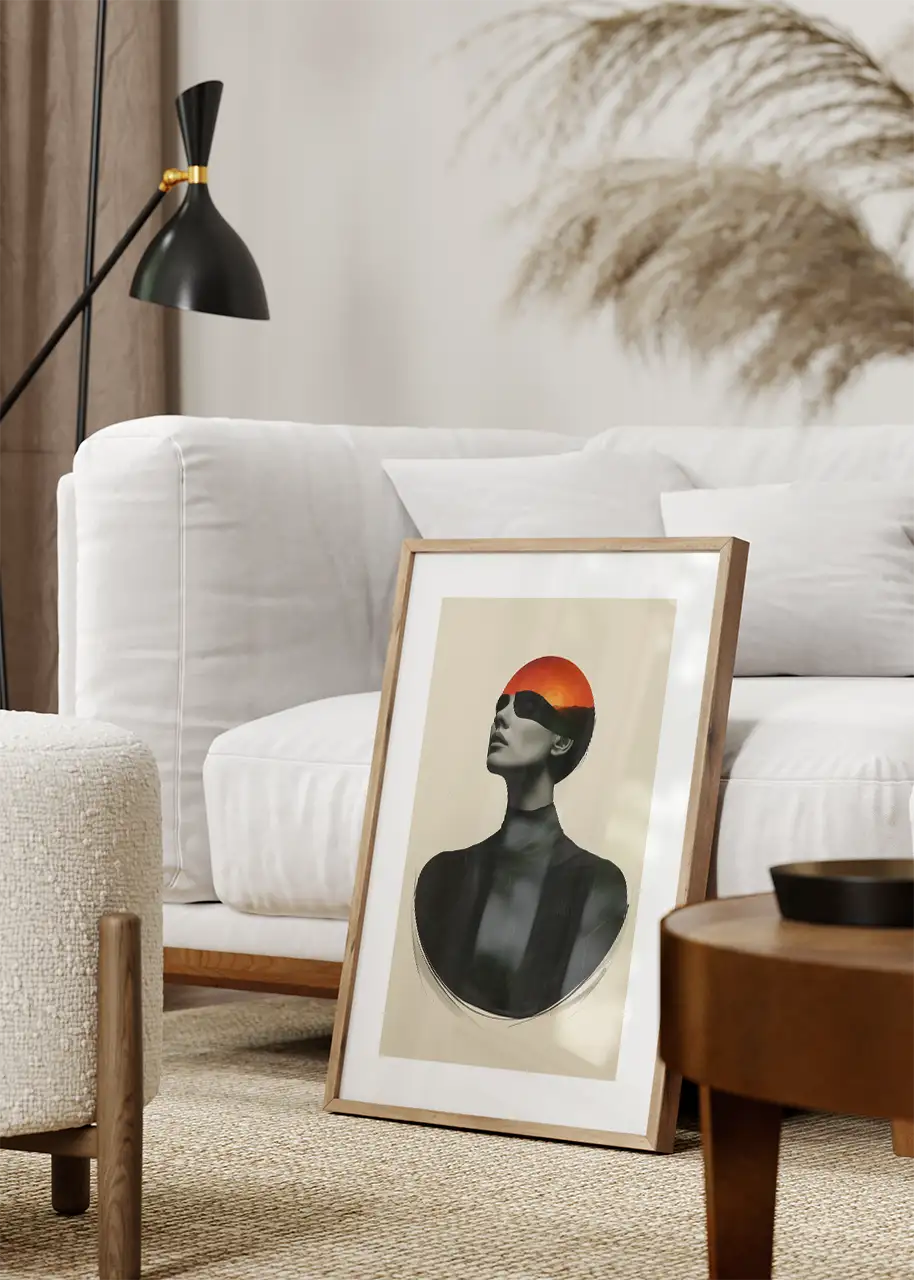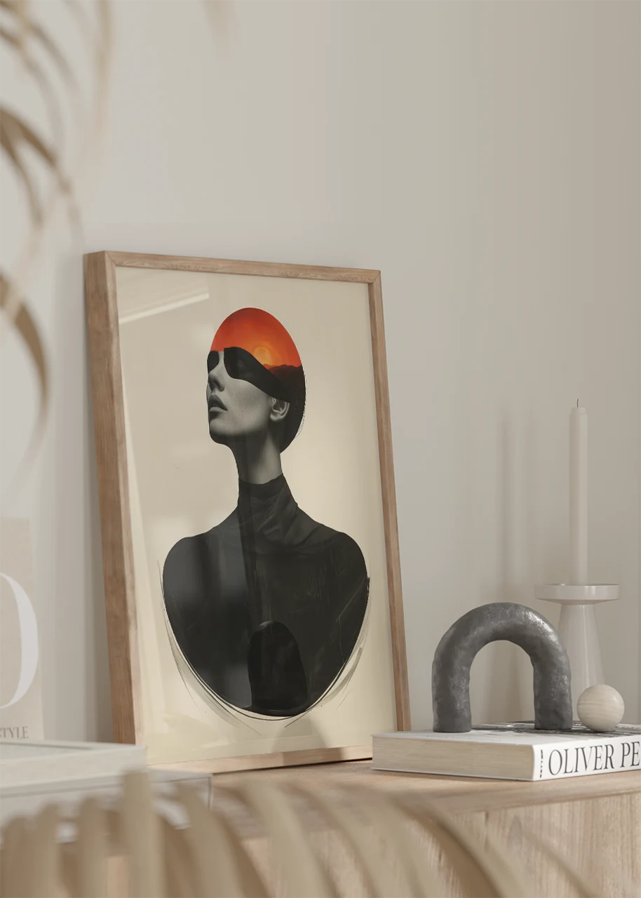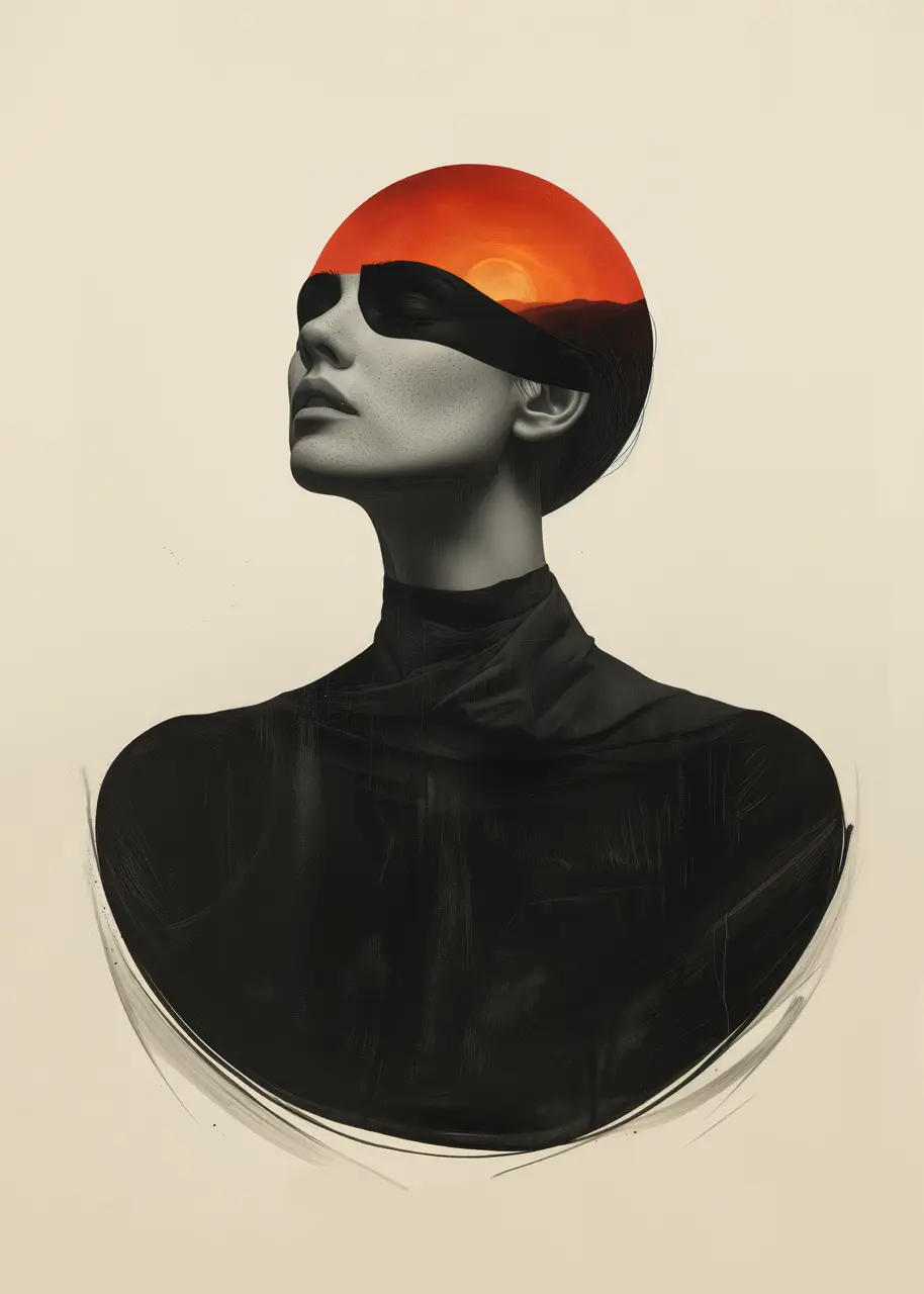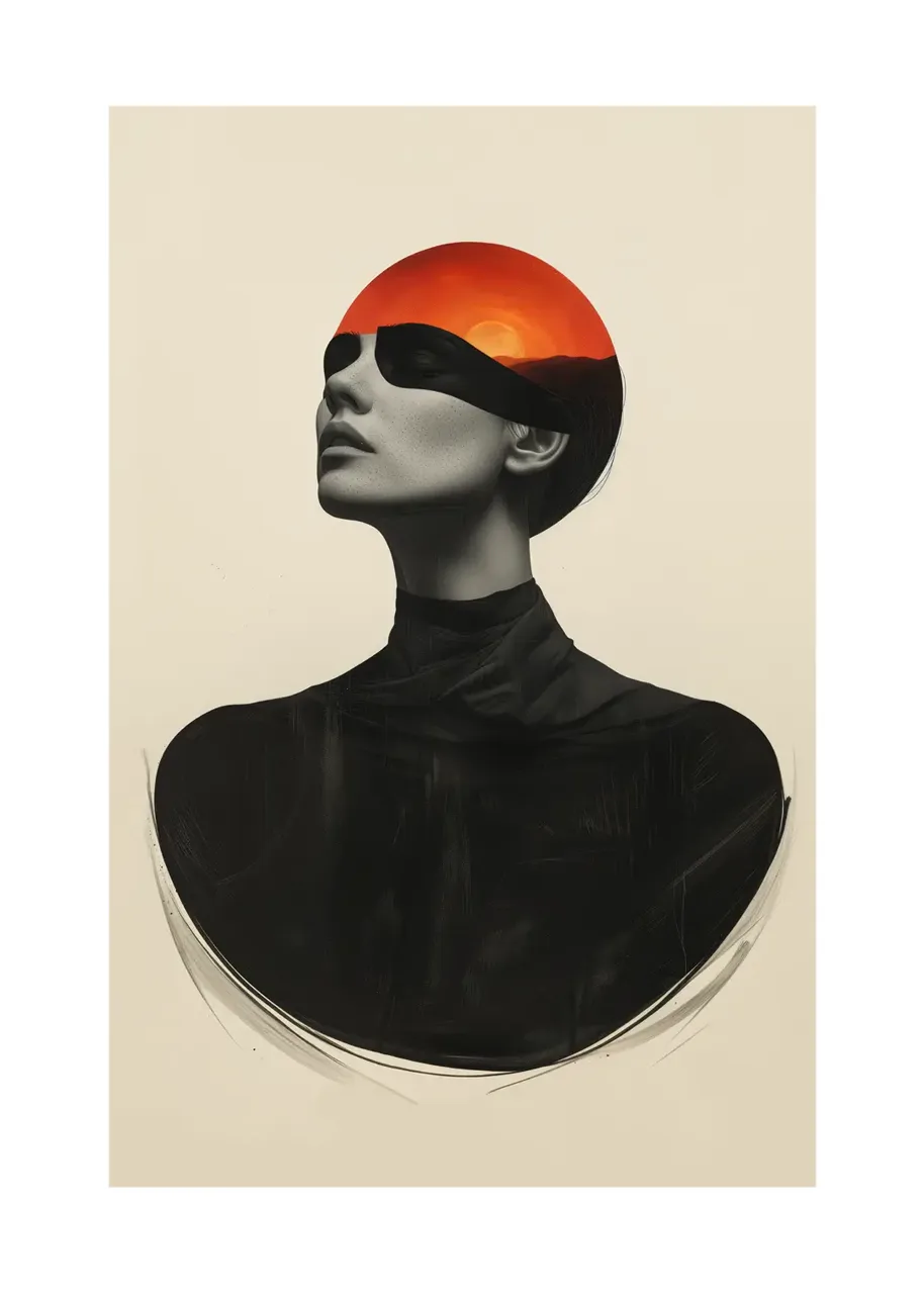 Geometryczna forma zachodu słońca przecinająca linię oczu nadaje grafice abstrakcyjnego charakteru. Minimalistyczne tło podkreśla wyraz twarzy oraz elegancką, smukłą sylwetkę. Całość tworzy nowoczesny plakat artystyczny o wyraźnej, uporządkowanej kompozycji.