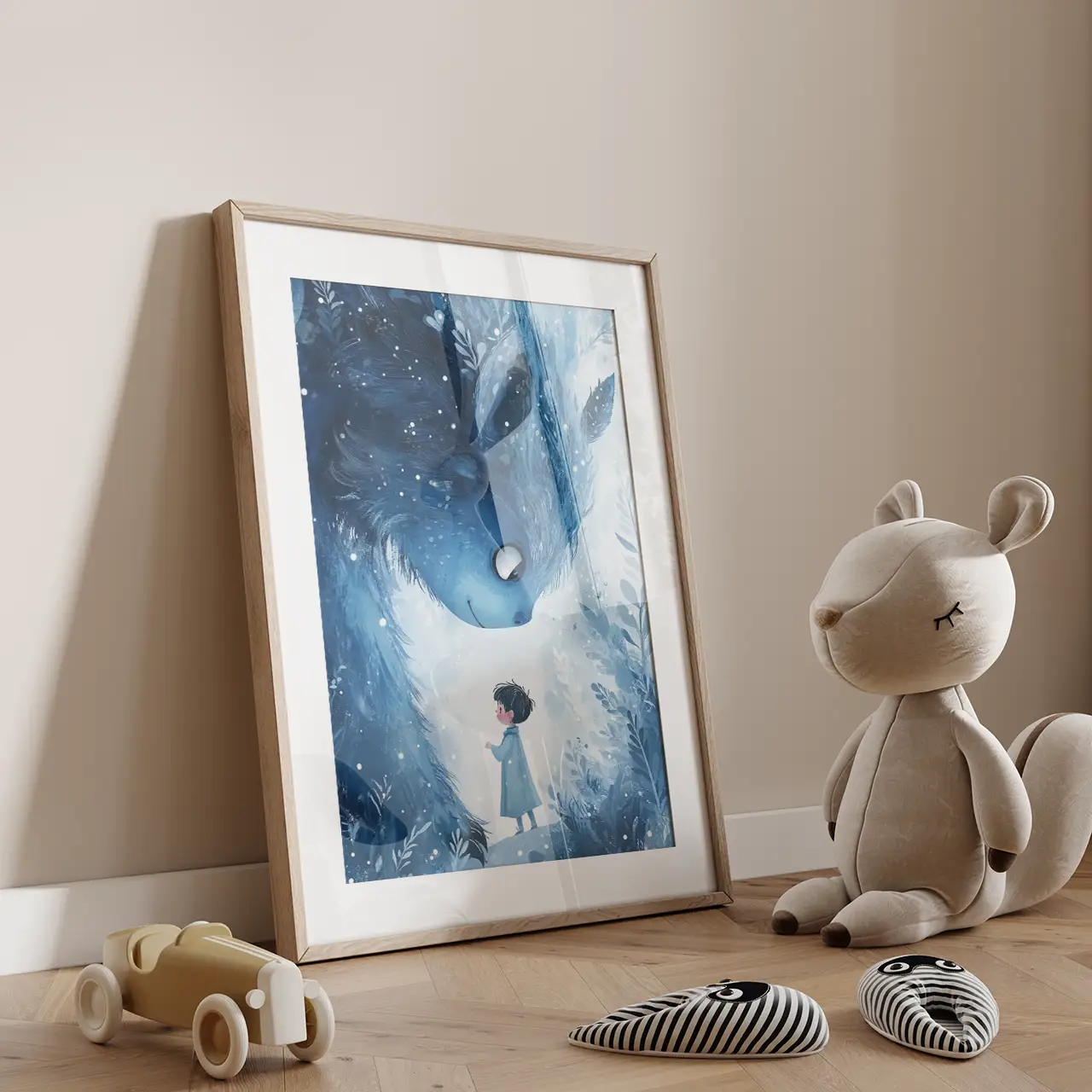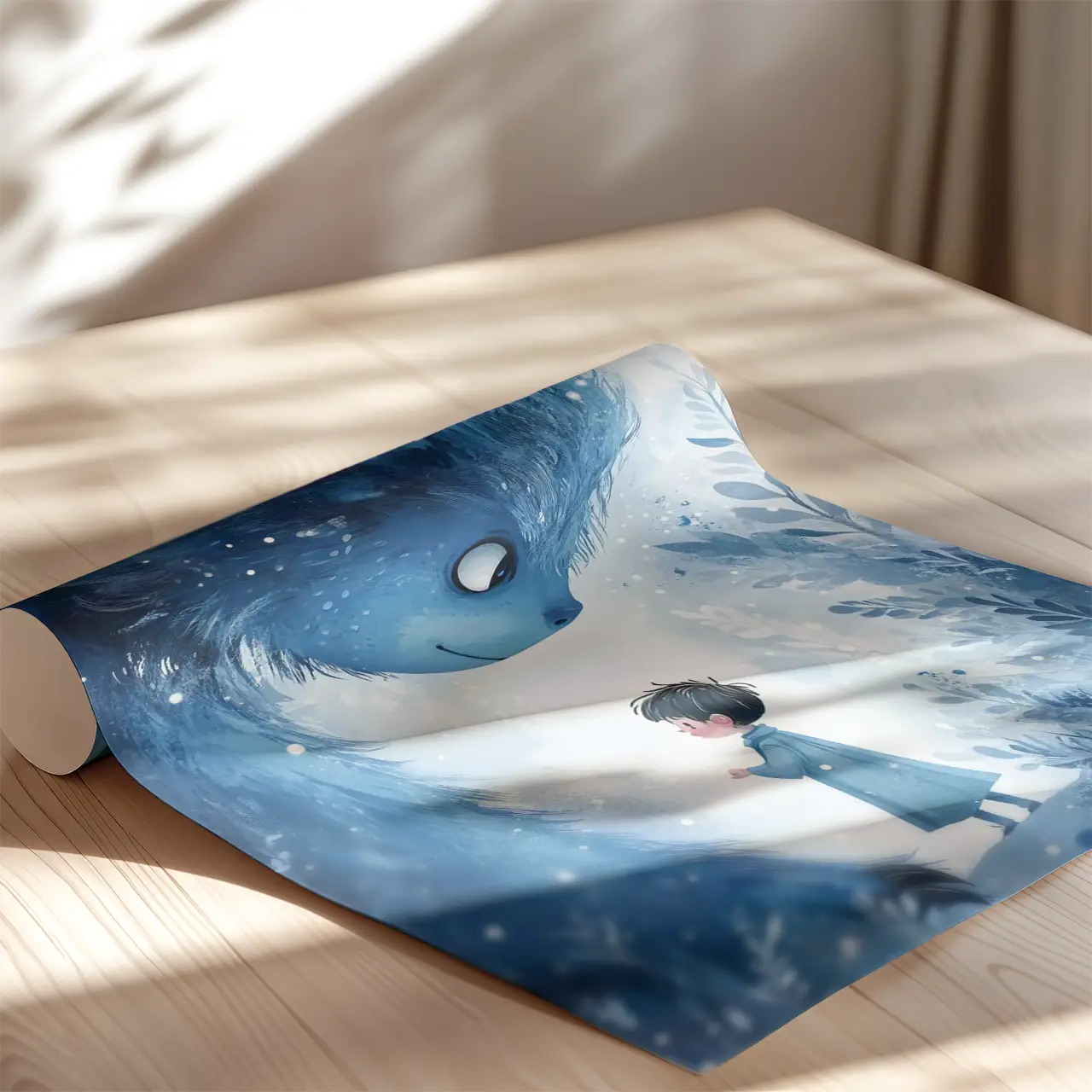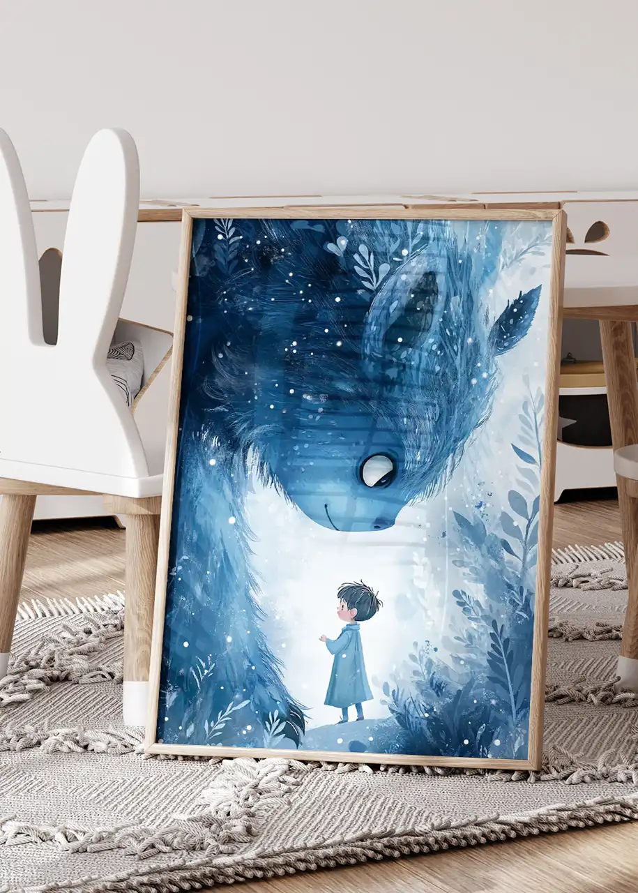 Wyjątkowa dekoracja do pokoju chłopca, który kocha magiczne i baśniowe klimaty. Na plakacie widnieje sympatyczny, błękitny stworek z wielkimi oczami, który stoi w tajemniczym, zimowym lesie. Jego przyjazny wyraz twarzy wzbudza ciepłe emocje, a bajkowa sceneria pobudza dziecięcą wyobraźnię. To doskonały plakat dla dzieci, który nie tylko ozdobi pokój Twojej pociechy, ale także stworzy przytulną atmosferę sprzyjającą marzeniom i zasypianiu. Wydrukowany na wysokiej jakości papierze, będzie pięknym i trwałym akcentem w każdym wnętrzu.