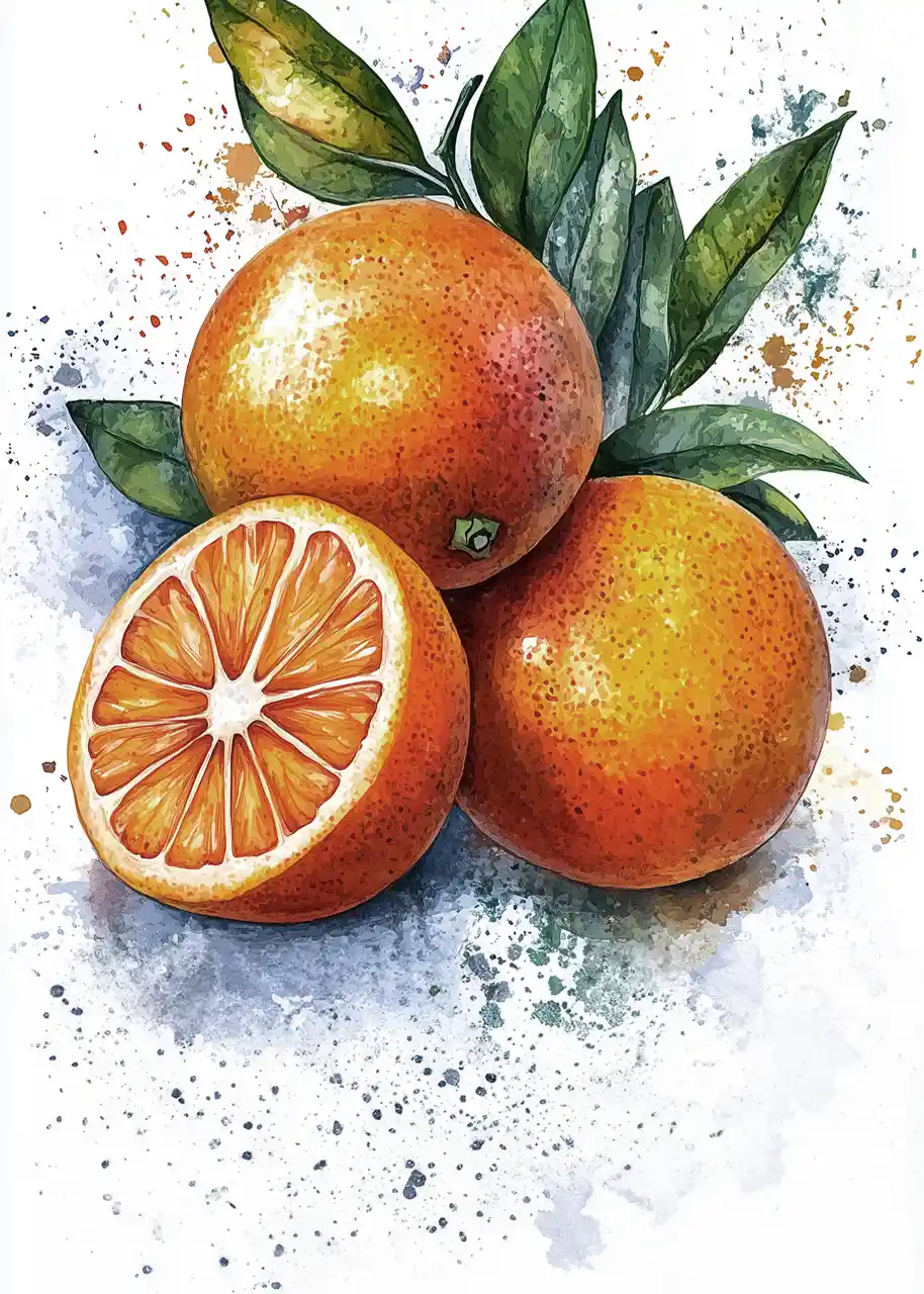 Centralna kompozycja z trzema owocami tworzy harmonijną i wyważoną scenę. Przekrojona pomarańcza dodaje ilustracji dynamiki oraz podkreśla soczysty charakter kompozycji.