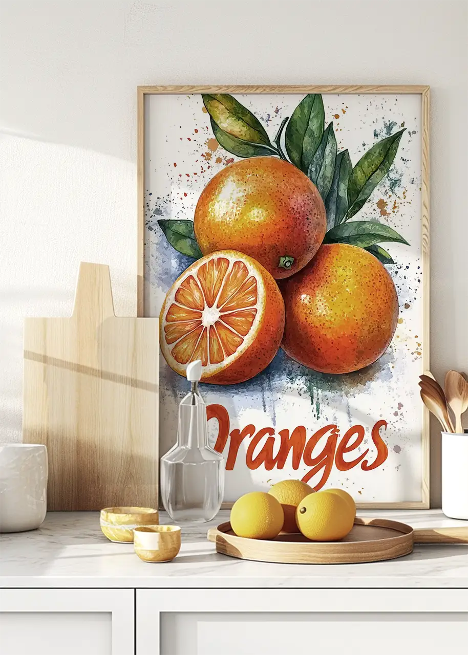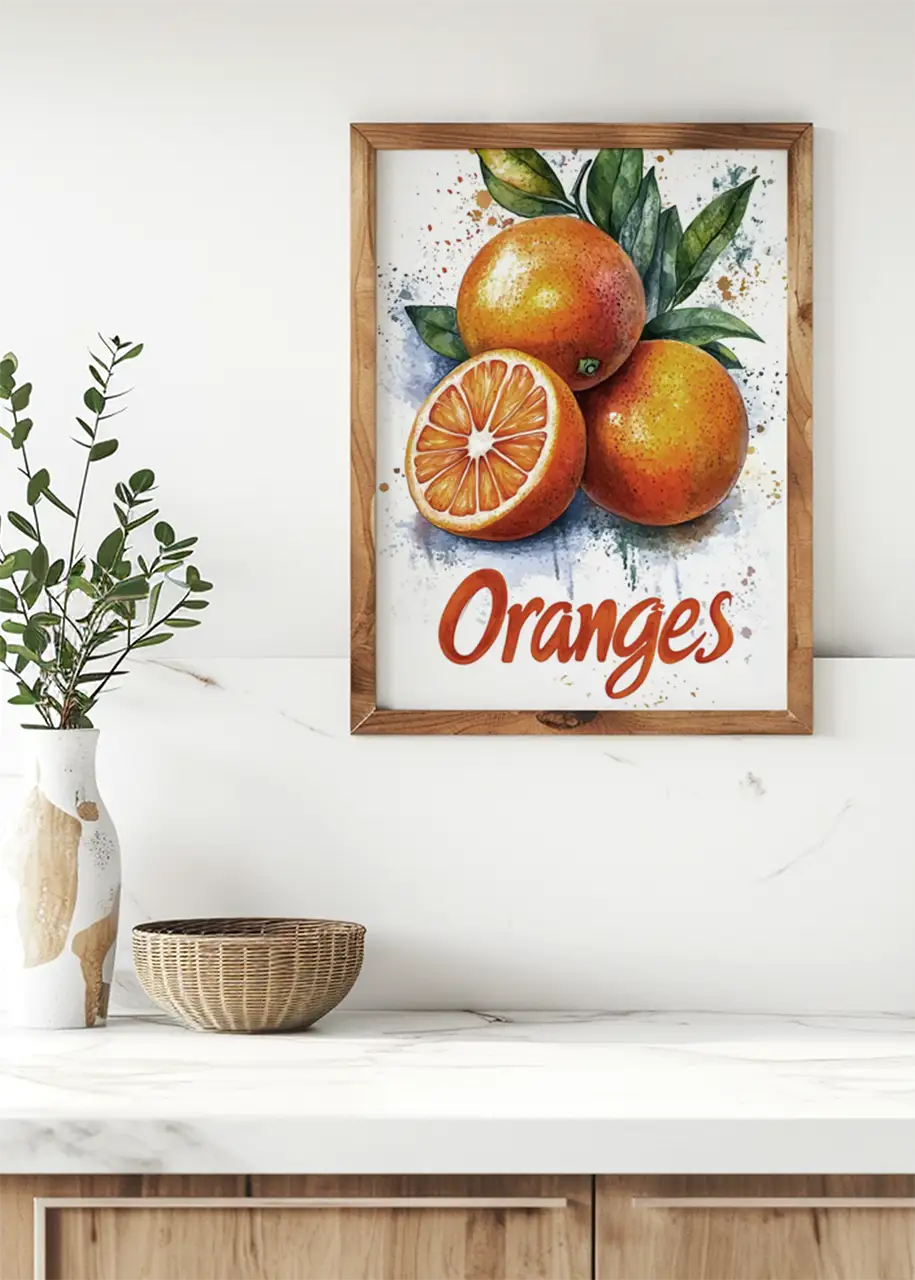 Plakat „Oranges III” przedstawia artystyczną ilustrację pomarańczy wykonaną w malarskim stylu akwareli. Kompozycja ukazuje trzy owoce – dwie całe pomarańcze oraz jedną przekrojoną, która odsłania charakterystyczny układ soczystych segmentów.