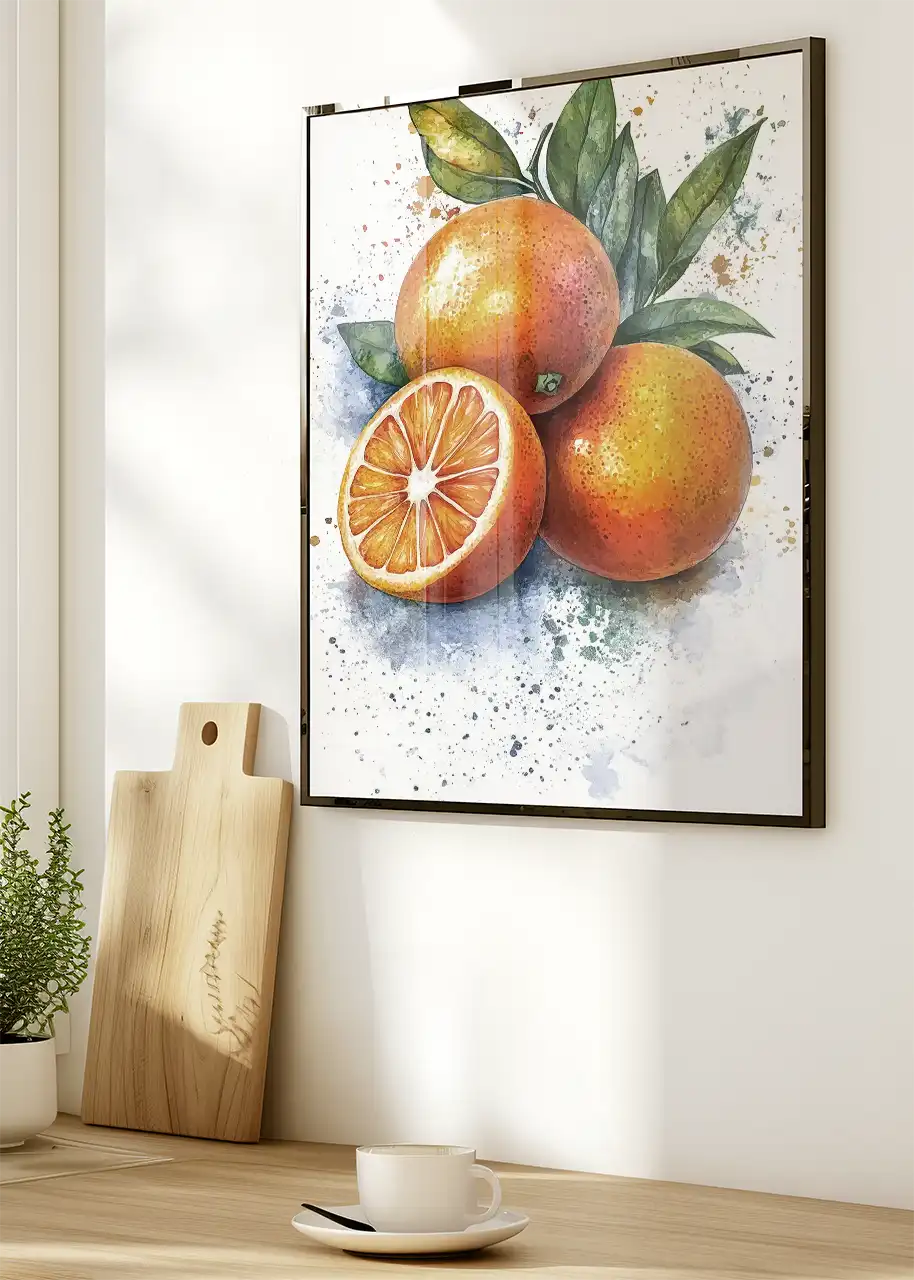 Plakat doskonale sprawdzi się jako dekoracja ścienna w kuchni, jadalni, restauracji lub kawiarni. Motyw cytrusów wprowadza do wnętrza świeżość i naturalną energię.