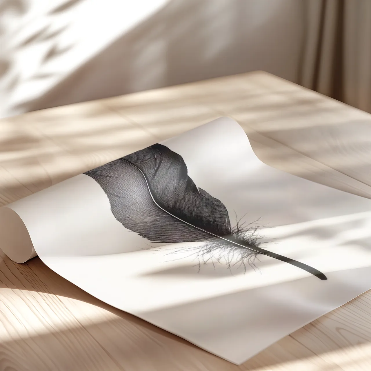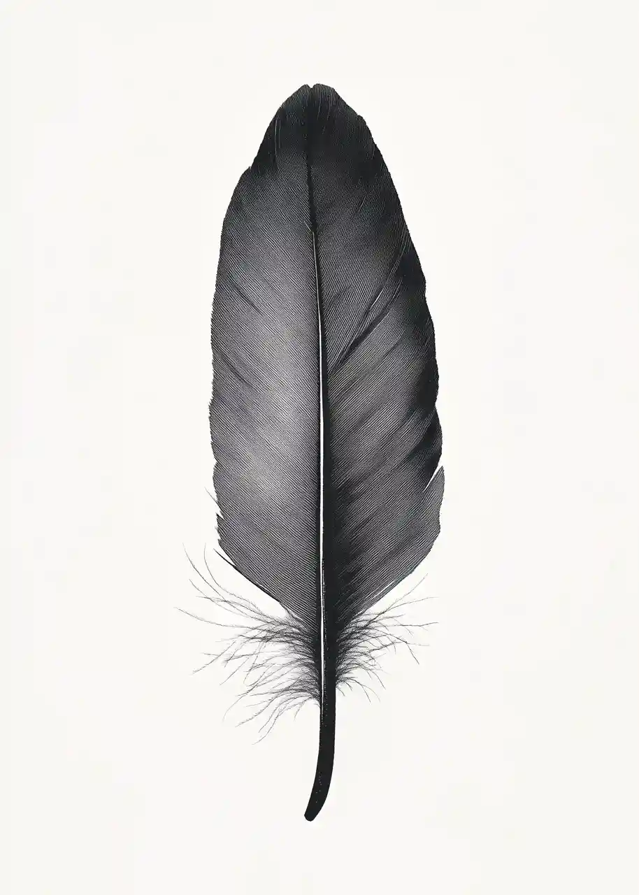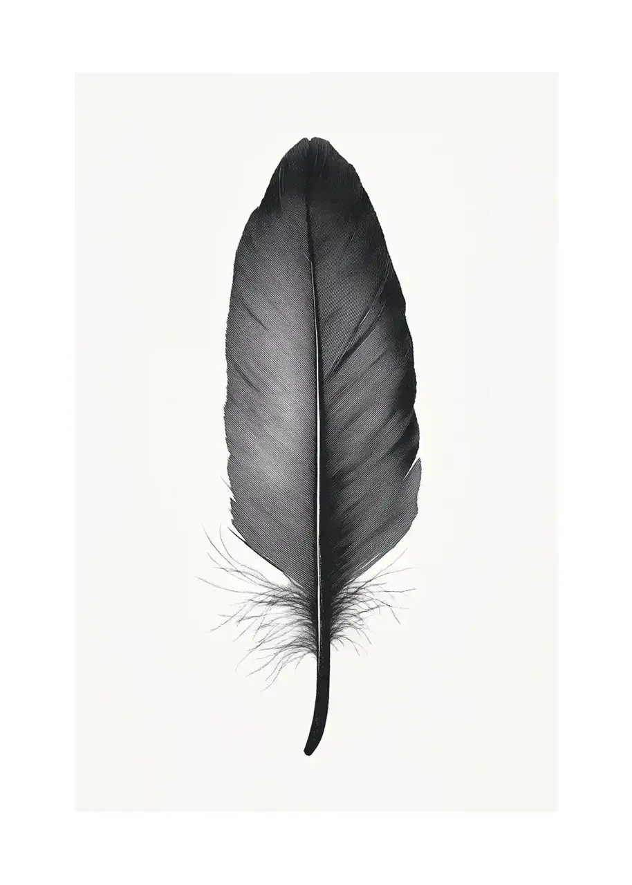 Motyw pióra został przedstawiony w sposób uporządkowany, z wyraźną osią symetrii i czytelną strukturą. Subtelne rozproszenie dolnej części pióra wprowadza lekki, organiczny akcent.
