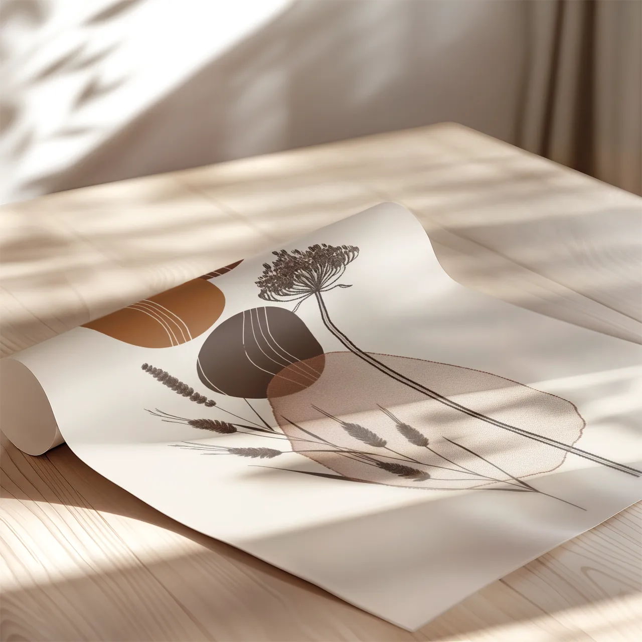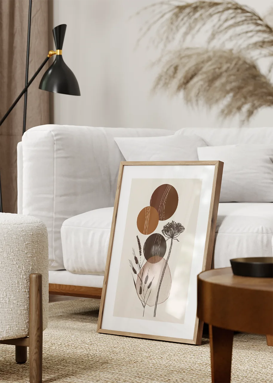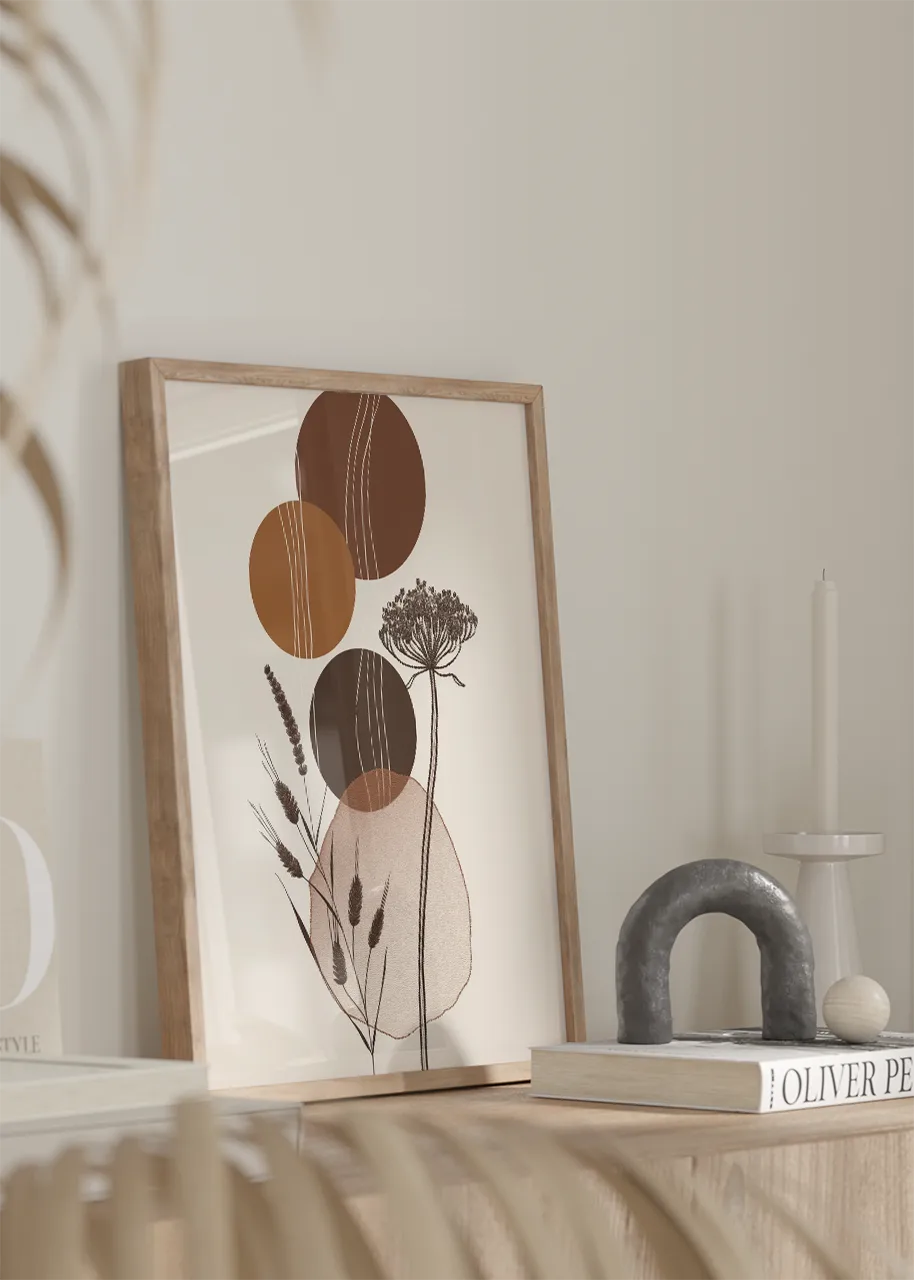 Plakat działa jako spokojny, naturalny akcent wizualny. Wprowadza do wnętrza harmonię i subtelną elegancję inspirowaną naturą.