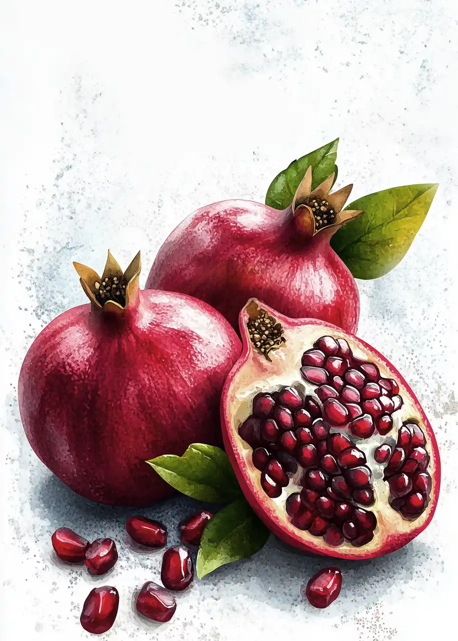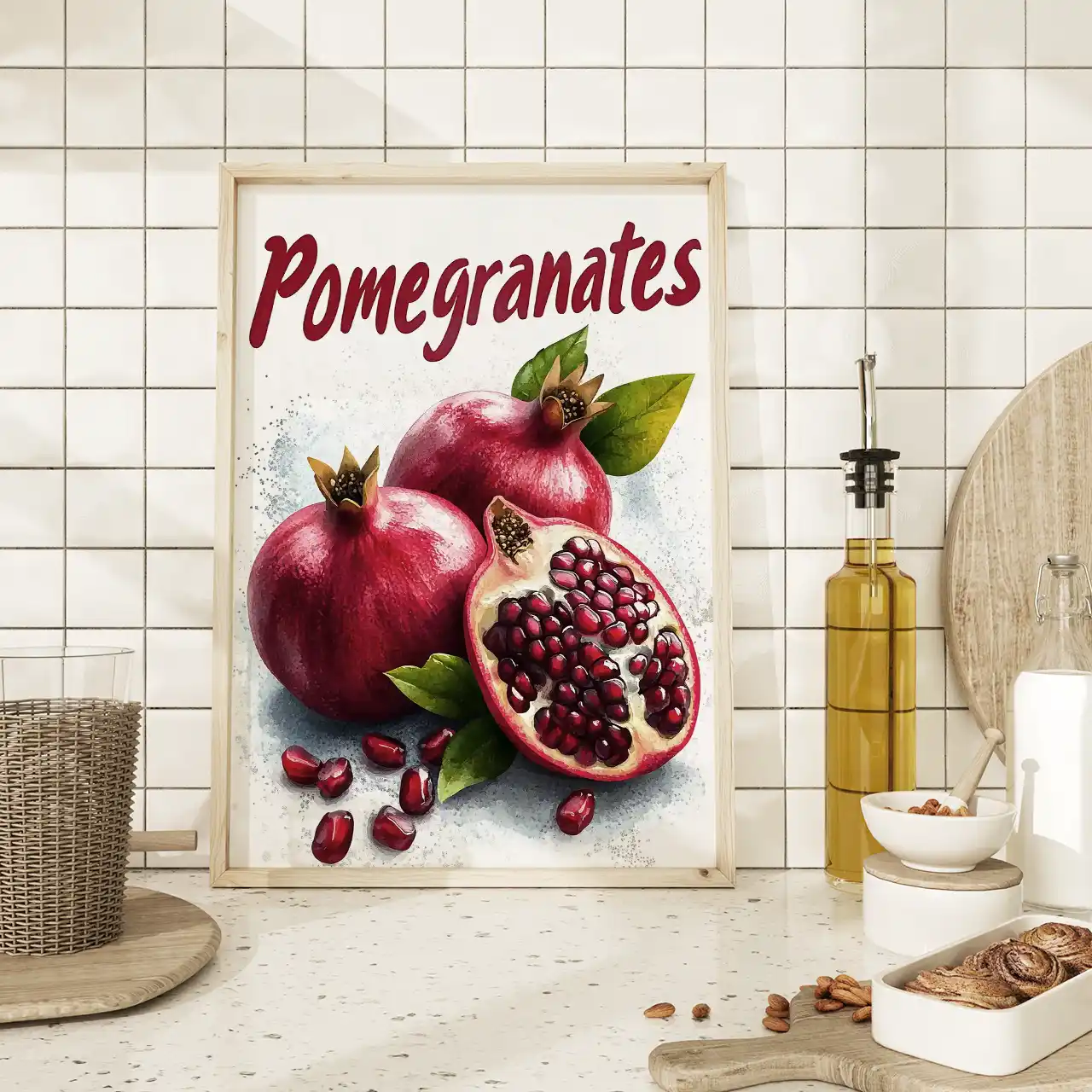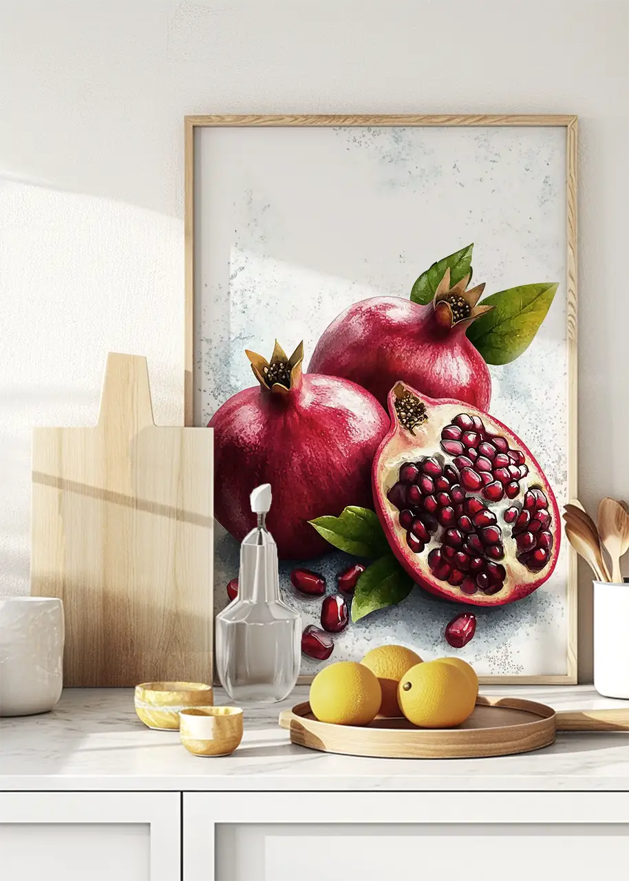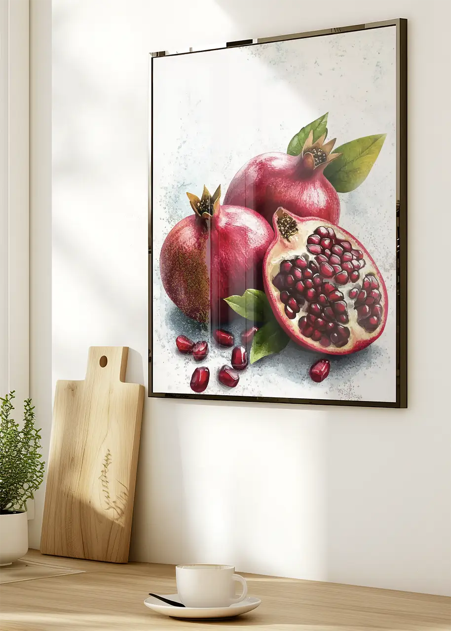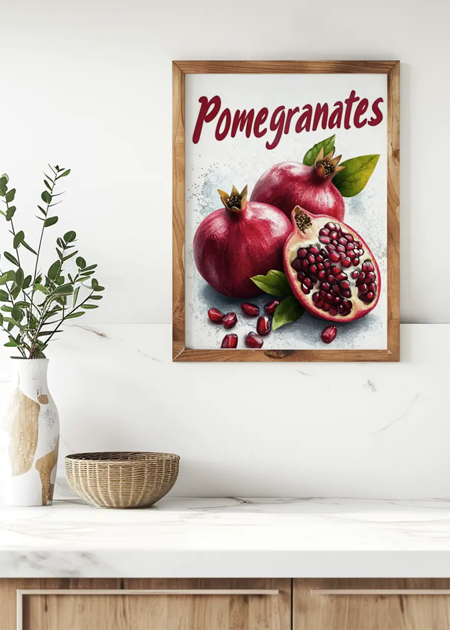 Plakat „Pomegranates” przedstawia artystyczną ilustrację owoców granatu wykonaną w malarskim stylu akwareli. Kompozycja ukazuje dwa całe owoce oraz jeden przekrojony granat z charakterystycznymi, błyszczącymi pestkami.