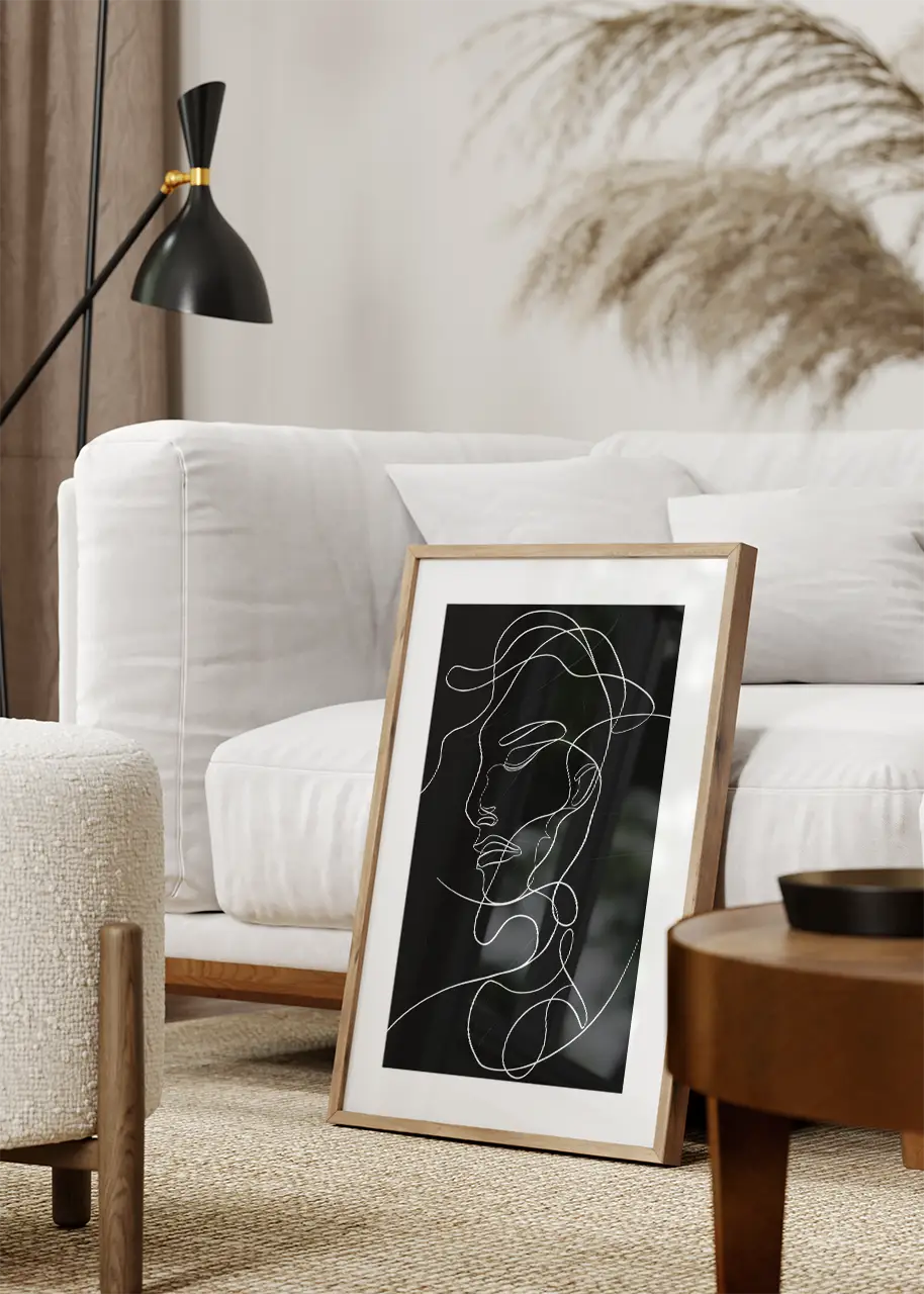 Plakat działa jako wyrazisty, kontrastowy akcent. Przyciąga uwagę prostą, płynną linią i mocnym tłem, wprowadzając do wnętrza uporządkowaną, spokojną estetykę z nutą ekspresji.