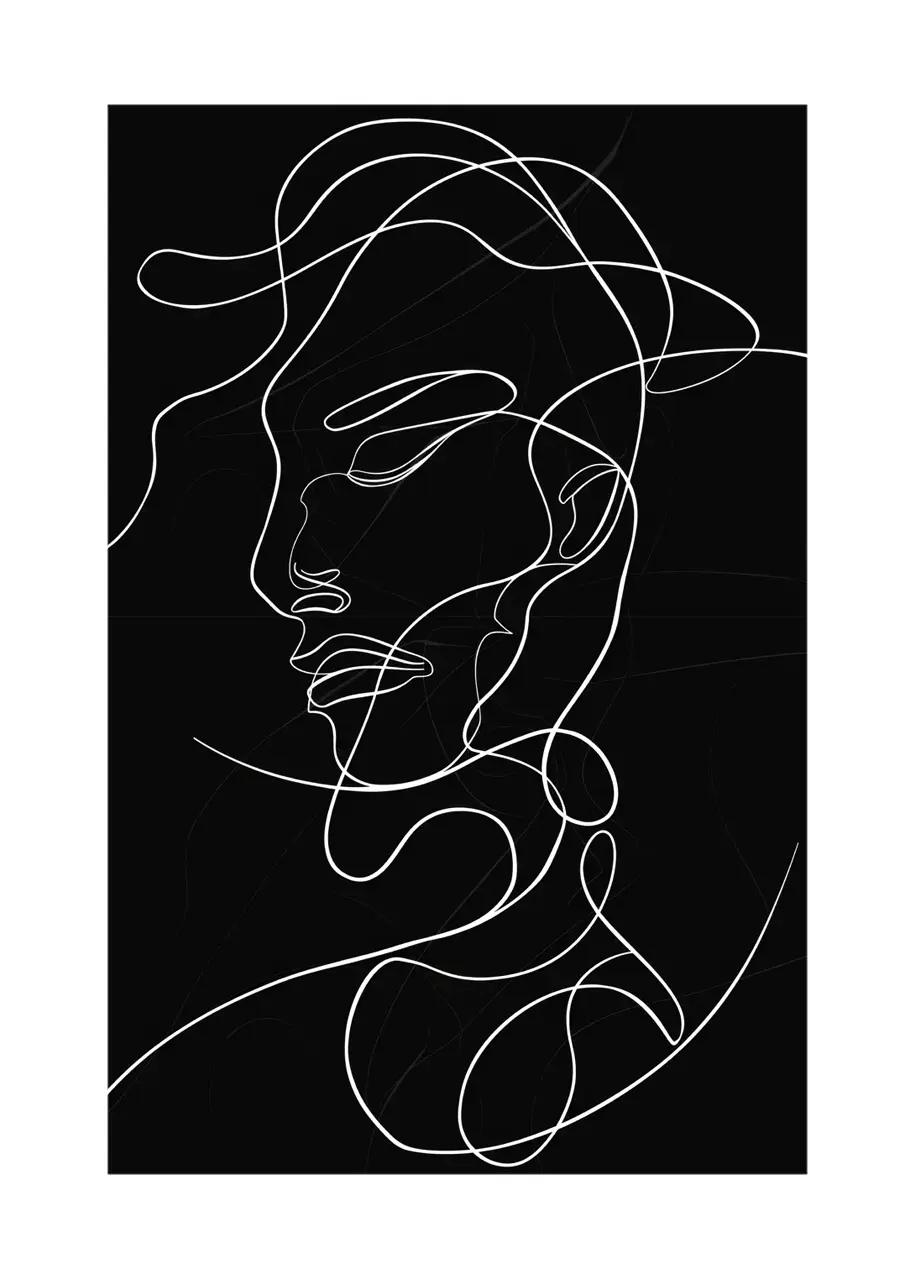 Centralnym motywem jest kobiecy portret ukazany w profilu, zbudowany z jednej, nieprzerwanej linii. Rysy twarzy są jedynie zasugerowane – linia swobodnie przechodzi przez czoło, nos, usta i szyję, tworząc płynną, organiczną formę.