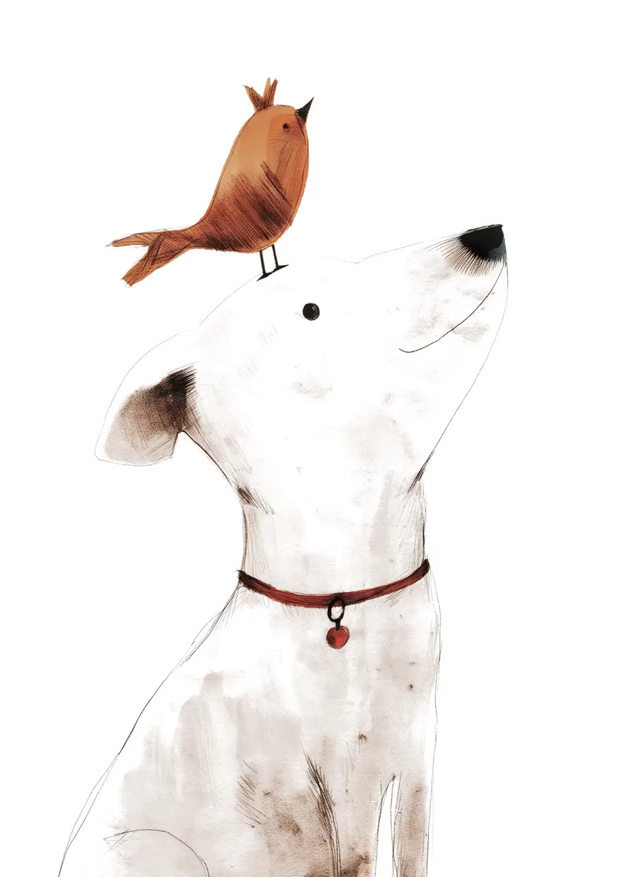 Centralną część grafiki zajmuje postać pieska zwróconego ku górze, na którego głowie siedzi mały ptak. Kompozycja jest prosta i przejrzysta, co sprawia, że ilustracja jest czytelna i przyjemna wizualnie.