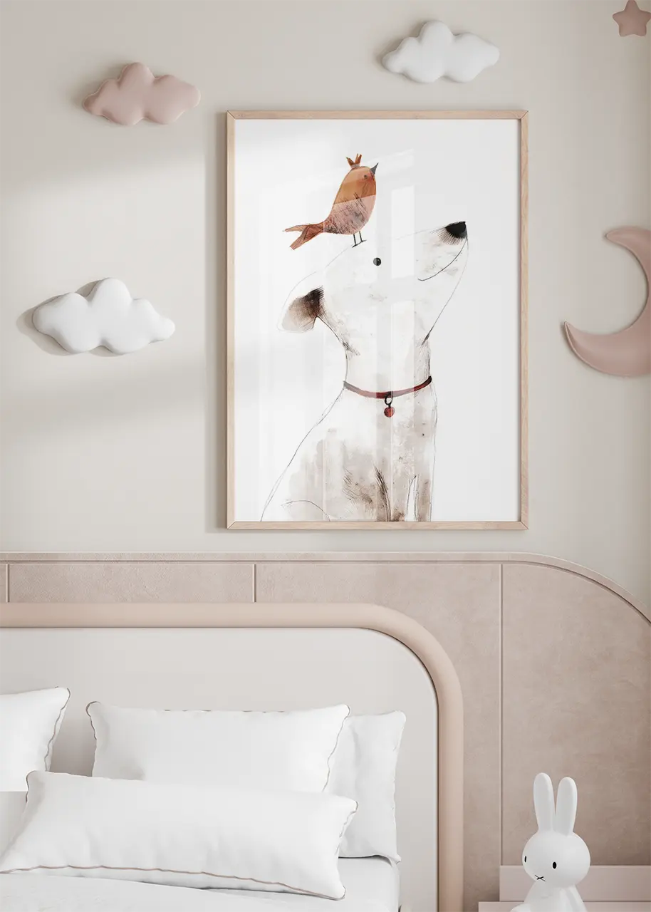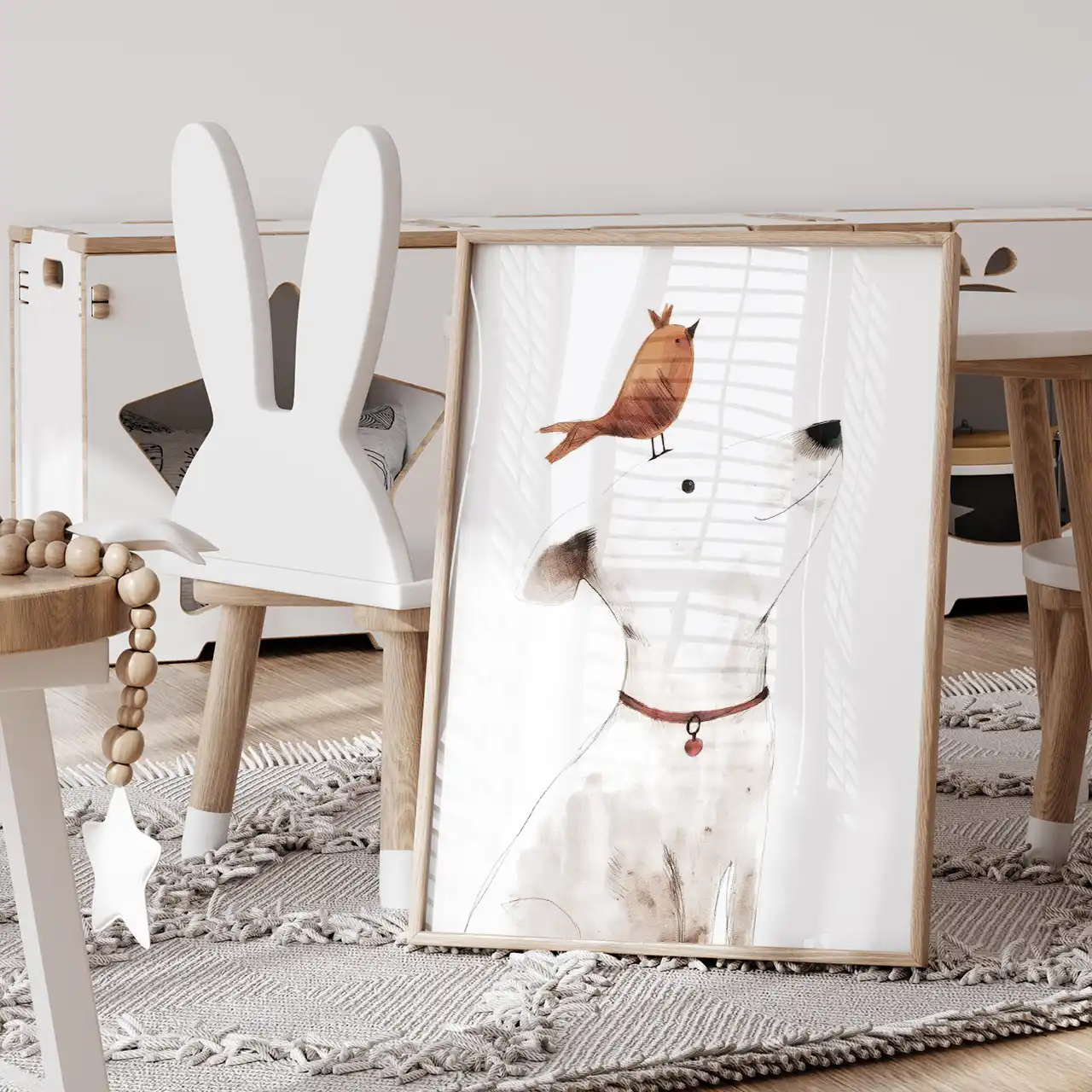Plakat „Razem lepiej I” przedstawia subtelną ilustrację przedstawiającą spokojnego pieska oraz małego ptaszka siedzącego na jego głowie. Kompozycja ma lekki, bajkowy charakter i przywołuje skojarzenia z przyjaźnią oraz spokojem.