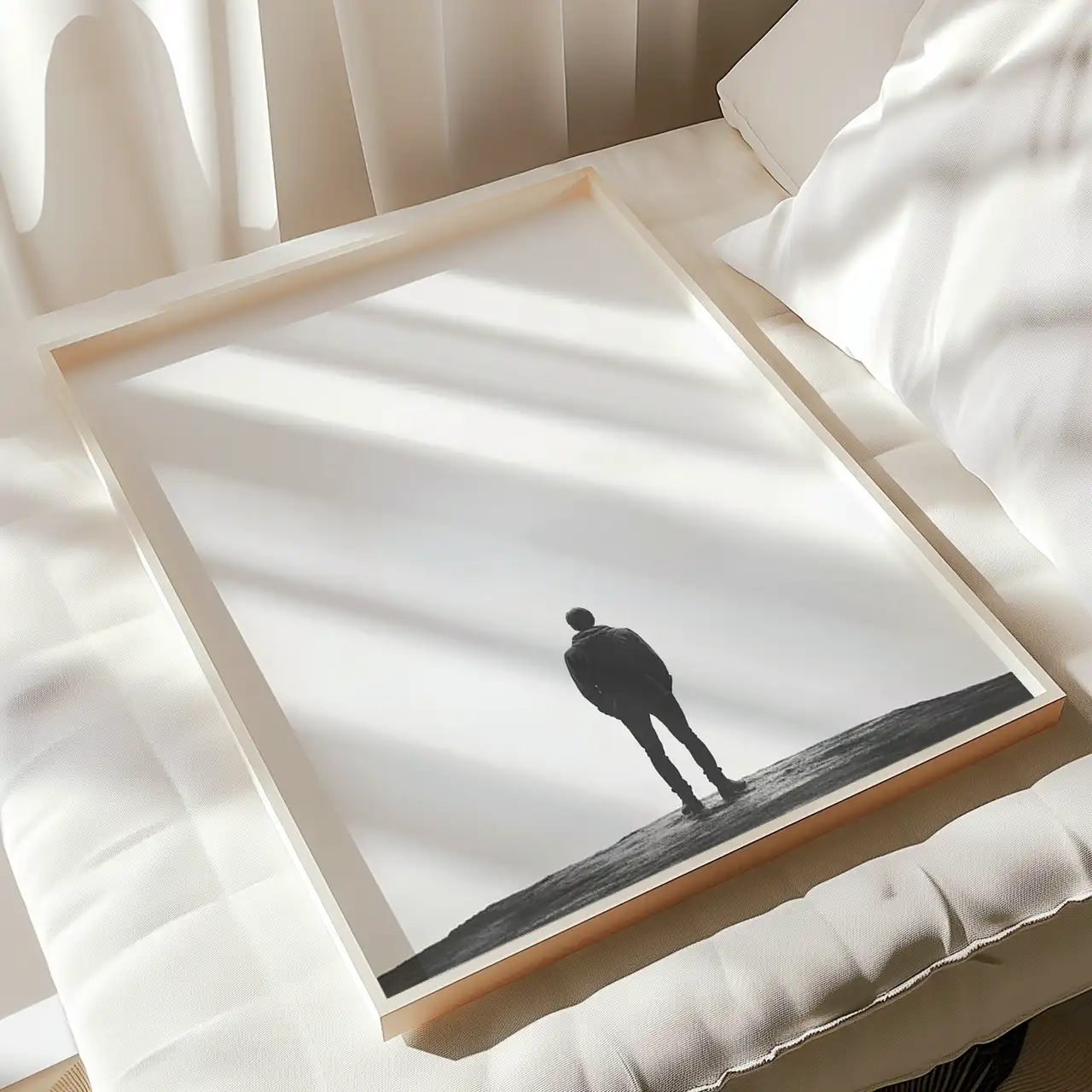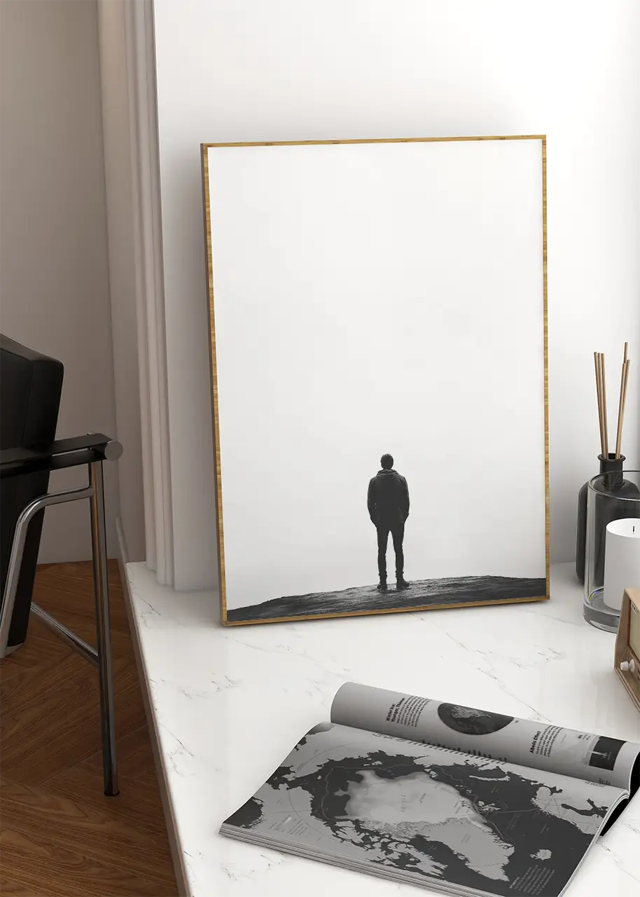 Ten plakat to propozycja dla osób, które cenią prostotę i głęboki przekaz. Grafika na ścianę przedstawia sylwetkę mężczyzny stojącego na tle nieskończonej, białej przestrzeni, co tworzy atmosferę spokoju i refleksji. Doskonale sprawdzi się jako element wystroju w nowoczesnych wnętrzach, takich jak salon, sypialnia czy biuro, dodając im minimalistycznego, ale jednocześnie wyrazistego charakteru. To uniwersalny dodatek, który łatwo dopasujesz do różnych stylów aranżacji, od skandynawskiego po industrialny, podkreślając indywidualny charakter przestrzeni. Wszystkie plakaty dostępne w naszej ofercie drukujemy na wysokiej jakości papierze, co gwarantuje trwałość i estetyczny wygląd na długie lata.