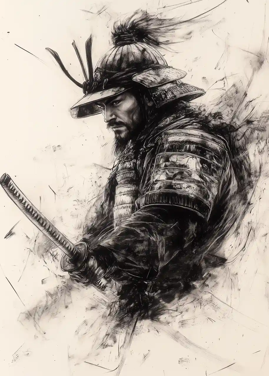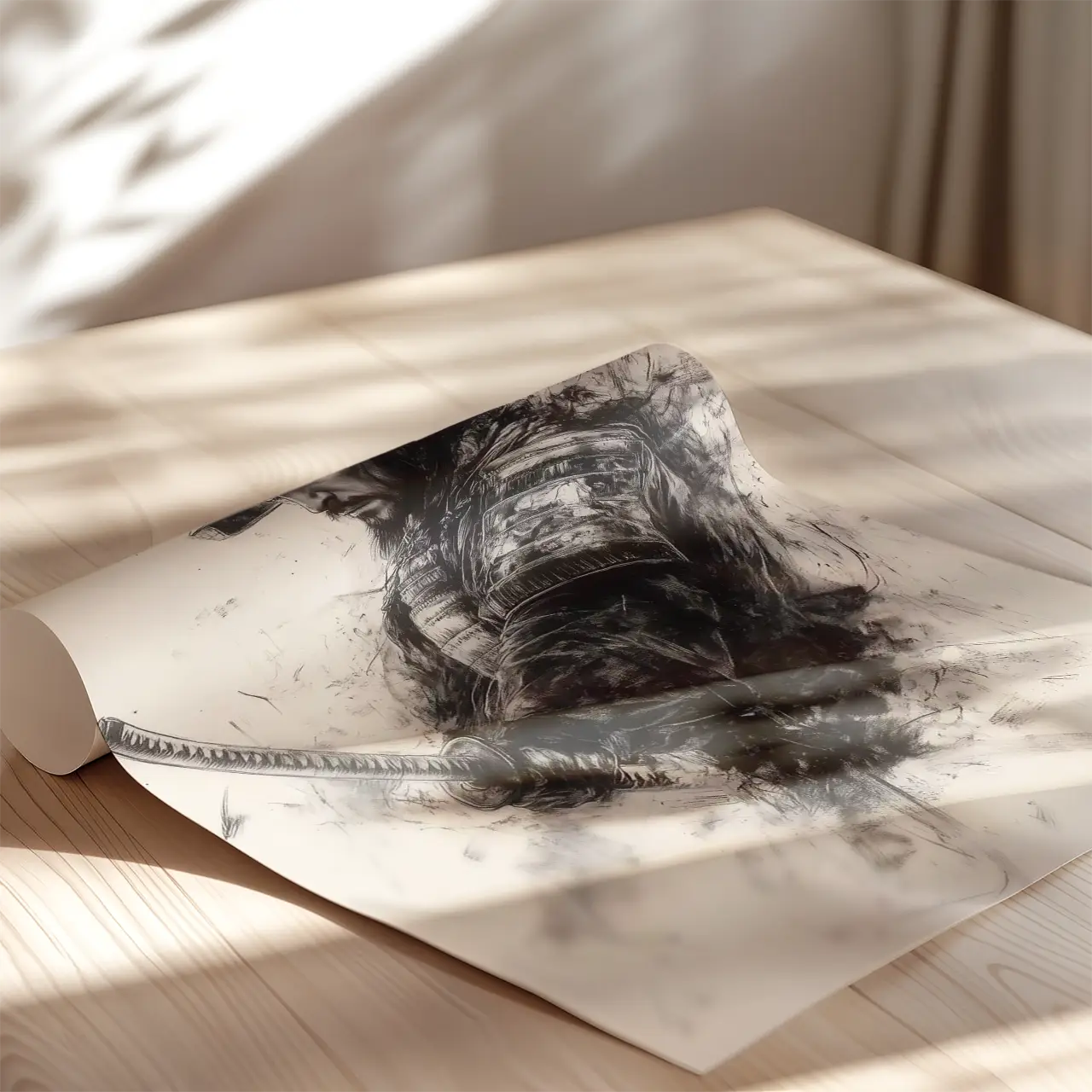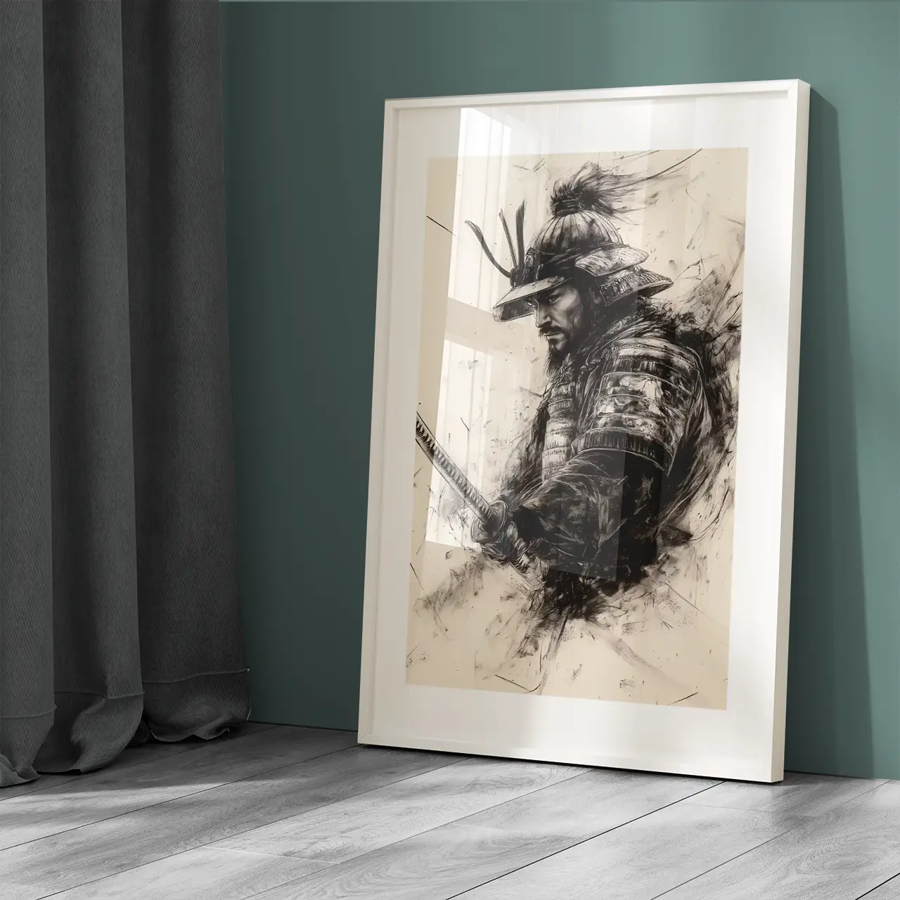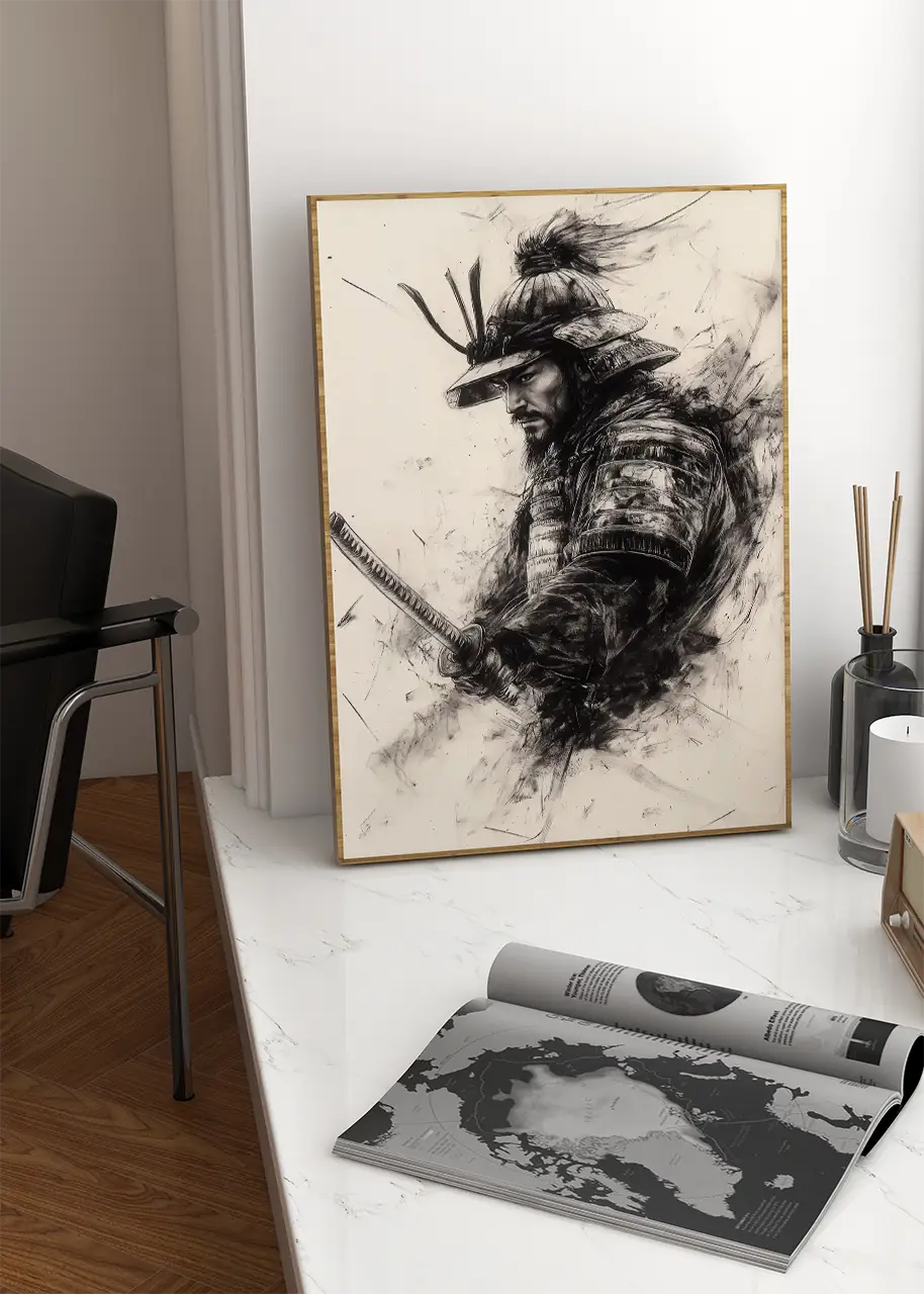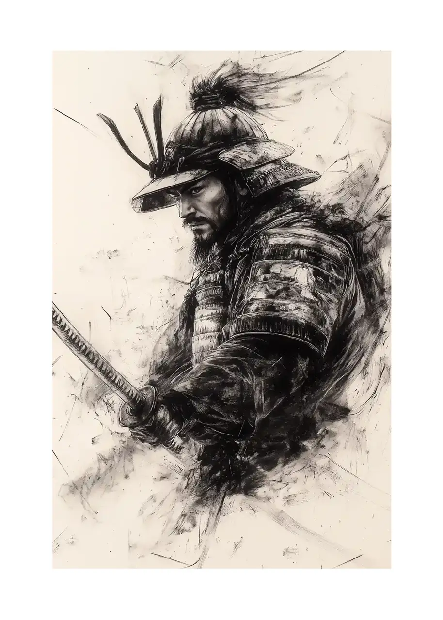 Portret japońskiego wojownika w pełnym skupienia momencie tuż przed walką na śmierć i życie. Postać samuraja, odzianego w tradycyjną, bogato zdobioną zbroję oraz charakterystyczny hełm, została przedstawiona w formie wyrazistego, pełnego energii rysunku. Dynamiczne linie oraz mocne kontrasty podkreślają determinację i honor, będące kwintesencją samurajskiej filozofii życia. Całość jest utrzymana w stonowanej kolorystyce ze zdecydowaną przewagą ołówkowej czerni, dzięki czemu doskonale komponuje się zarówno z nowoczesnymi, jak i tradycyjnymi wnętrzami. Ten oryginalny plakat z samurajem przypadnie do gustu osobom ceniącym sztukę, historię oraz fascynującą kulturę Dalekiego Wschodu i z pewnością odmieni każde wnętrze.