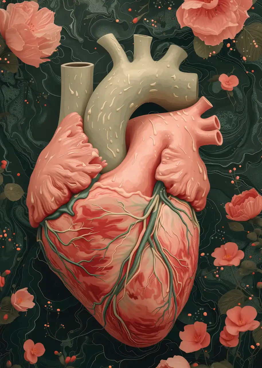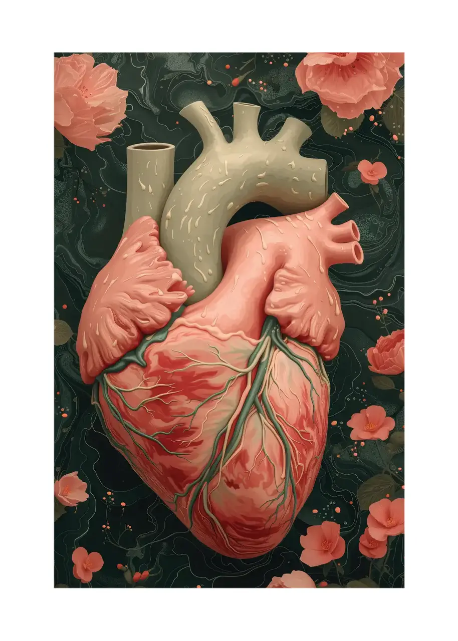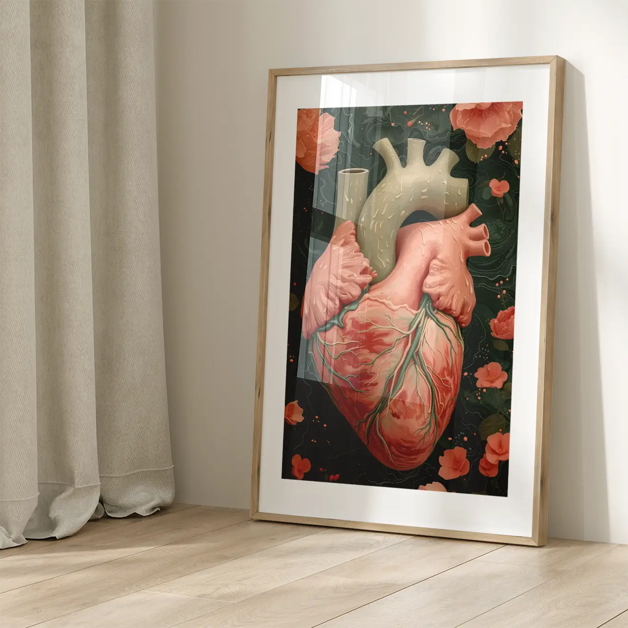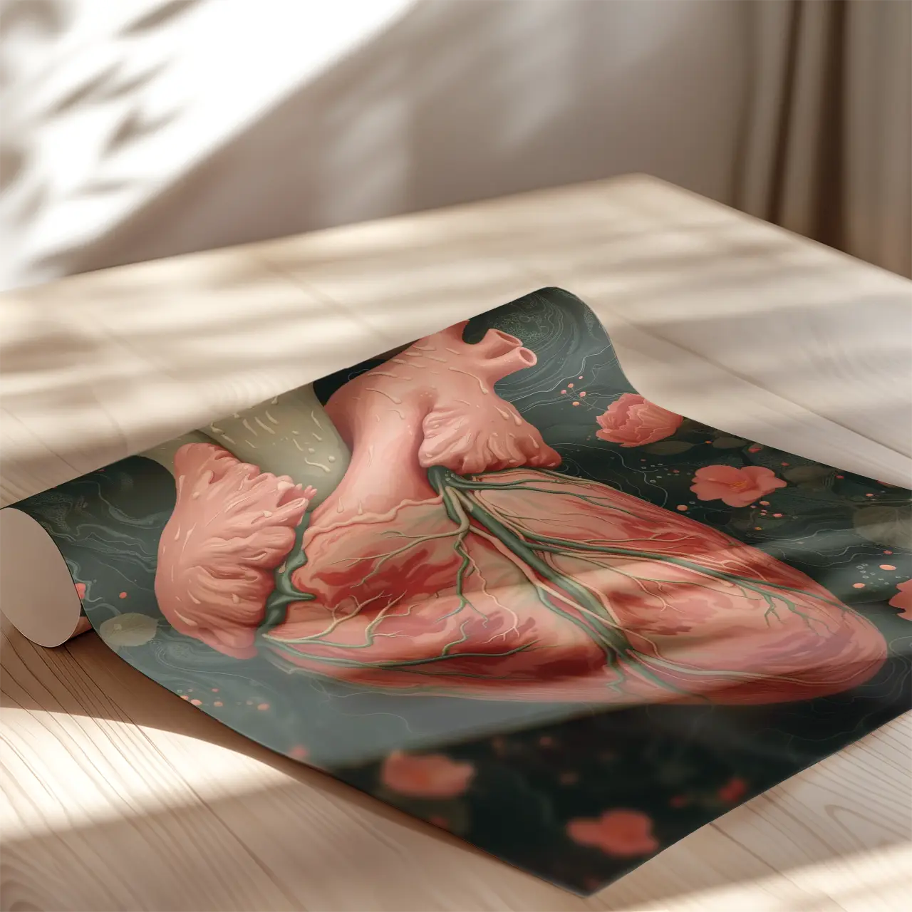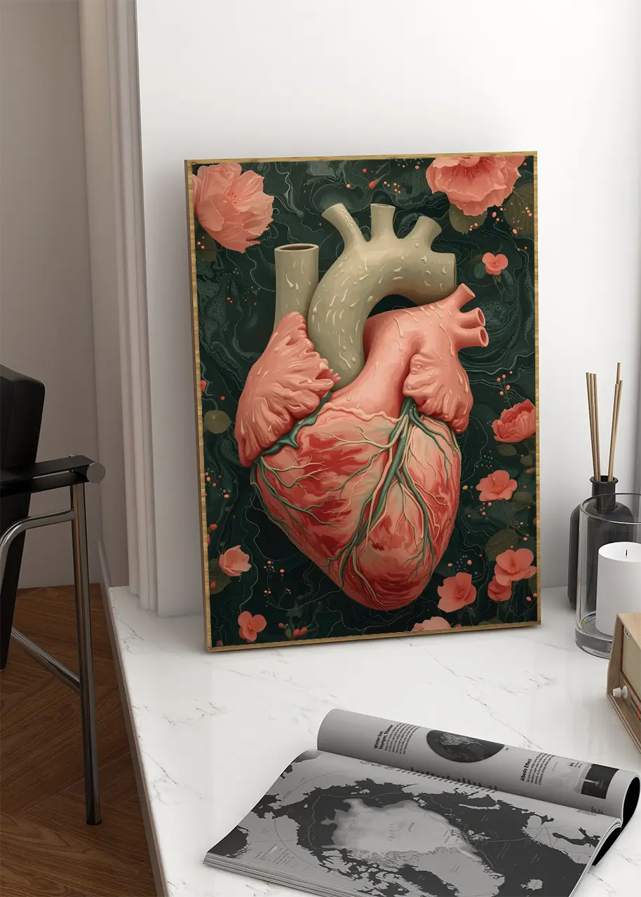 Realistyczne ludzie serce w artystycznej, eleganckiej odsłonie. W centrum tego niebanalnego plakatu znajduje się precyzyjnie zilustrowany organ w delikatnych odcieniach pastelowej czerwieni i pudrowego różu, przepleciony cienkimi żyłkami. Tło utrzymane jest w głębokiej, ciemnozielonej tonacji, na której wyraziste, ale jednocześnie delikatne kwiaty harmonijnie dopełniają całości, tworząc kompozycję pełną tajemniczego uroku i romantycznej nostalgii. Obraz doskonale wpisze się w eleganckie, współczesne wnętrza, którym brakuje mocnego, ale wyrafinowanego akcentu.