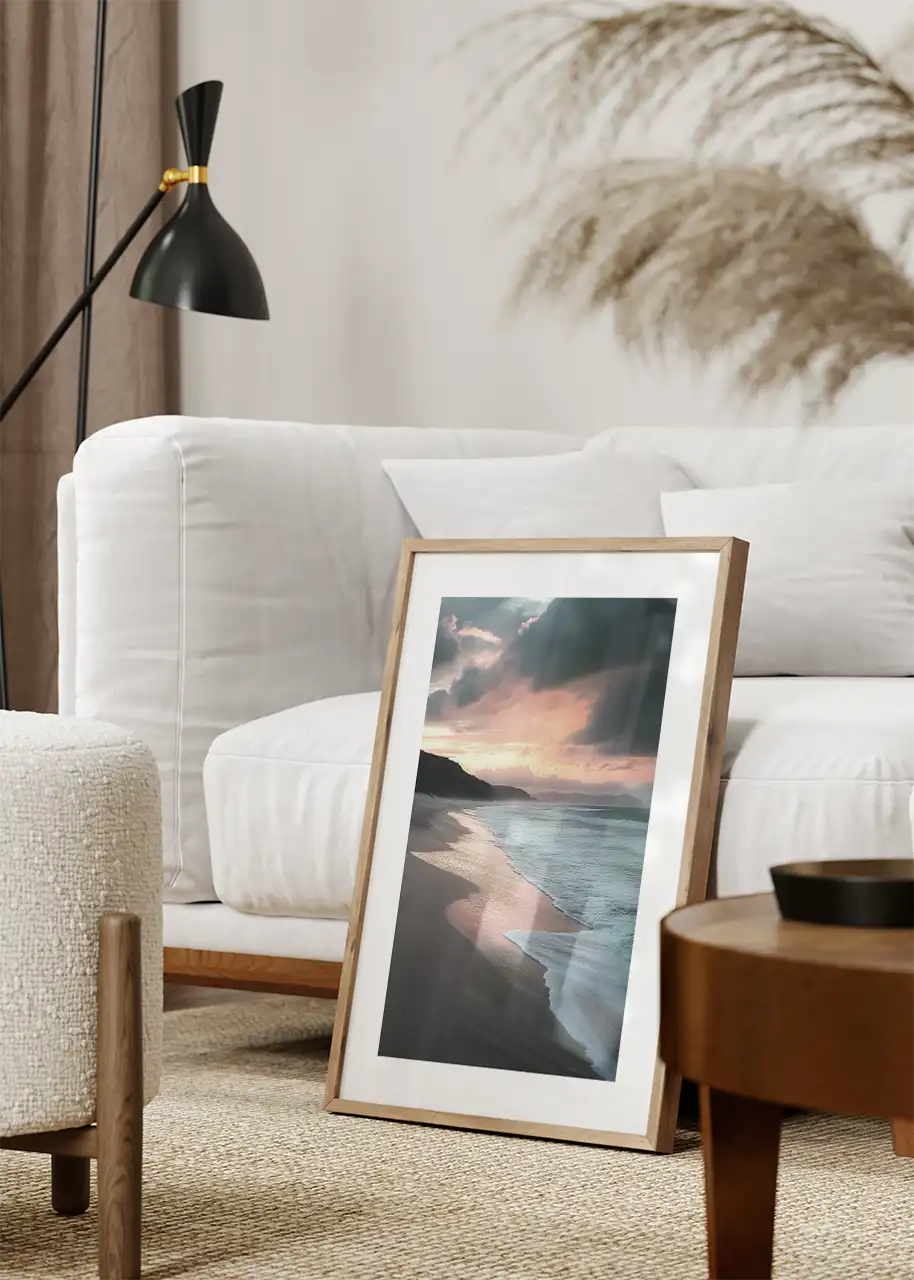 Plakat z plażą oświetloną blaskiem zachodzącego słońca