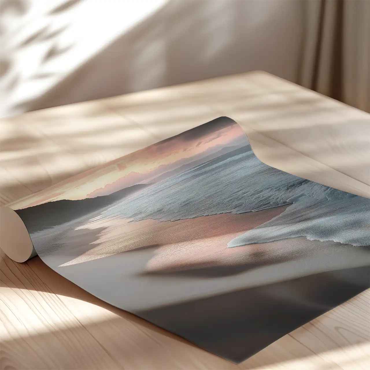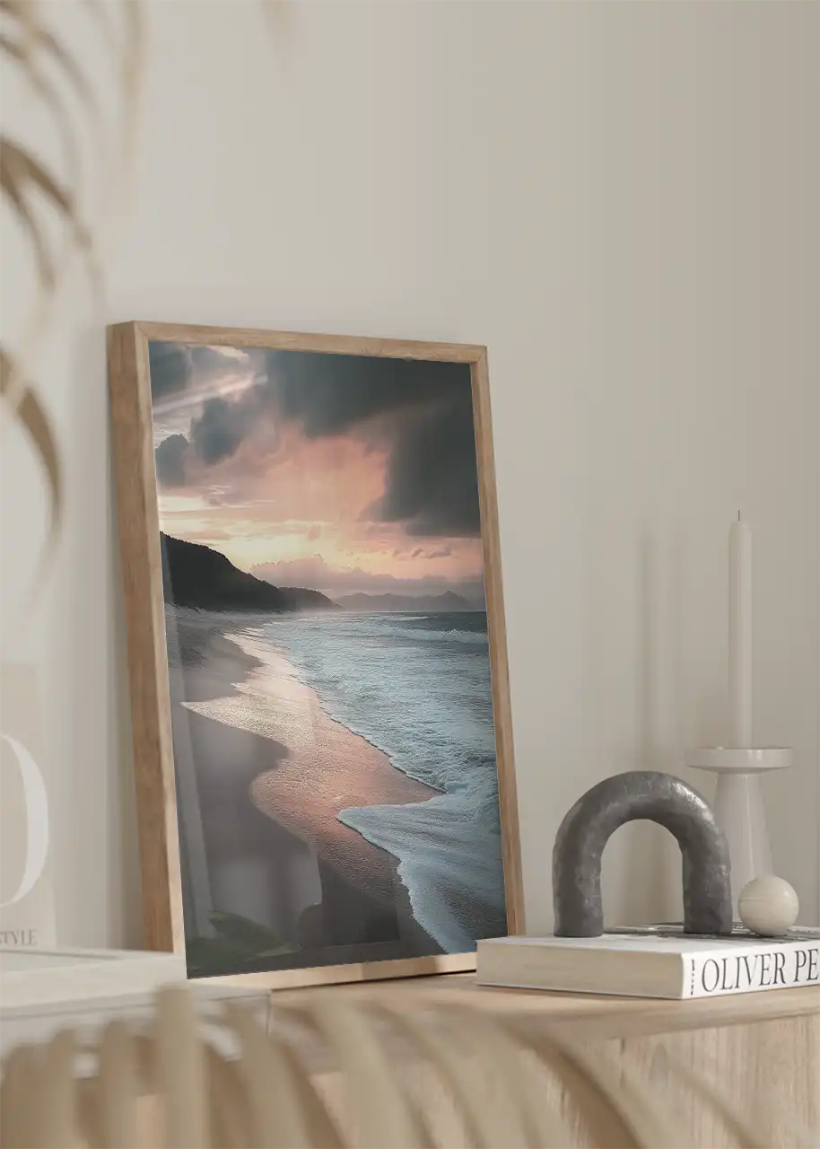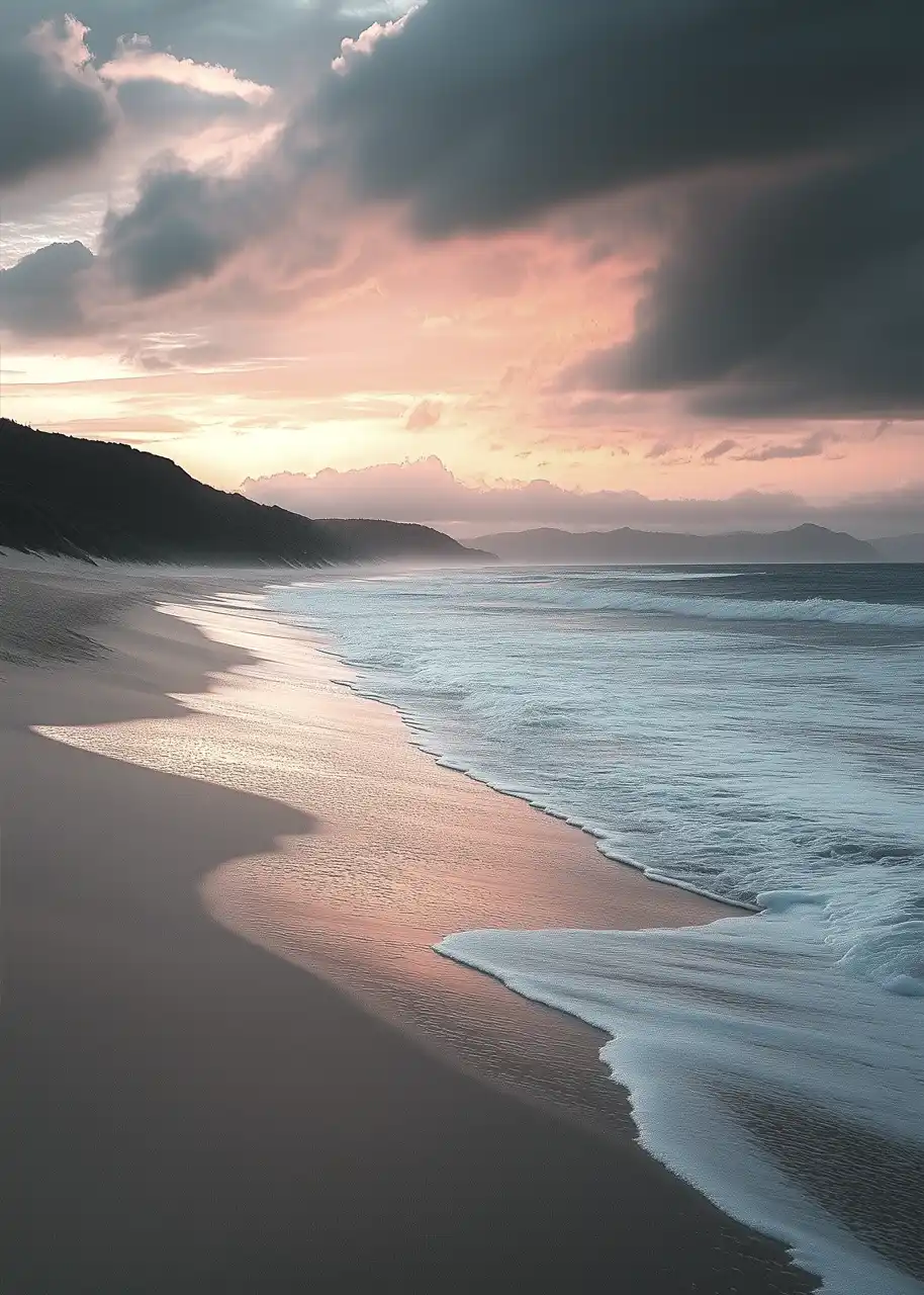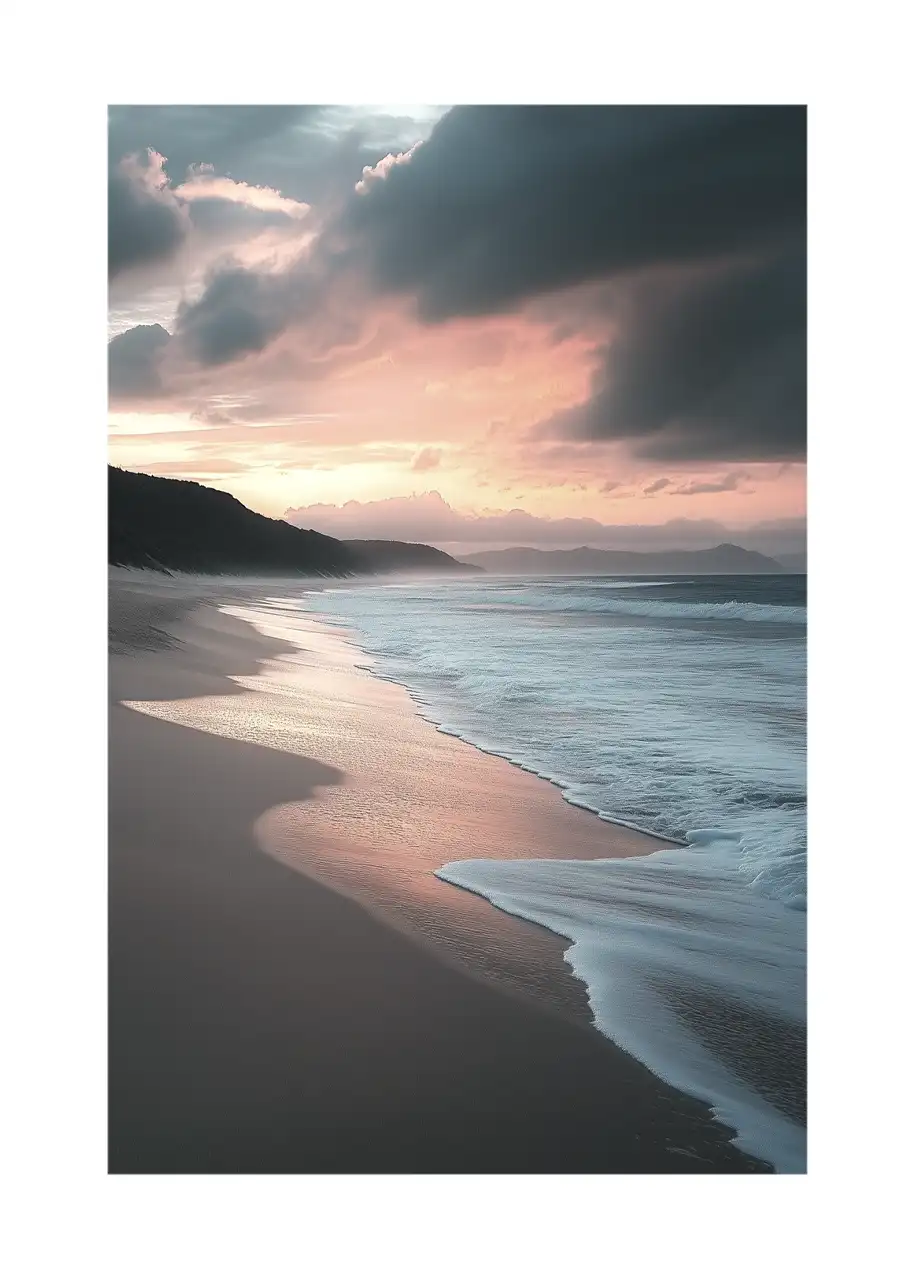 Malowniczy widok nadmorskiej plaży o zmierzchu. Falujące morze delikatnie obmywa brzeg, pozostawiając subtelne ślady na wilgotnym piasku. Niebo, rozświetlone światłem zachodzącego słońca, przechodzi w ciemniejsze, burzowe chmury, co dodaje tej kompozycji charakteru. W oddali widać zarys wzgórz, które zamykają pejzaż, dodając mu głębi i tajemniczości.