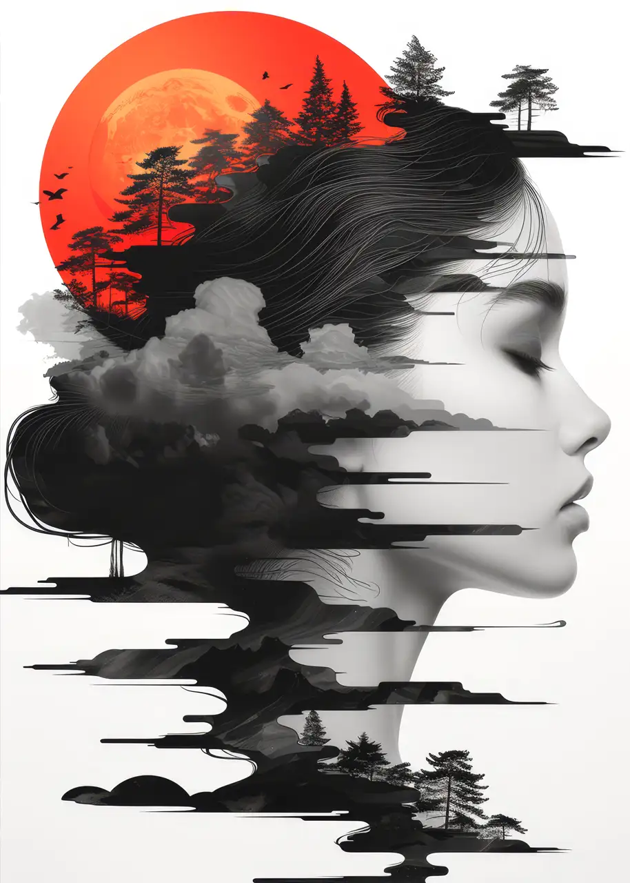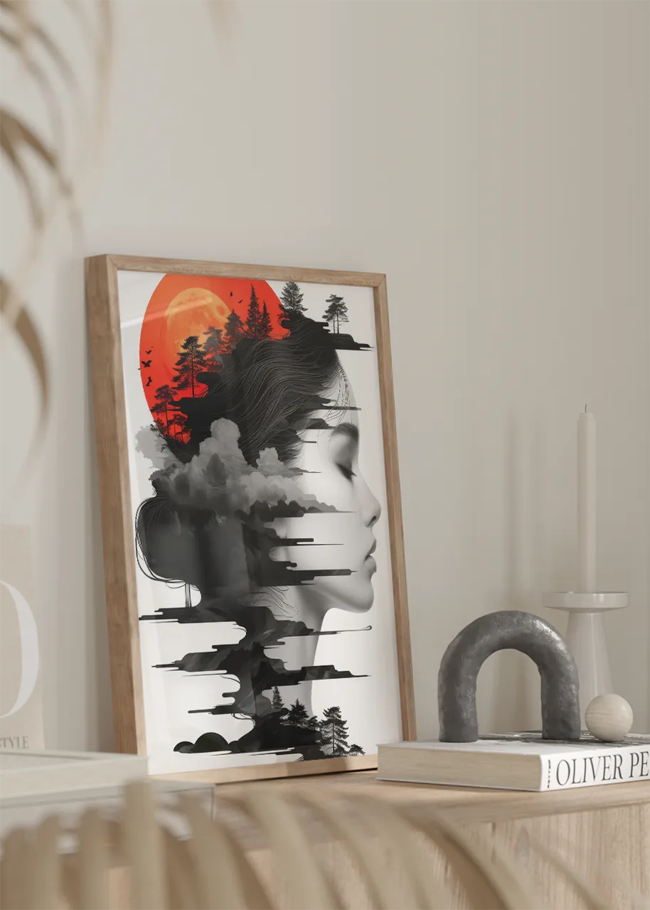 Połączenie kobiecego profilu z pejzażem sugeruje relację między światem wewnętrznym a naturą. Las i horyzont wpisane w sylwetkę symbolizują drogę, refleksję oraz przestrzeń dla wyobraźni. Czerwone słońce wzmacnia emocjonalny wymiar kompozycji i nadaje jej energii.