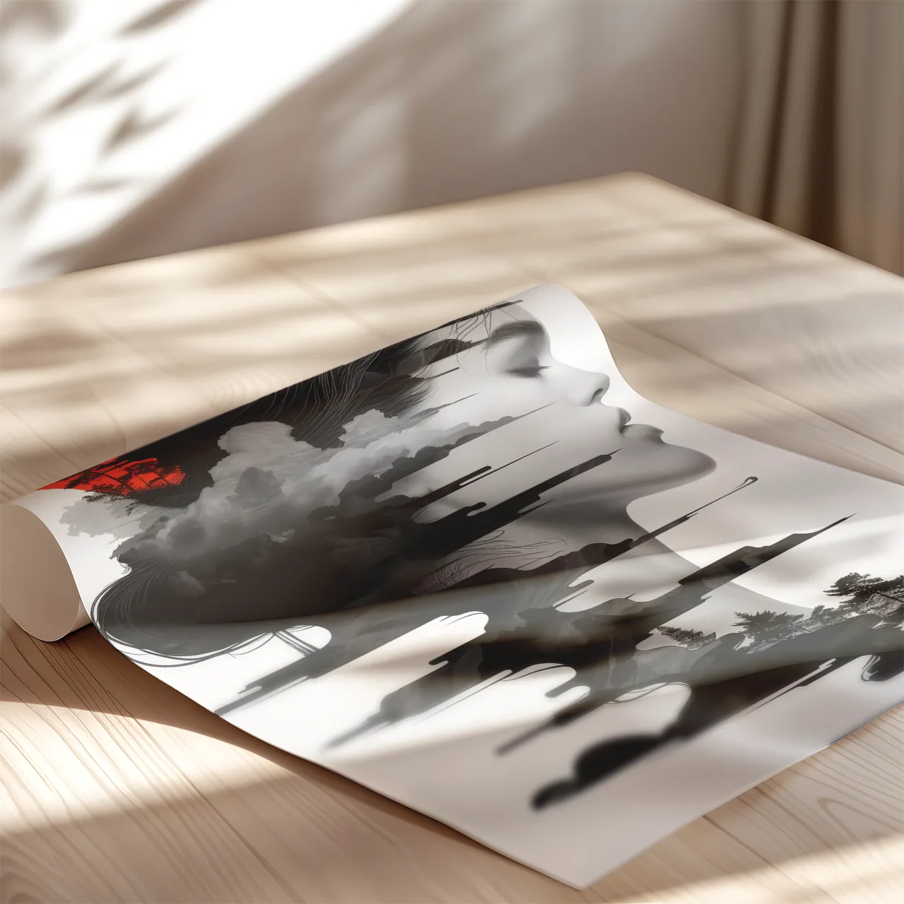 Kontrast między czernią sylwetki, jasną cerą i nasyconą czerwienią buduje silny efekt wizualny. To plakat nowoczesny, który przyciąga uwagę i stanowi wyraźny akcent we wnętrzu.