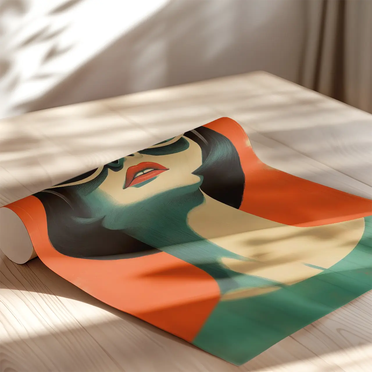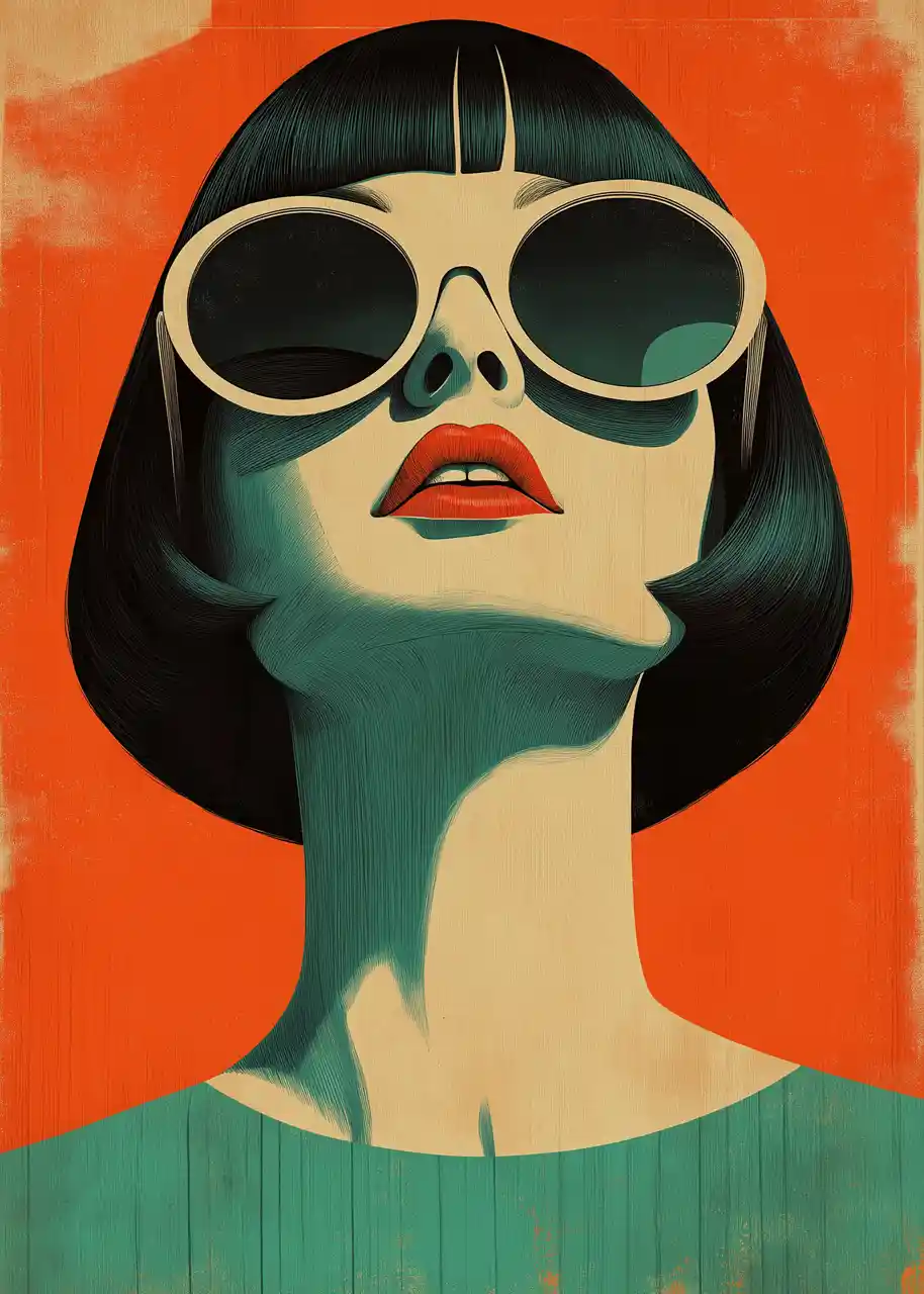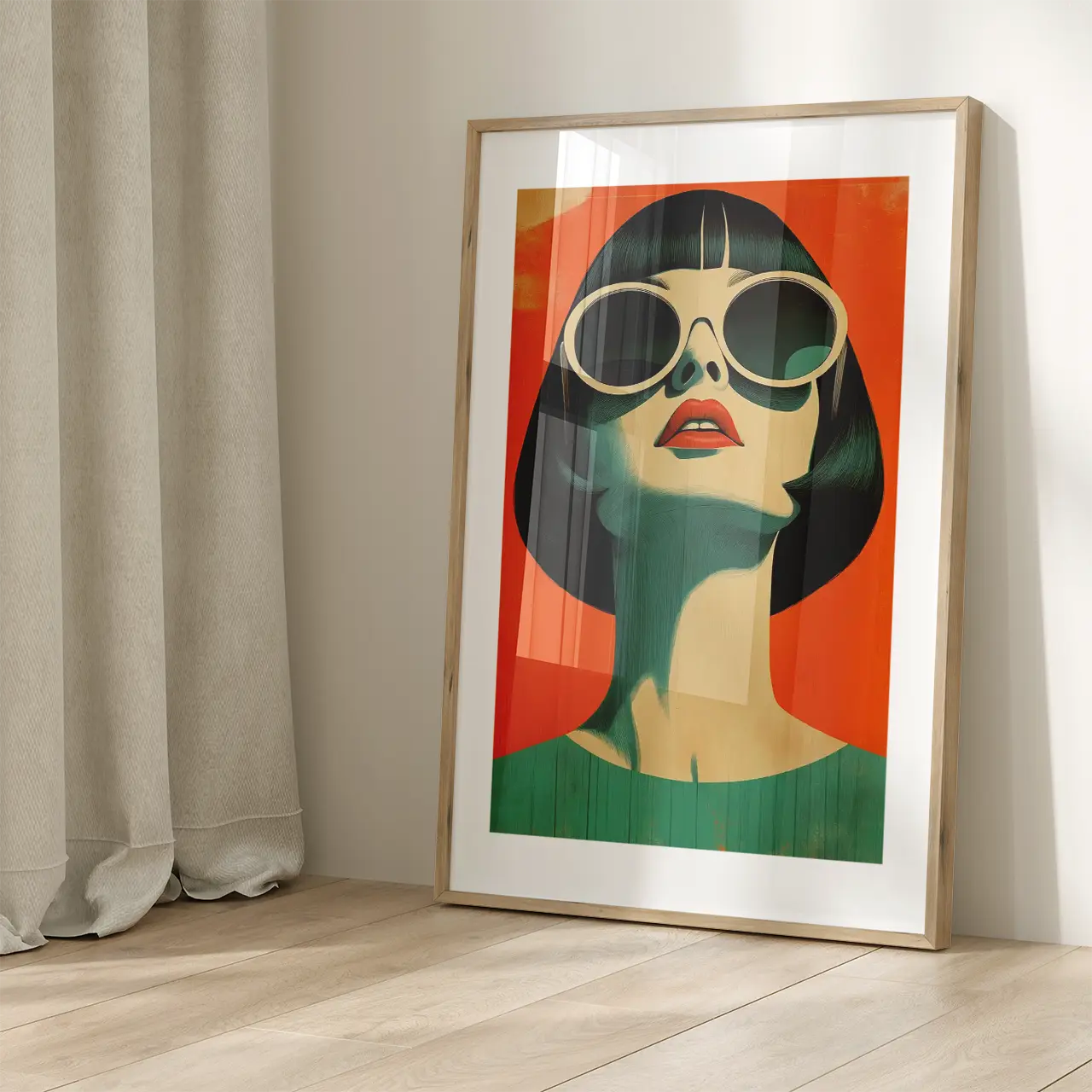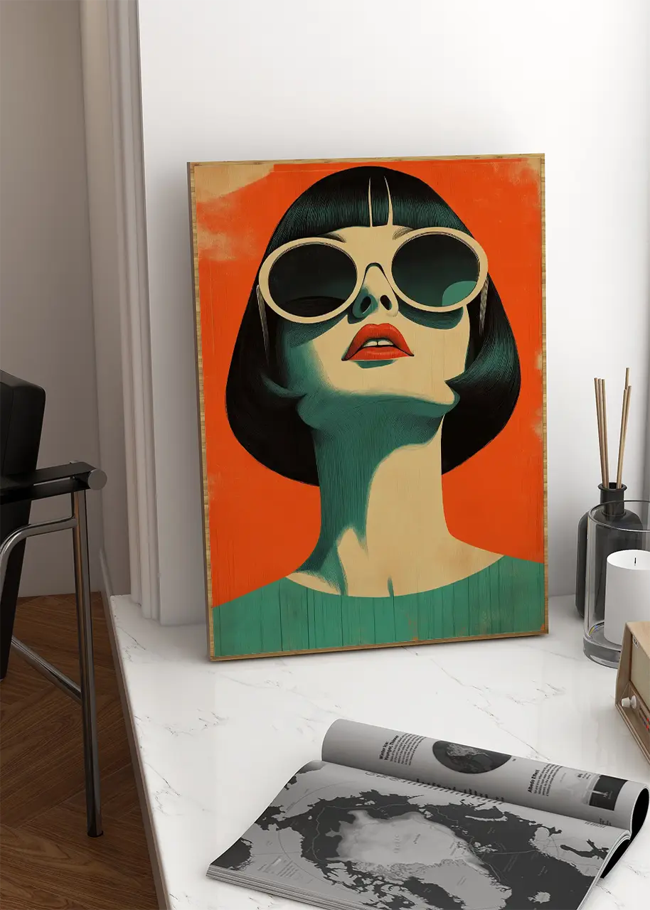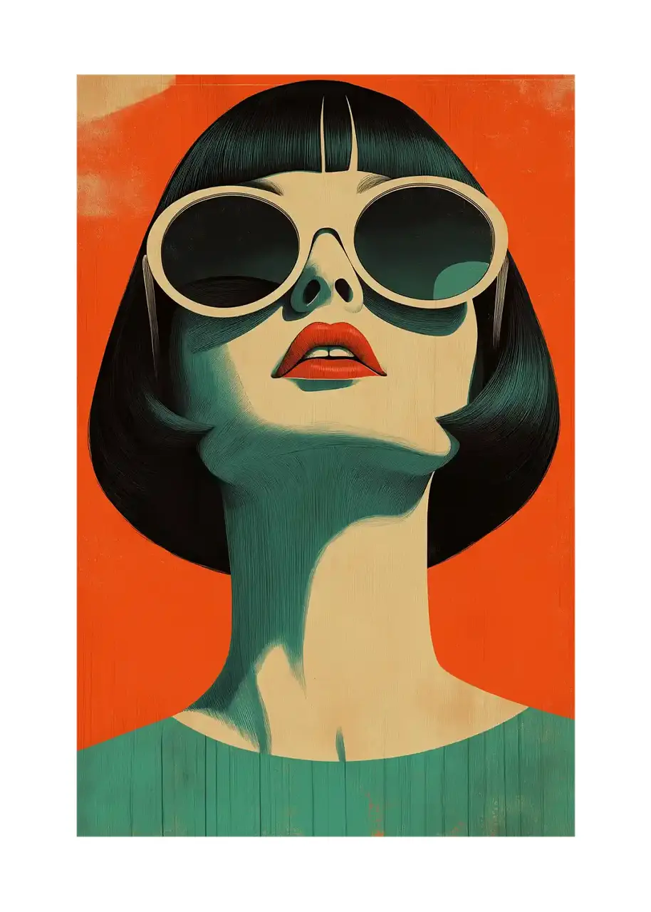 Wyrazisty plakat przedstawiający kobietę w dużych okularach przeciwsłonecznych w stylu vintage. Pomarańczowy kolor tła kontrastuje z jasną cerą postaci i jej czarnymi włosami, podkreślając elegancję i ponadczasowy szyk. Wyraziste, czerwone usta bohaterki przyciągają wzrok, dodając portretowi nieco seksapilu. Ten plakat to idealny wybór dla tych, którzy cenią nietuzinkowe dodatki do wnętrz oraz uwielbiają klimat retro połączony ze współczesnym minimalizmem. Doskonale sprawdzi się zarówno w salonie, sypialni, jak i w przestrzeniach komercyjnych – zawsze przyciągając uwagę swoją mocną, wyrazistą estetyką.