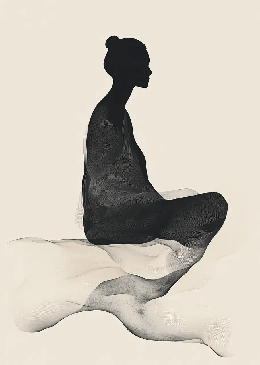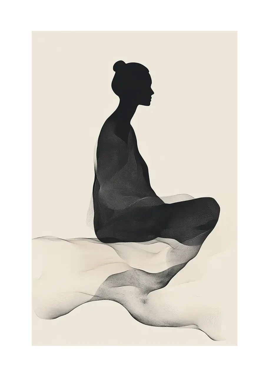 „Plakat W objęciach ciszy” ukazuje siedzącą sylwetkę w bocznym profilu, z delikatnie zarysowanym konturem i miękkim przejściem tonalnym w dolnej partii kompozycji. Postać zdaje się unosić na subtelnej, rozmytej plamie, która przypomina mgłę lub falującą tkaninę.
