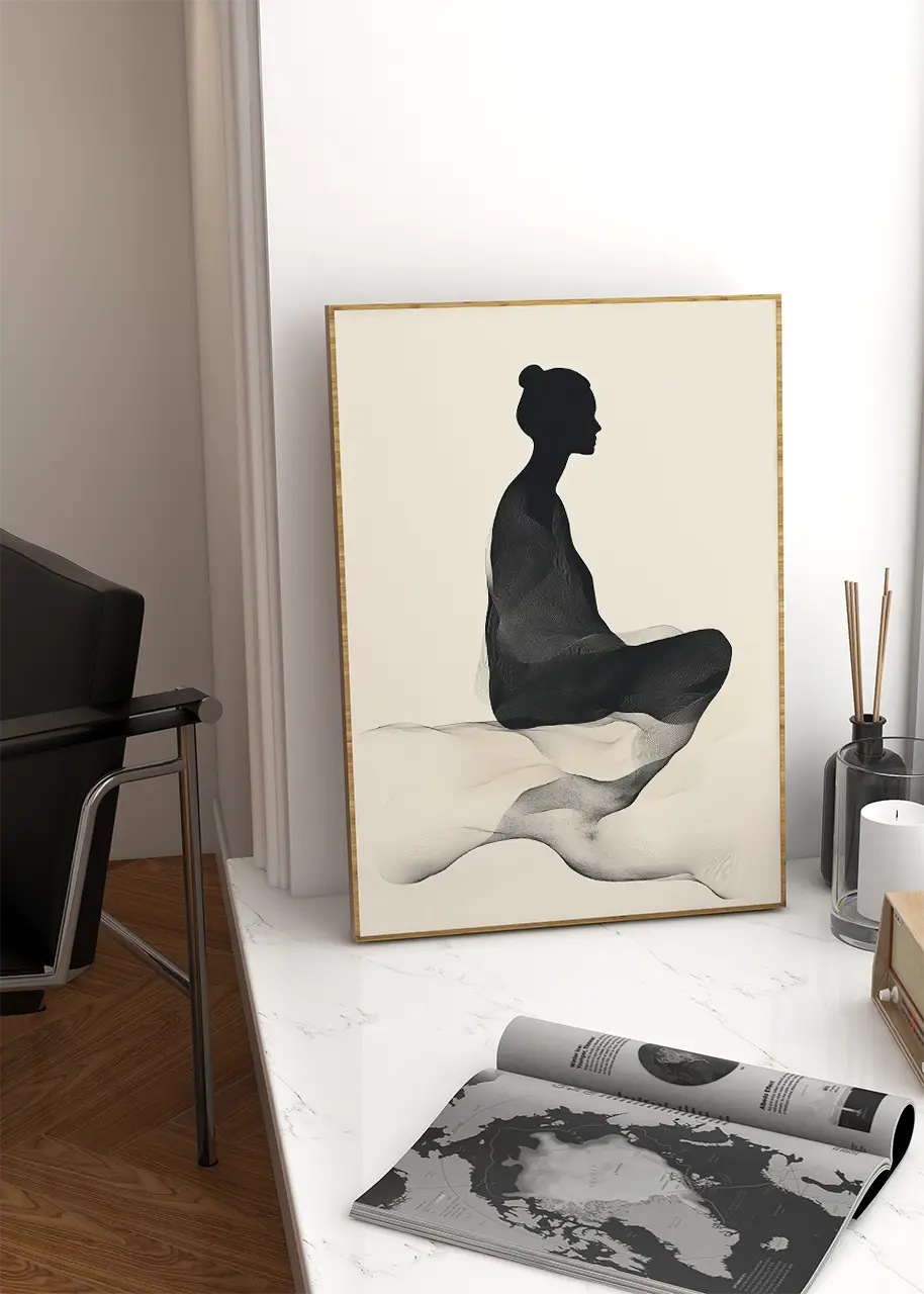 Kolorystyka ograniczona jest do czerni, grafitu i ciepłego beżu tła. Kontrast między ciemną sylwetką a jasną przestrzenią buduje wyraźny punkt centralny, jednocześnie zachowując lekkość całej kompozycji. Duża ilość pustej przestrzeni wzmacnia wrażenie ciszy i równowagi.