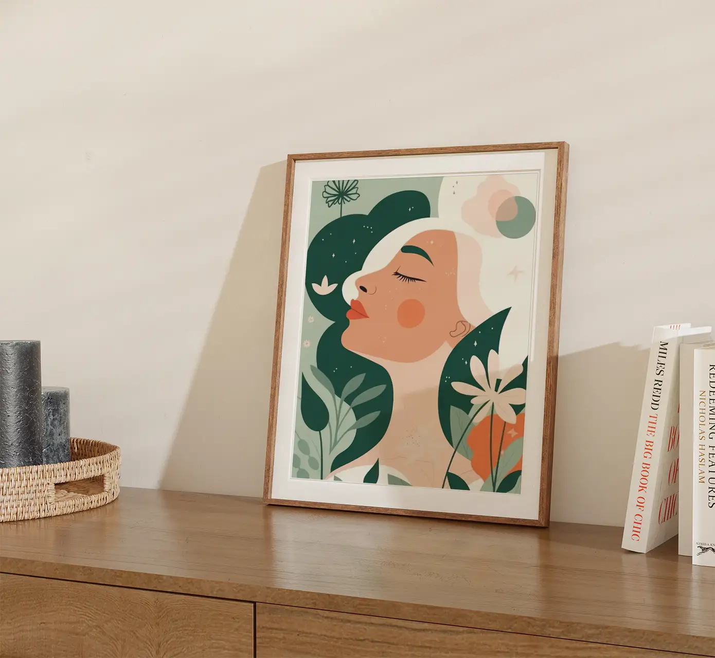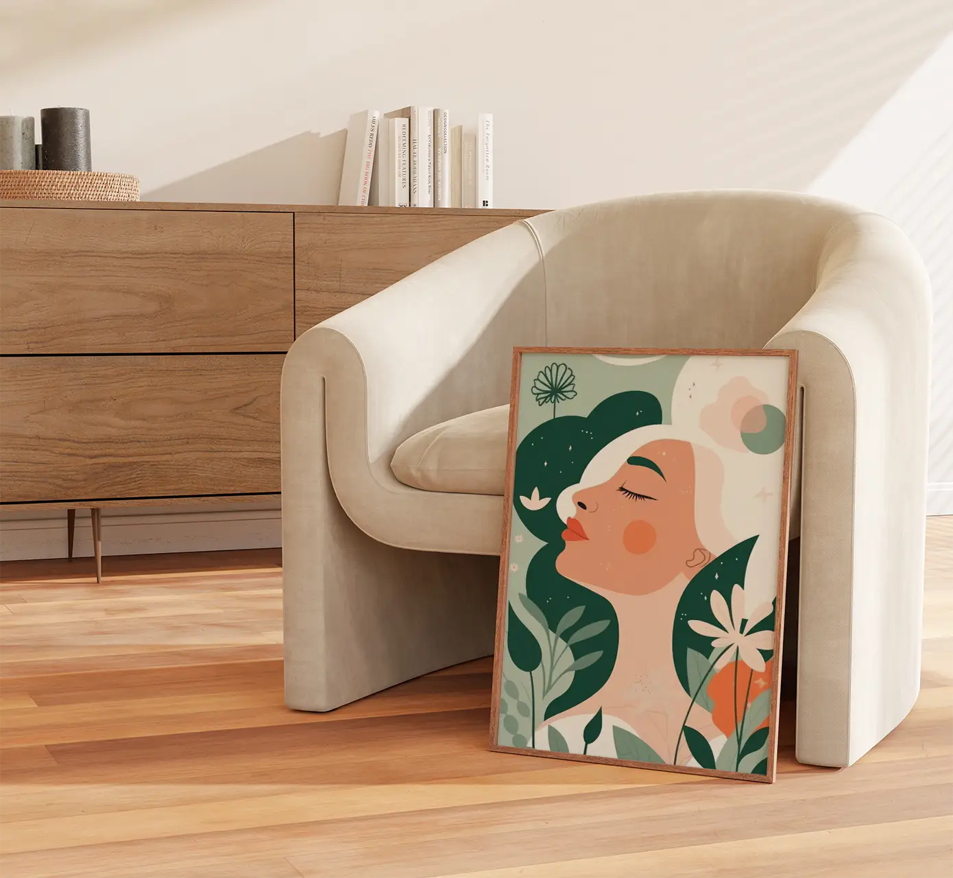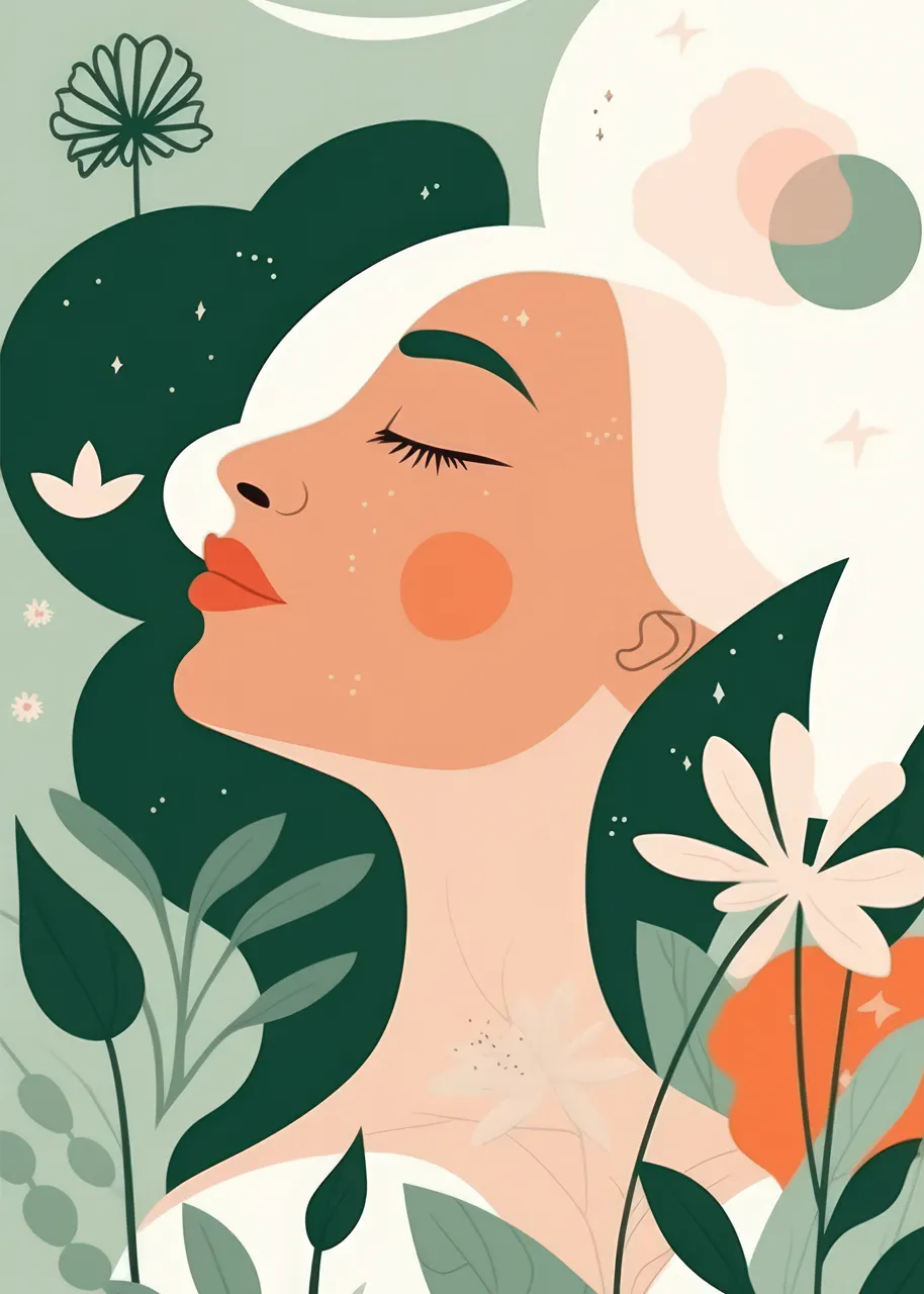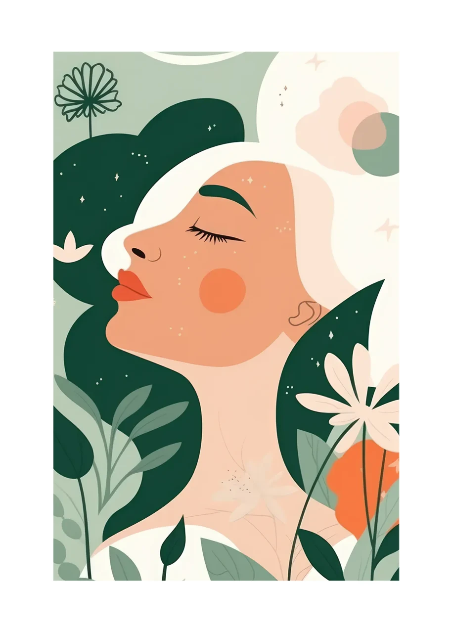 Subtelny i oniryczny wizerunek kobiety zanurzonej w głębokim spokoju. Plakat jest utrzymany w pastelowych kolorach, co tworzy spokojną i kojącą atmosferę, podkreślającą intymną relację między kobietą a otaczającą ją przyrodą. Kontrast między jasnymi i ciemnymi elementami obrazu dodaje tej grafice głębokości i wyrazistości. Delikatne kwiaty i liście, które otaczają sylwetkę postaci, sugerują, że kobieta jest nierozerwalnie związana z naturą. Seria plakatów pt. W objęciach natury, to doskonały wybór dla tych, którzy szukają spokoju w objęciach natury, podkreślając jednocześnie nierozerwalną więź między człowiekiem a otaczającym go światem.
