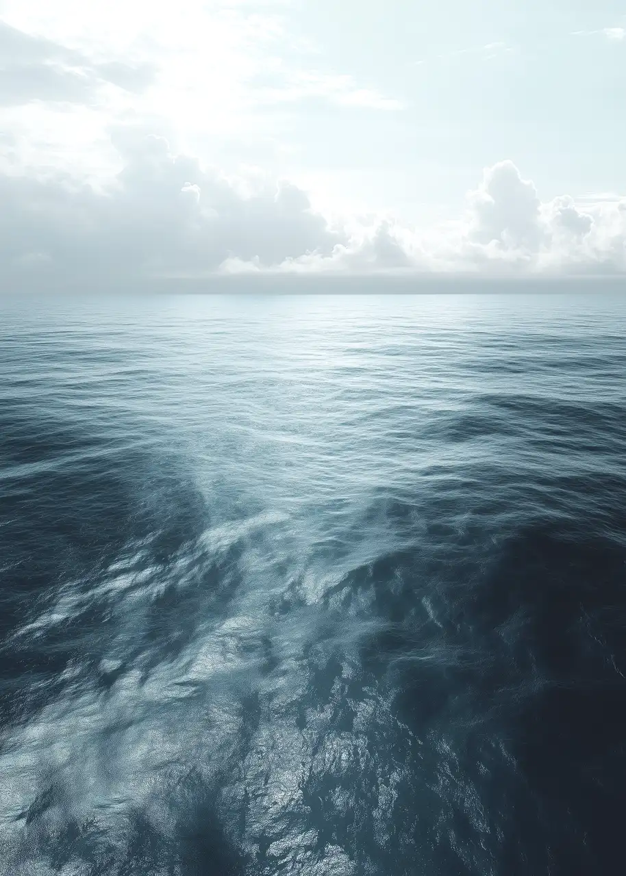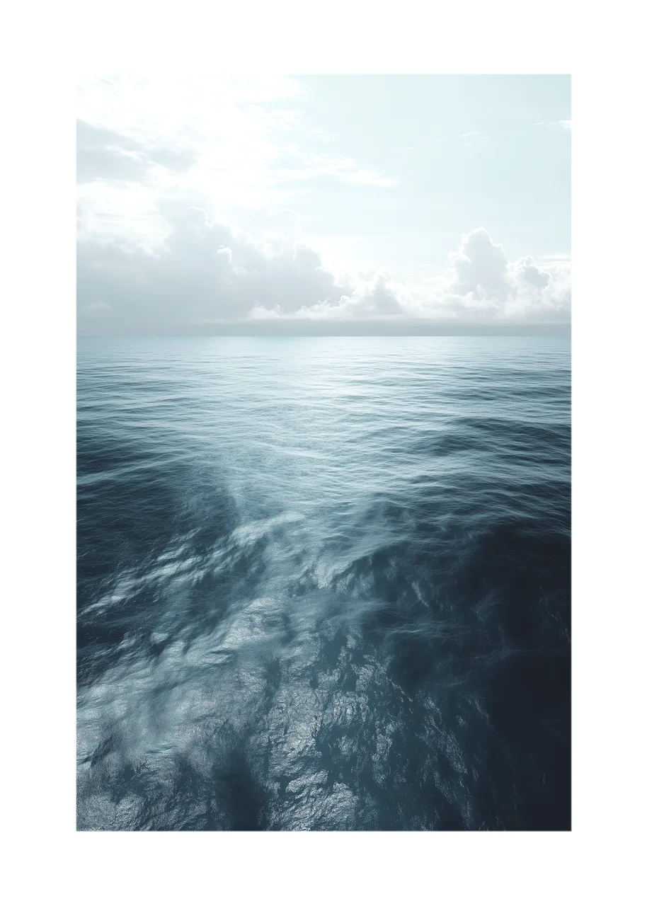 Subtelne refleksy światła na wodzie tworzą miękkie przejścia tonalne. Chłodne odcienie granatu, turkusu i przygaszonej szarości nadają kompozycji głębię. Obecność rozproszonych chmur nad linią horyzontu wzmacnia wrażenie przestrzeni.