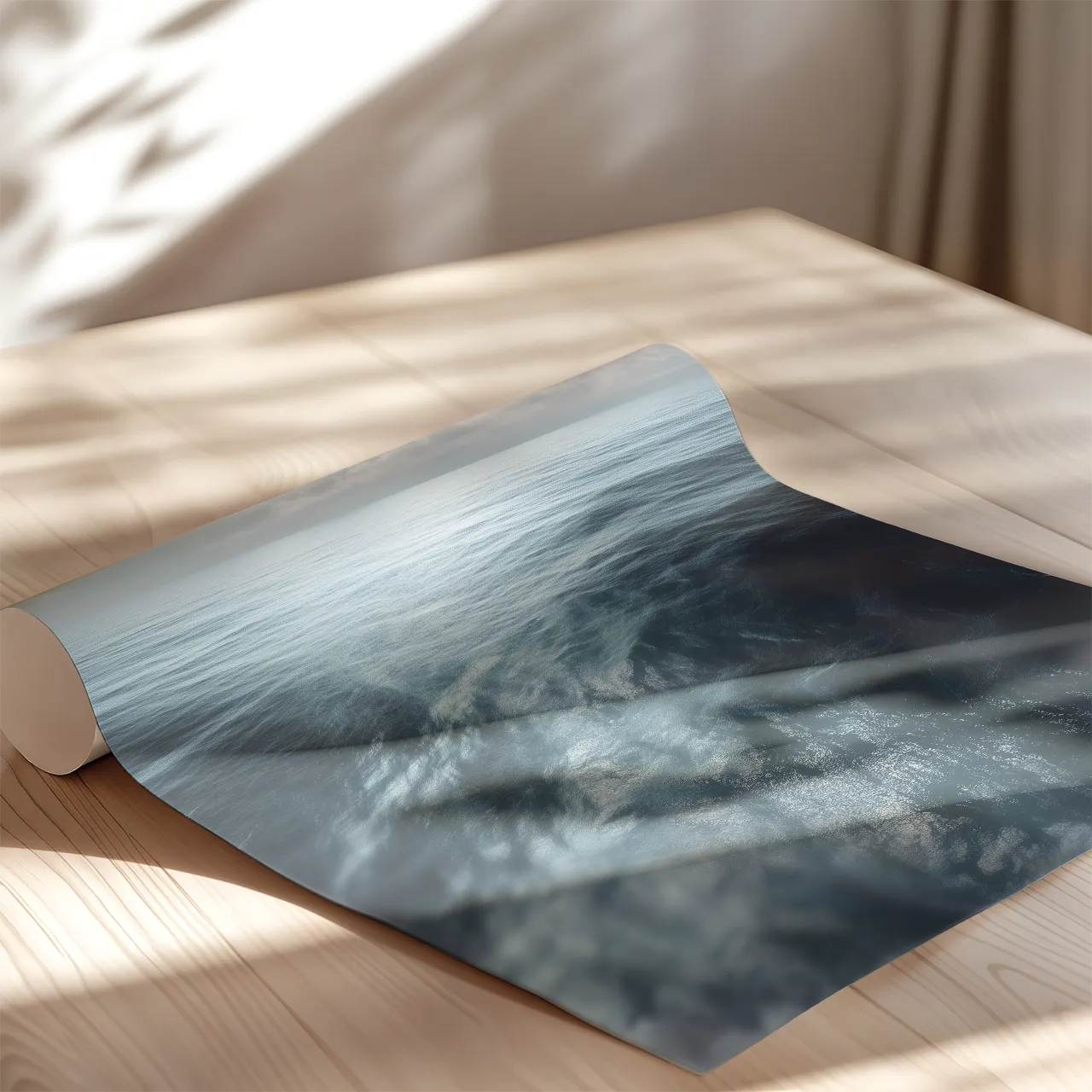 Horyzontalny podział kompozycji wprowadza równowagę i stabilność. Delikatne fale nadają strukturę, a chłodna kolorystyka optycznie powiększa przestrzeń.