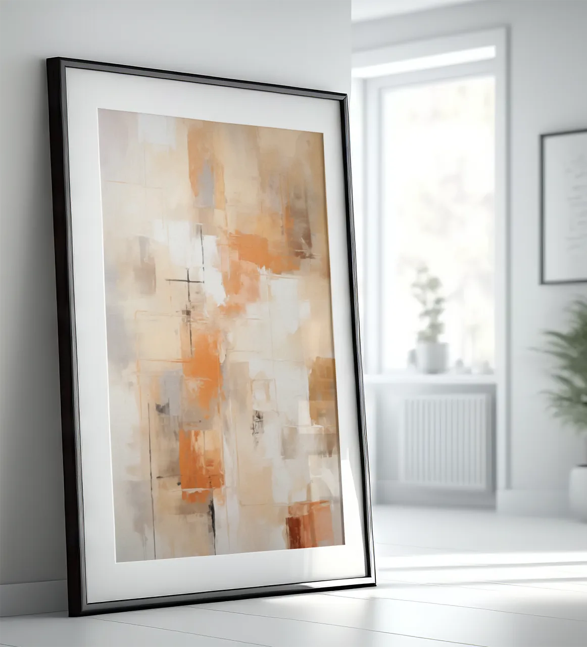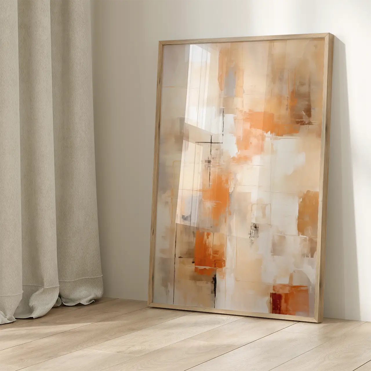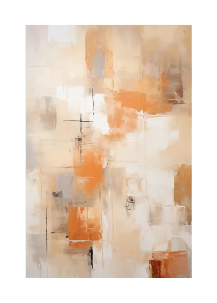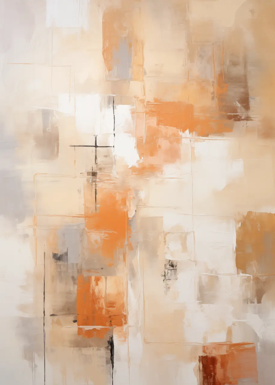 Kolorystyka oparta jest na jasnych odcieniach beżu, piasku i złamanej bieli, uzupełnionych ciepłymi akcentami pomarańczy oraz subtelnymi tonami szarości. Całość tworzy harmonijną, stonowaną paletę.
