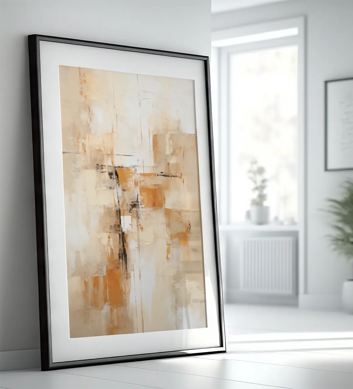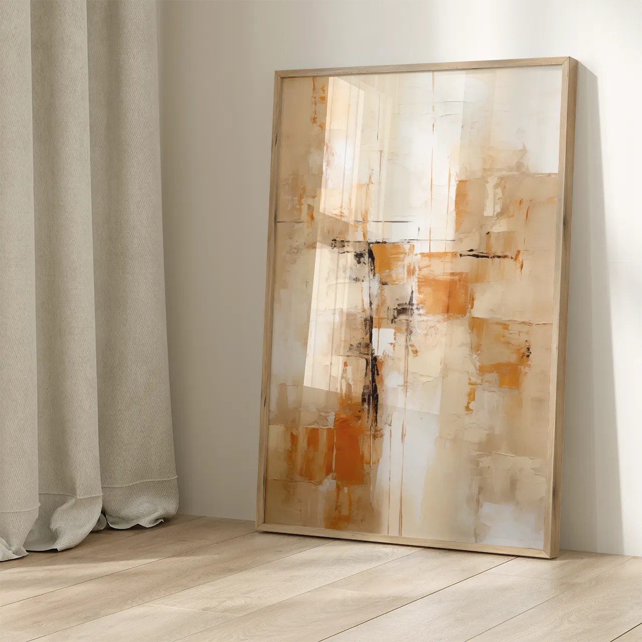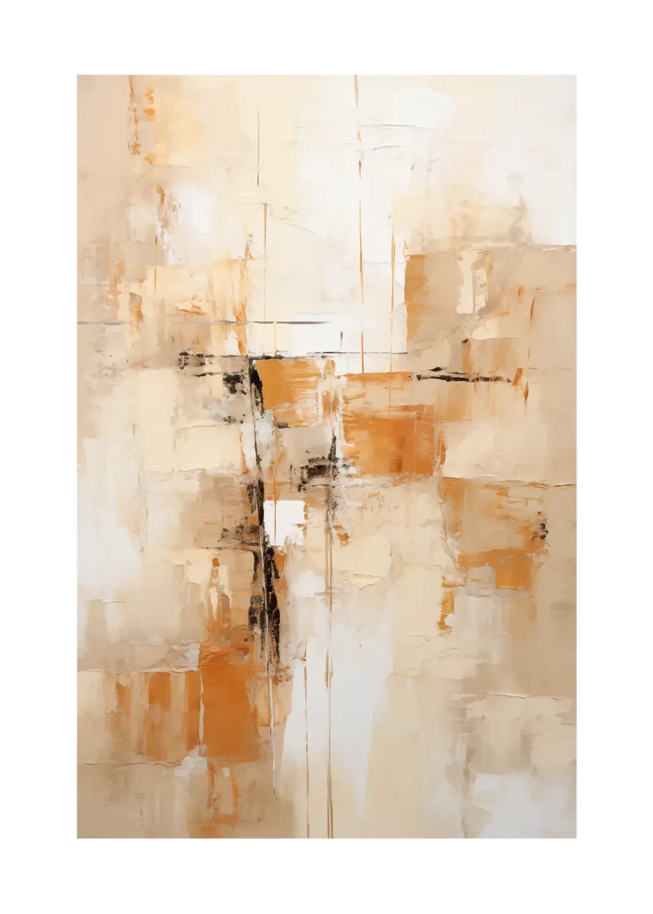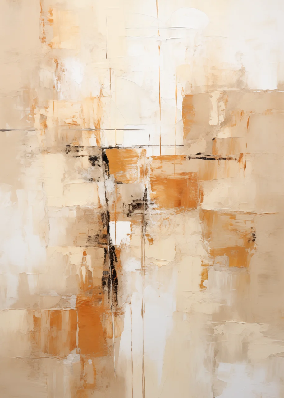 Kolorystyka oparta jest na ciepłych odcieniach beżu, piasku, ochry i intensywnej pomarańczy. Kontrastowe akcenty czerni oraz subtelne szarości nadają kompozycji wyrazistość i równowagę.