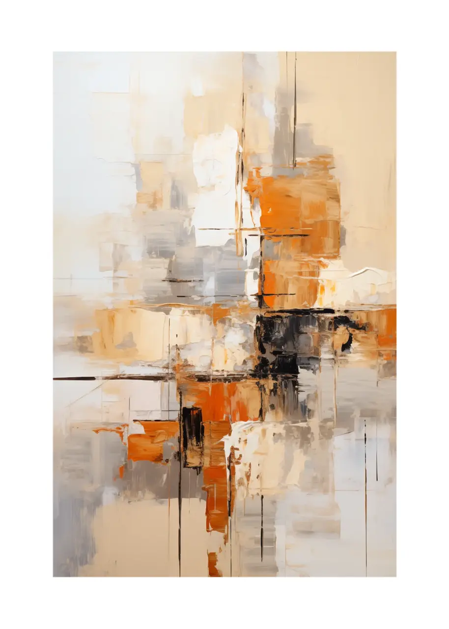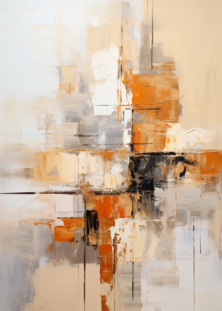 Kolorystyka oparta jest na ciepłych odcieniach beżu, karmelu i intensywnej pomarańczy, przełamanych czarnymi akcentami oraz chłodniejszymi tonami szarości. Kontrast między jasnymi i ciemnymi fragmentami nadaje kompozycji wyrazistość.
