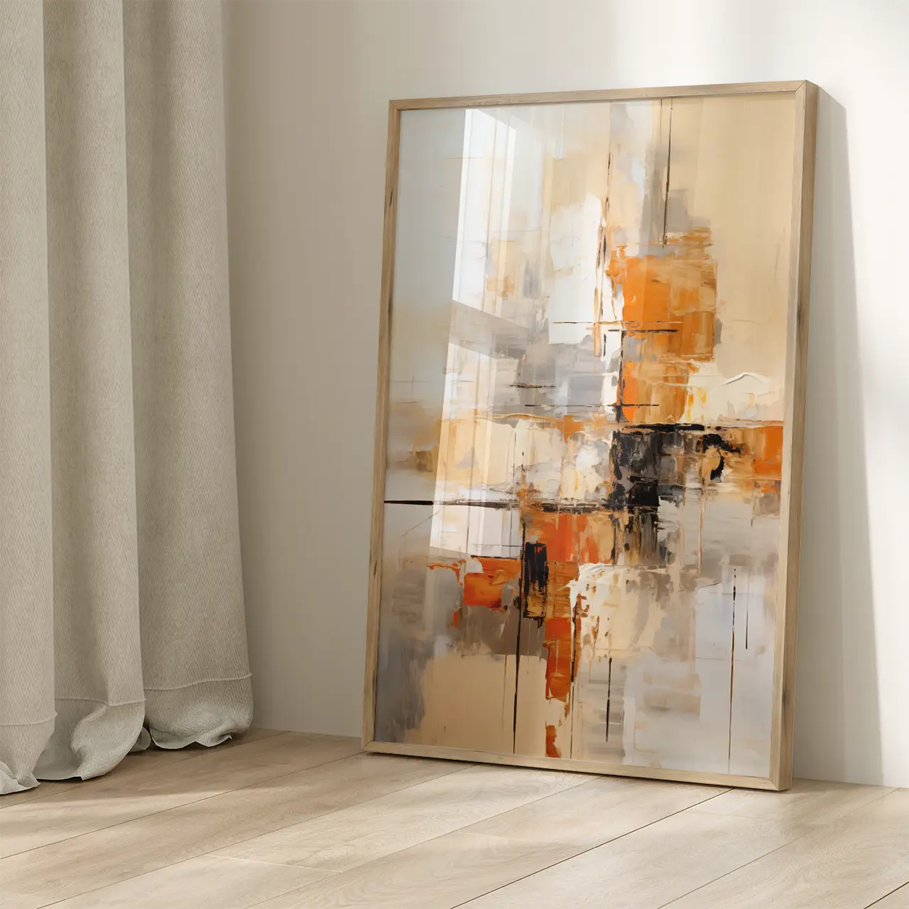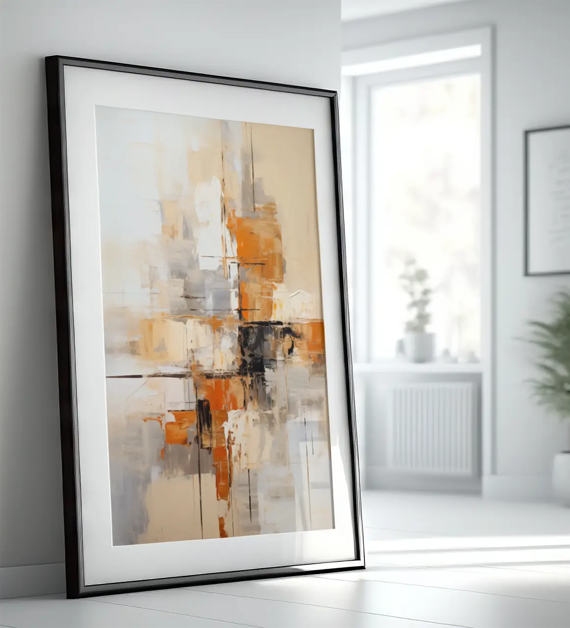 Plakat działa jako wyrazisty, ciepły akcent wizualny. Przyciąga uwagę kontrastem i strukturą, wprowadzając do wnętrza energię i nowoczesny charakter.