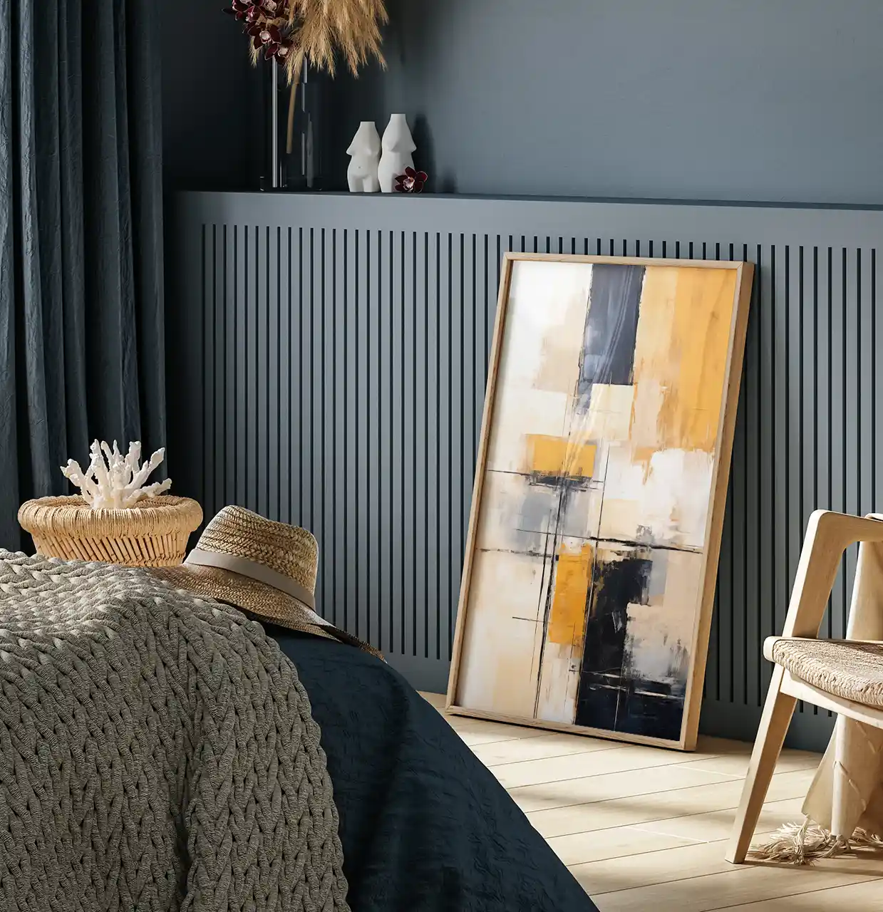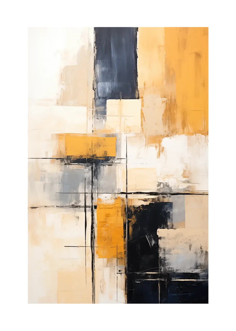 Centralną część obrazu budują kontrastowe płaszczyzny granatu i żółci, które stanowią wizualne punkty skupienia. Jasne fragmenty tła równoważą kompozycję i nadają jej lekkości.