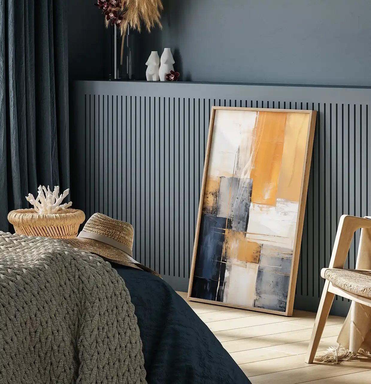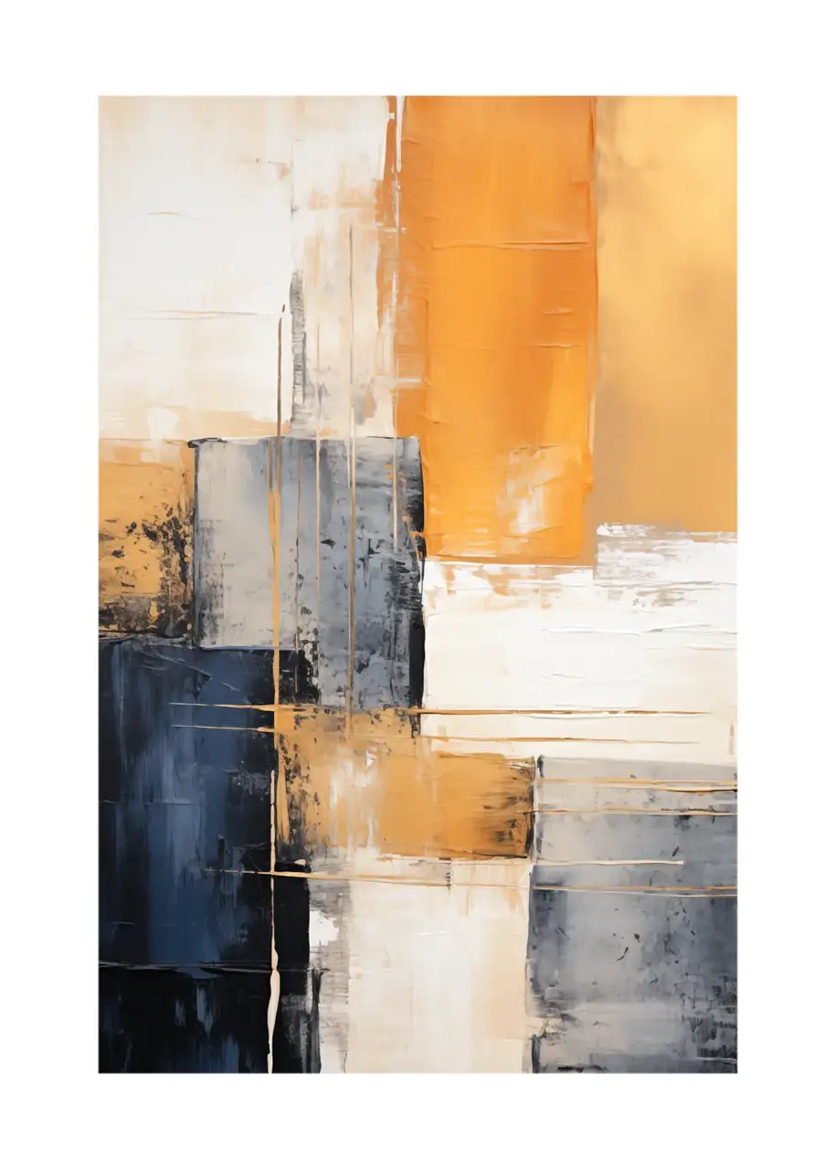 Duże żółte płaszczyzny budują wizualny punkt skupienia i wprowadzają ciepło do kompozycji. Granatowe elementy równoważą całość i nadają obrazowi głębi.