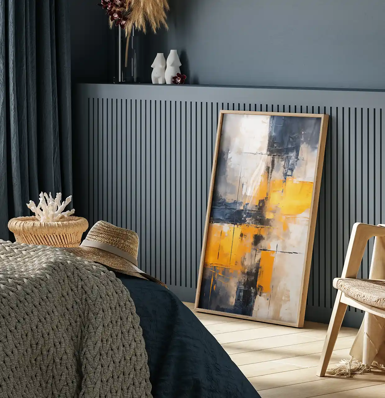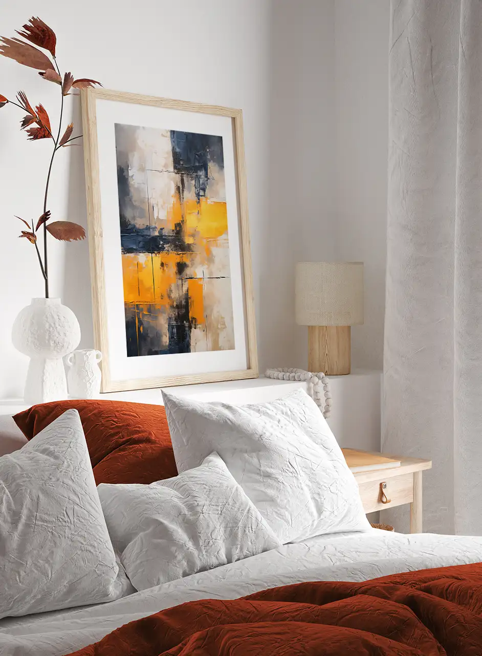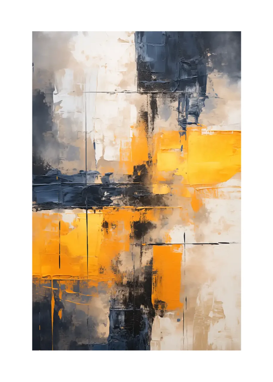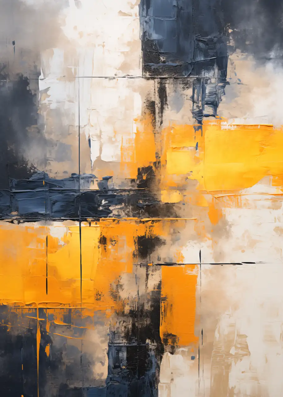 Kompozycja opiera się na zestawieniu jasnych odcieni bieli i beżu z intensywną żółcią oraz głębokimi fragmentami granatu i grafitu. Takie połączenie kolorów tworzy mocny kontrast wizualny, który przyciąga uwagę i nadaje grafice nowoczesny charakter.