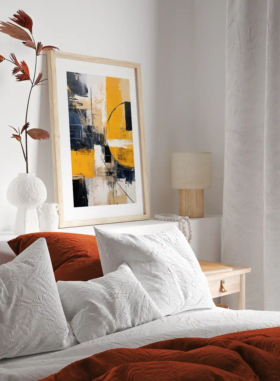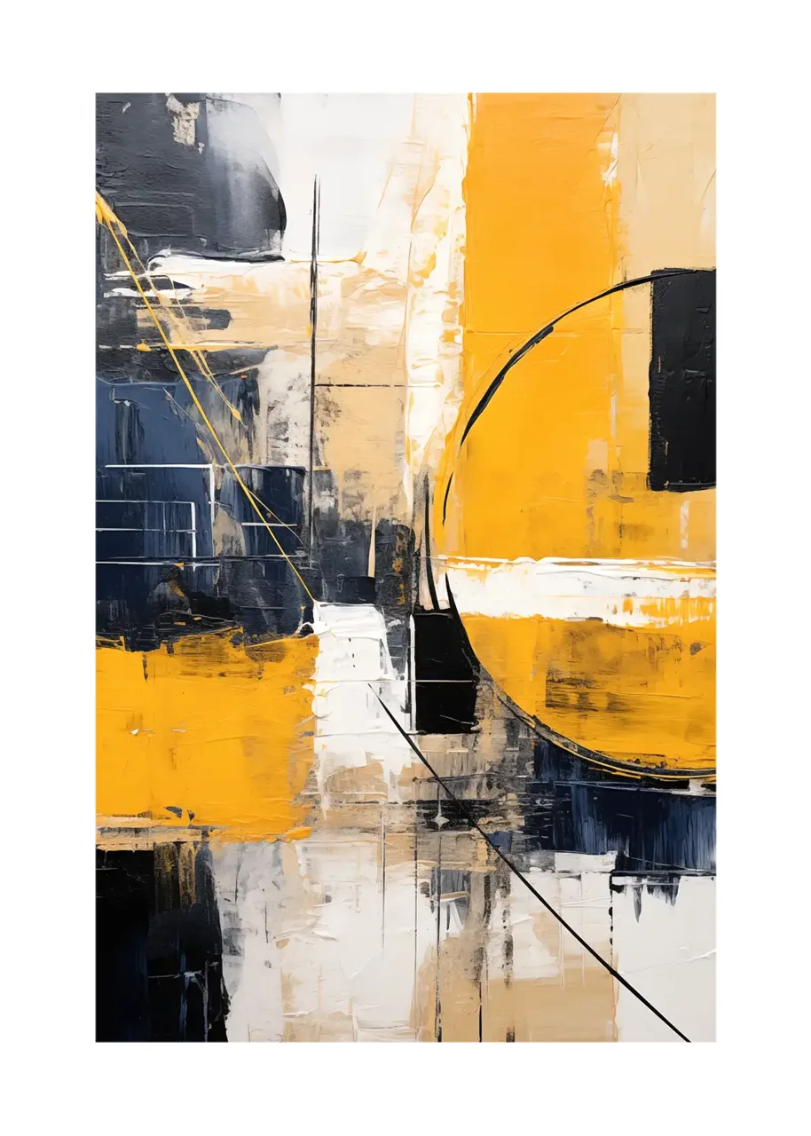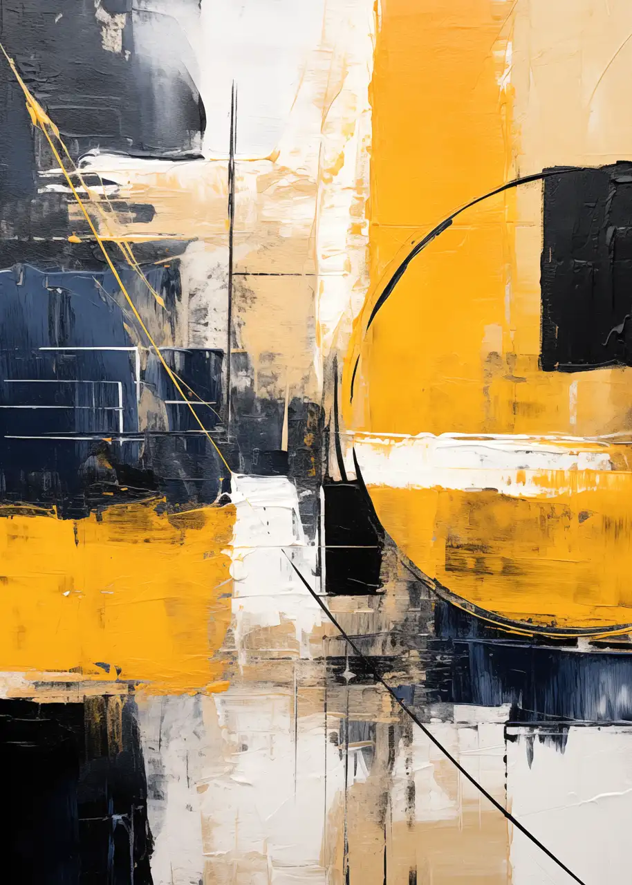 Duże płaszczyzny żółci stanowią dominujący element kompozycji i przyciągają wzrok. Granatowe fragmenty wprowadzają kontrast i równoważą ciepłe tony obrazu.