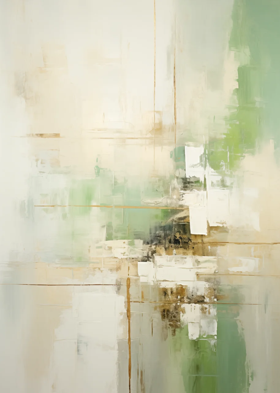 Warstwy koloru nakładają się na siebie w sposób swobodny, lecz kontrolowany. Transparentne przejścia, cienkie linie oraz delikatne akcenty w odcieniu ochry budują wrażenie głębi. Zieleń pojawia się w kilku tonacjach – od pastelowej po bardziej nasyconą – tworząc subtelny kontrast wobec jasnego tła.