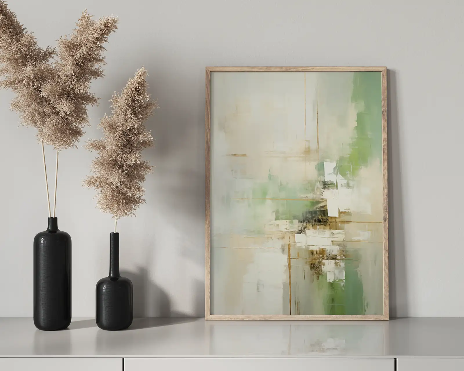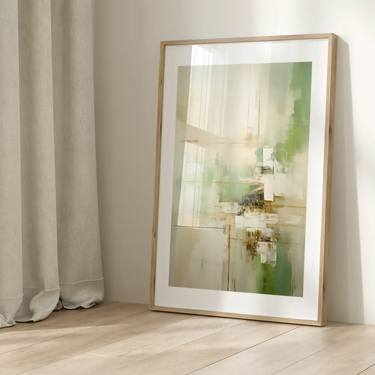 Warstwowa struktura kompozycji wprowadza do wnętrza subtelną dynamikę bez nadmiernego kontrastu. Jasne partie obrazu optycznie rozświetlają przestrzeń, natomiast zieleń nadaje jej naturalny, świeży charakter.