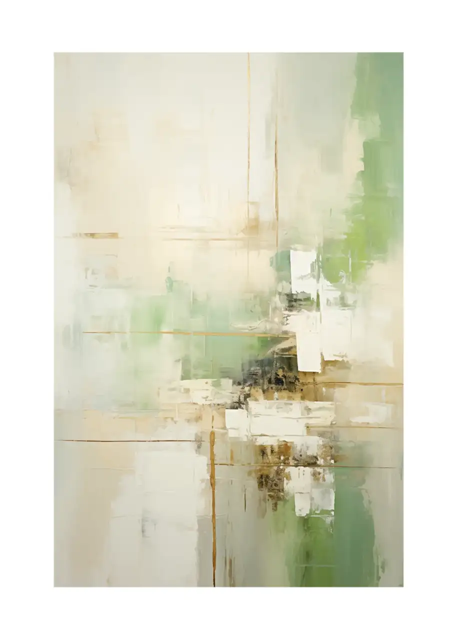 Plakat „Warstwy – wiosna” to abstrakcyjna grafika ścienna oparta na przenikających się płaszczyznach zieleni, bieli i ciepłego beżu. Kompozycja ma charakter bardziej horyzontalny, z wyraźnym skupieniem form w centralnej części obrazu. Kolorystyka pozostaje jasna i naturalna, co nadaje całości spokojny, uporządkowany wyraz.