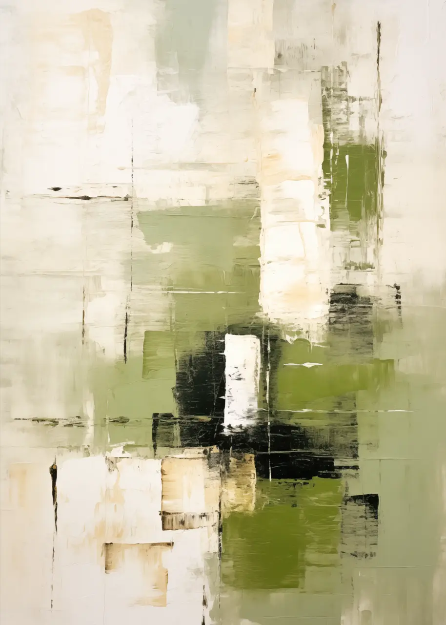 Motywem przewodnim jest abstrakcja inspirowana warstwowym nakładaniem farby. Prostokątne i nieregularne plamy tworzą kompozycję opartą na równowadze między światłem a kolorem. Zieleń w odcieniu szałwii i oliwki zestawiona została z ciepłym beżem oraz złamaną bielą, co buduje naturalną, harmonijną paletę.