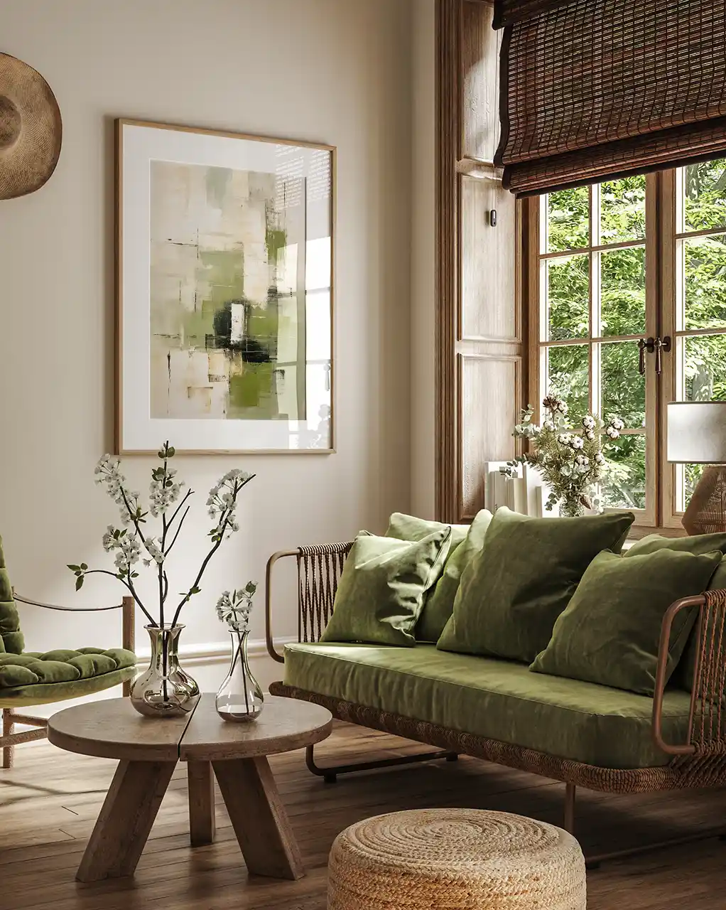 Kompozycja oparta na warstwach sprawia, że plakat pełni rolę wizualnego porządkującego akcentu w aranżacji. Zieleń przełamuje neutralne wnętrza, a jasne beże i biele utrzymują całość w stonowanym tonie.