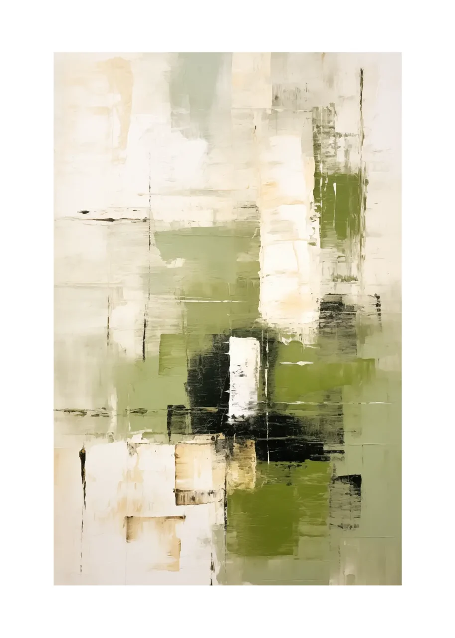 Plakat „Warstwy – wiosna” to abstrakcyjna kompozycja zbudowana z nakładających się pól koloru w odcieniach zieleni, beżu i bieli. Pionowy układ form nadaje całości spokojny rytm, a widoczne przetarcia i zróżnicowane faktury wprowadzają wrażenie głębi. Kontrast pomiędzy jasnym tłem a ciemniejszymi akcentami porządkuje strukturę obrazu i podkreśla jego geometryczny charakter.
