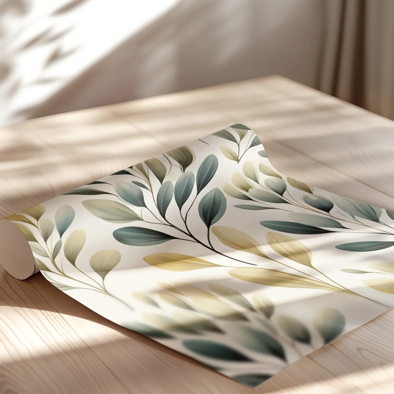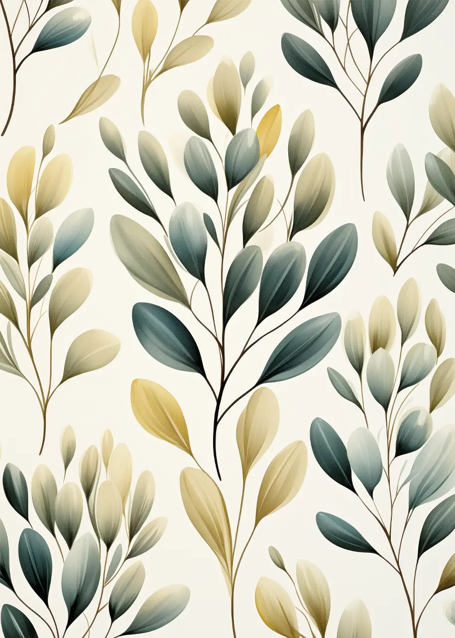 Głównym motywem grafiki są stylizowane liście osadzone na cienkich, ciemniejszych łodygach. Powtarzalność elementów buduje wrażenie wzoru inspirowanego naturą i klasyczną ilustracją botaniczną.