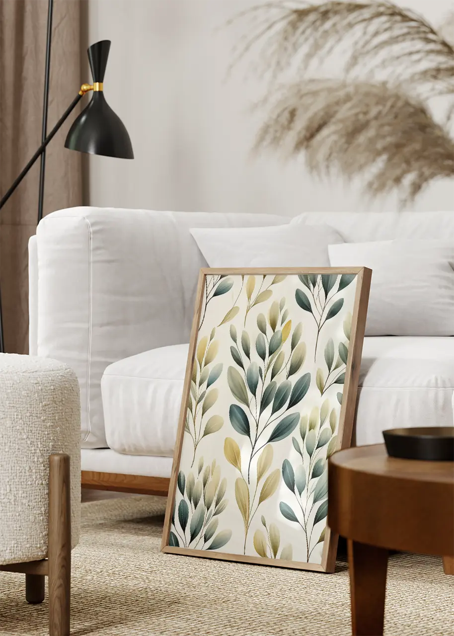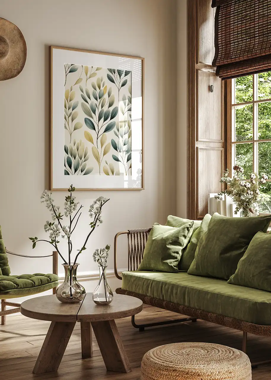 Plakat z motywem liści sprawdzi się jako obraz do salonu, sypialni, jadalni lub kuchni. Jasne tło i stonowane zielenie dobrze komponują się z drewnem, naturalnymi tkaninami oraz białymi lub kremowymi ścianami.