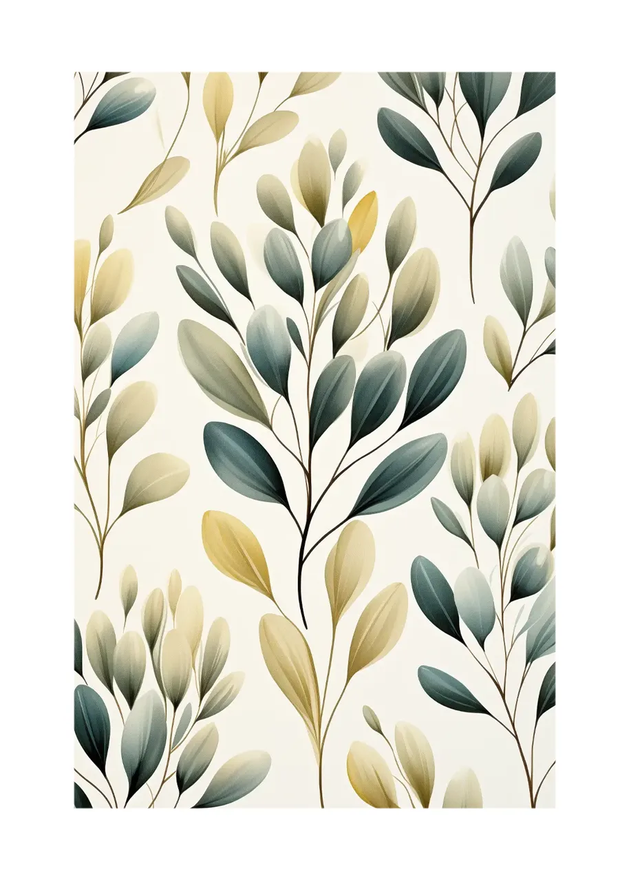 Plakat „Wzory zieleni” przedstawia rytmiczny układ smukłych gałązek z drobnymi liśćmi w zróżnicowanych odcieniach zieleni i oliwki. Motyw powtarza się na jasnym tle, tworząc harmonijną, uporządkowaną kompozycję o dekoracyjnym charakterze.