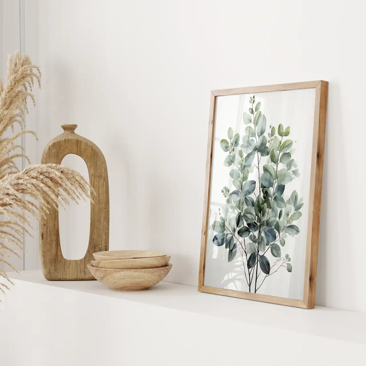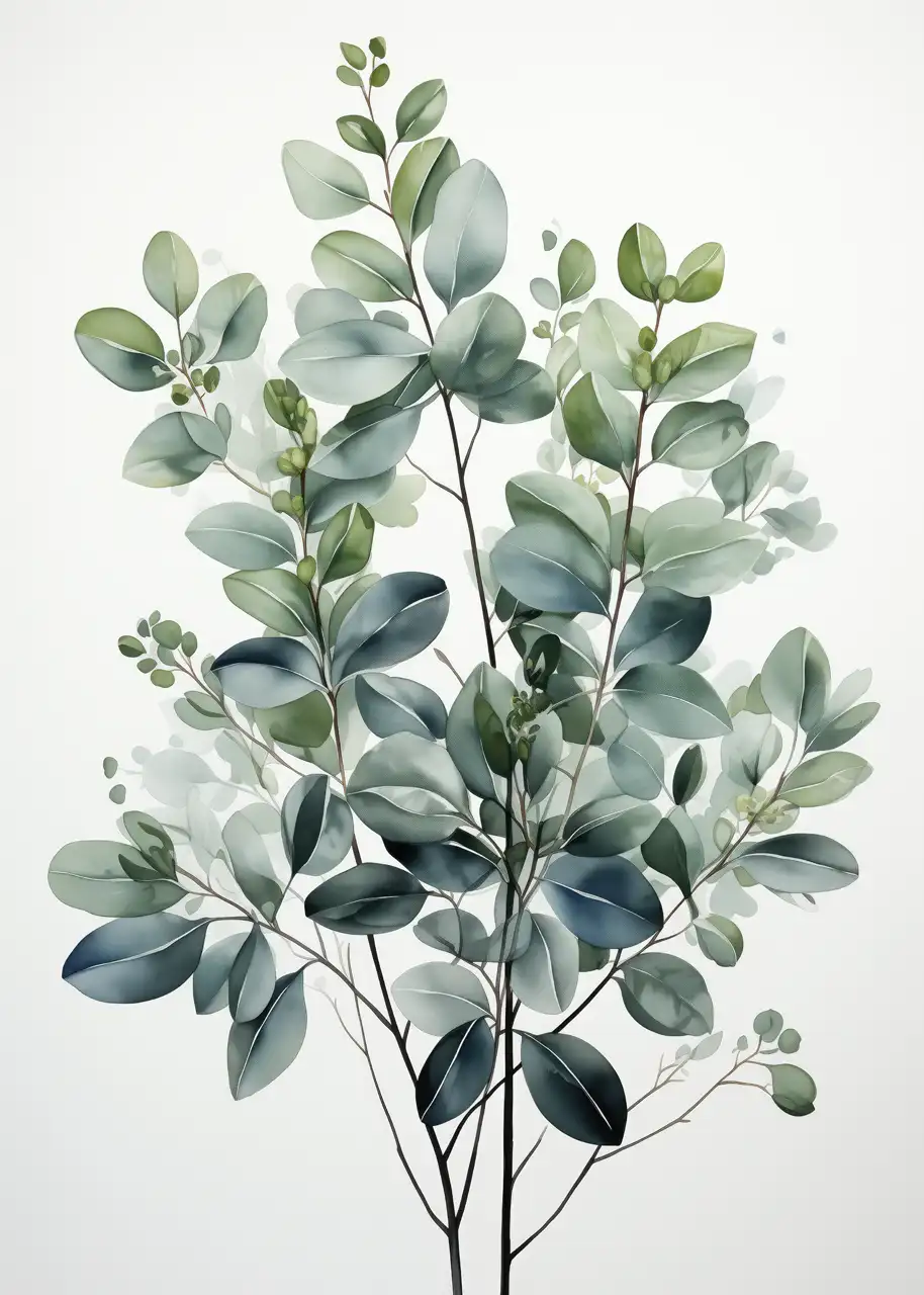 „Plakat Zielone liście II” ukazuje smukłe gałązki z licznymi, owalnymi liśćmi rozmieszczonymi rytmicznie wzdłuż cienkich, ciemnych łodyg. Kolorystyka obejmuje odcienie szałwii, chłodnej zieleni oraz przygaszonego błękitu, uzupełnione jaśniejszymi refleksami.