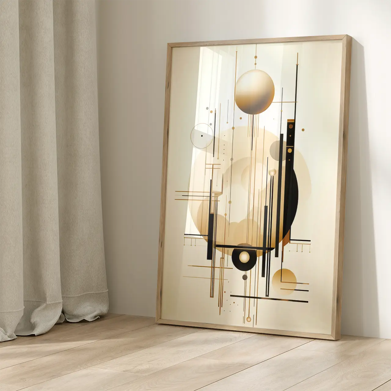 Centralnym elementem kompozycji są złote okręgi oraz pionowe struktury tworzące wyraźny rytm wizualny. Kontrast pomiędzy delikatnymi złotymi tonami a czarnymi elementami nadaje obrazowi głębię.