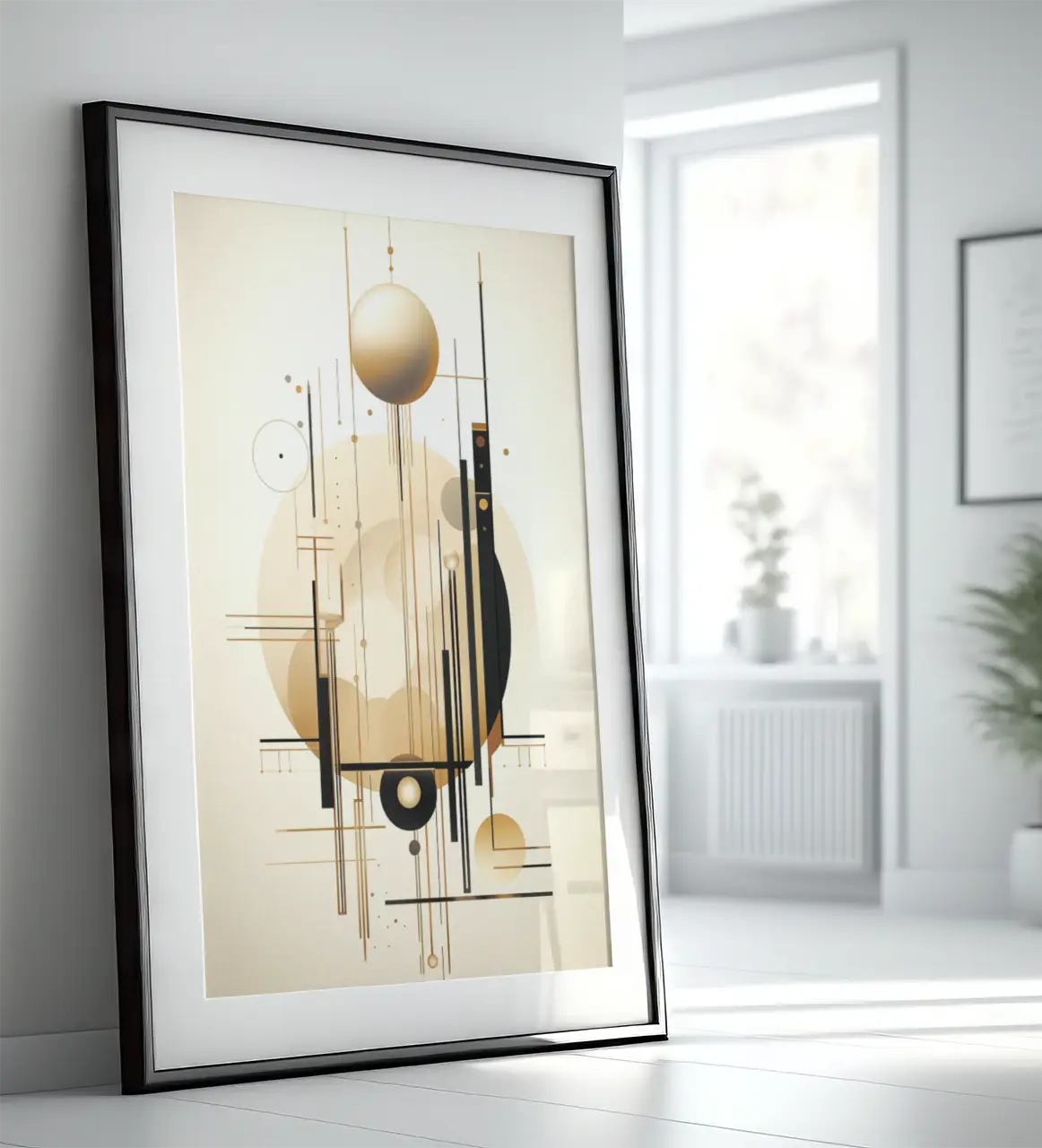 Plakat „Złoty Mechanizm II” przedstawia abstrakcyjną kompozycję złożoną z geometrycznych form, cienkich linii oraz okrągłych elementów przypominających fragmenty mechanicznej konstrukcji. Układ pionowych i poziomych linii tworzy wizualną strukturę inspirowaną schematami technicznymi i współczesnym designem.