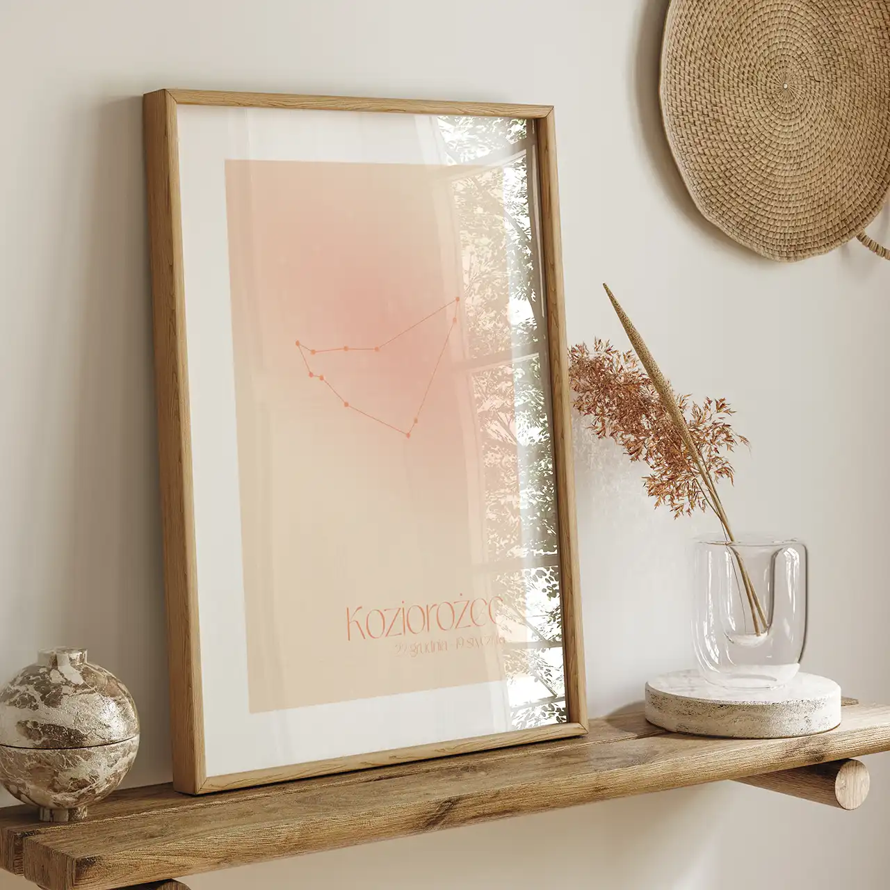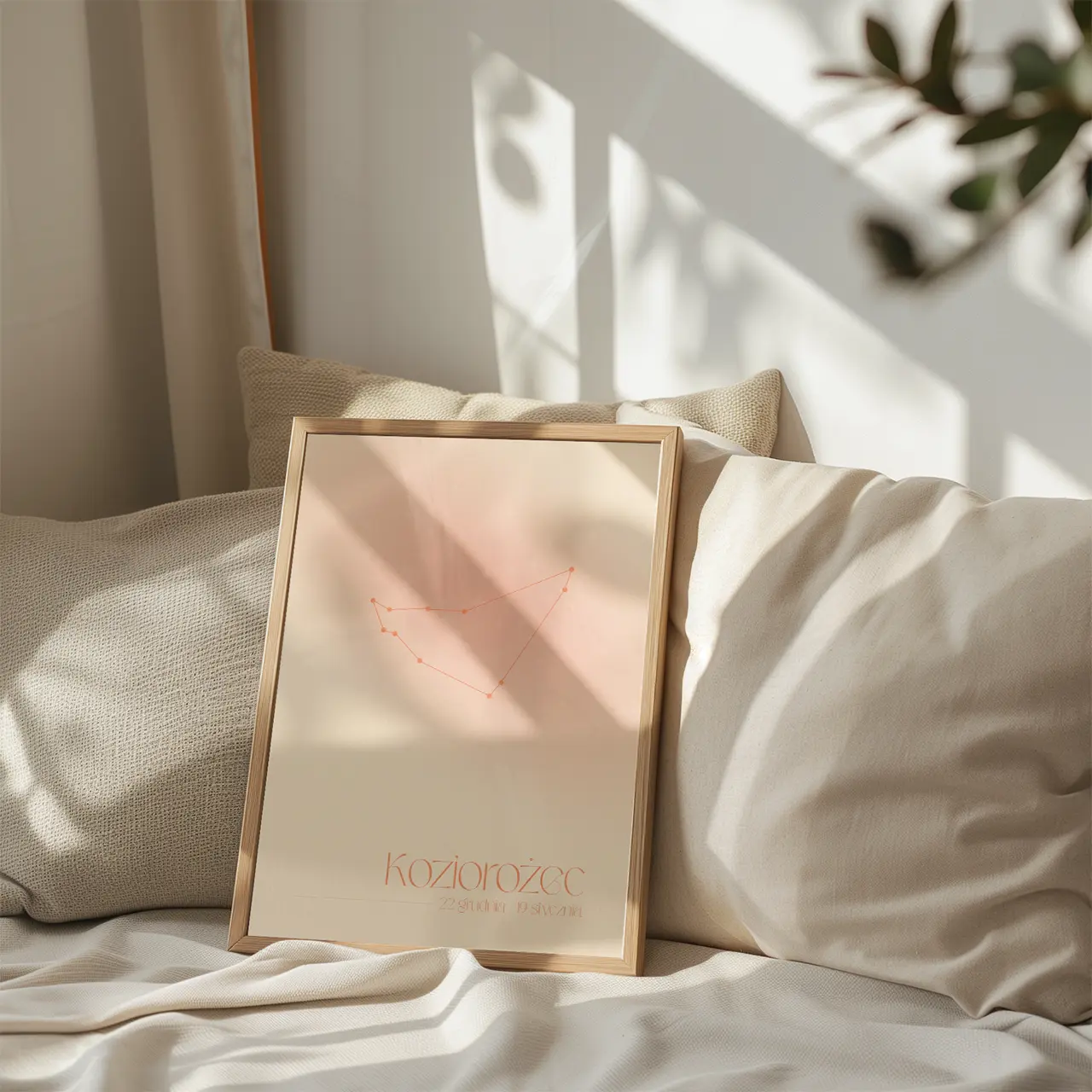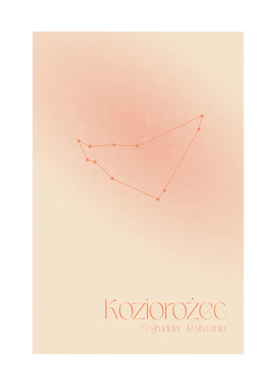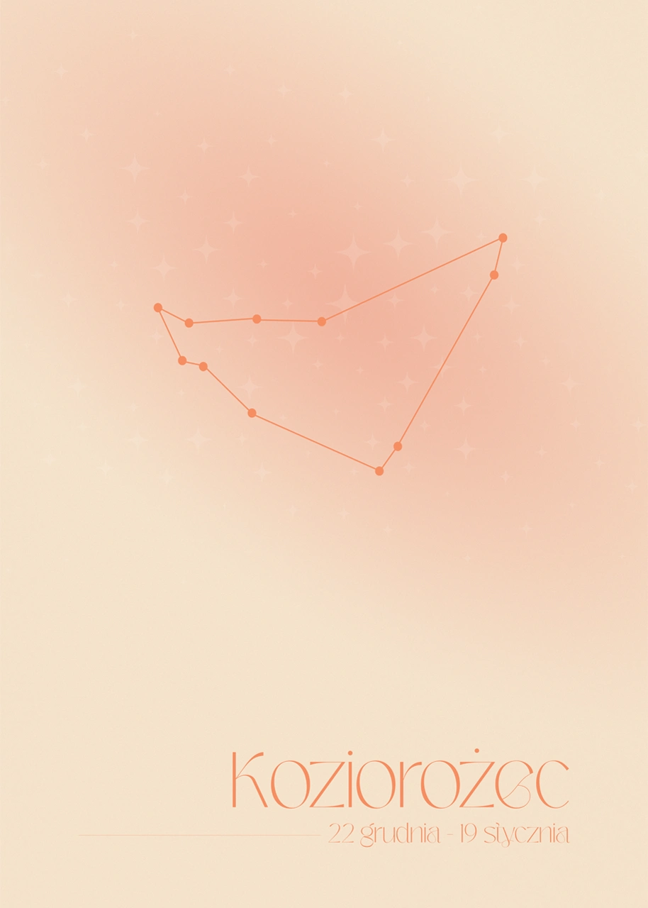 Jeden z naszych najnowszych projektów – plakat ze znakiem Koziorożca. To elegancka dekoracja, która wprowadza do wnętrza wyjątkowy klimat symboliki i astrologii. Na delikatnym, pastelowym tle przedstawiono gwiazdozbiór Koziorożca, subtelnie podkreślony jasnymi punktami i liniami, które tworzą ten charakterystyczny układ. Minimalistyczny design i stonowane barwy sprawiają, że plakat doskonale wpasuje się w różne aranżacje wnętrz, dodając im tajemniczości i osobistego charakteru. Pod gwiazdozbiorem znajduje się delikatny napis „Koziorożec” wraz z przedziałem dat odpowiadającym temu znakowi zodiaku. Plakat ze znakiem Koziorożca to idealna dekoracja dla osób urodzonych między 22 grudnia a 19 stycznia, chcących podkreślić swoją astrologiczną tożsamość.