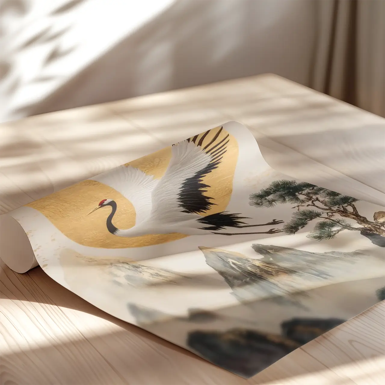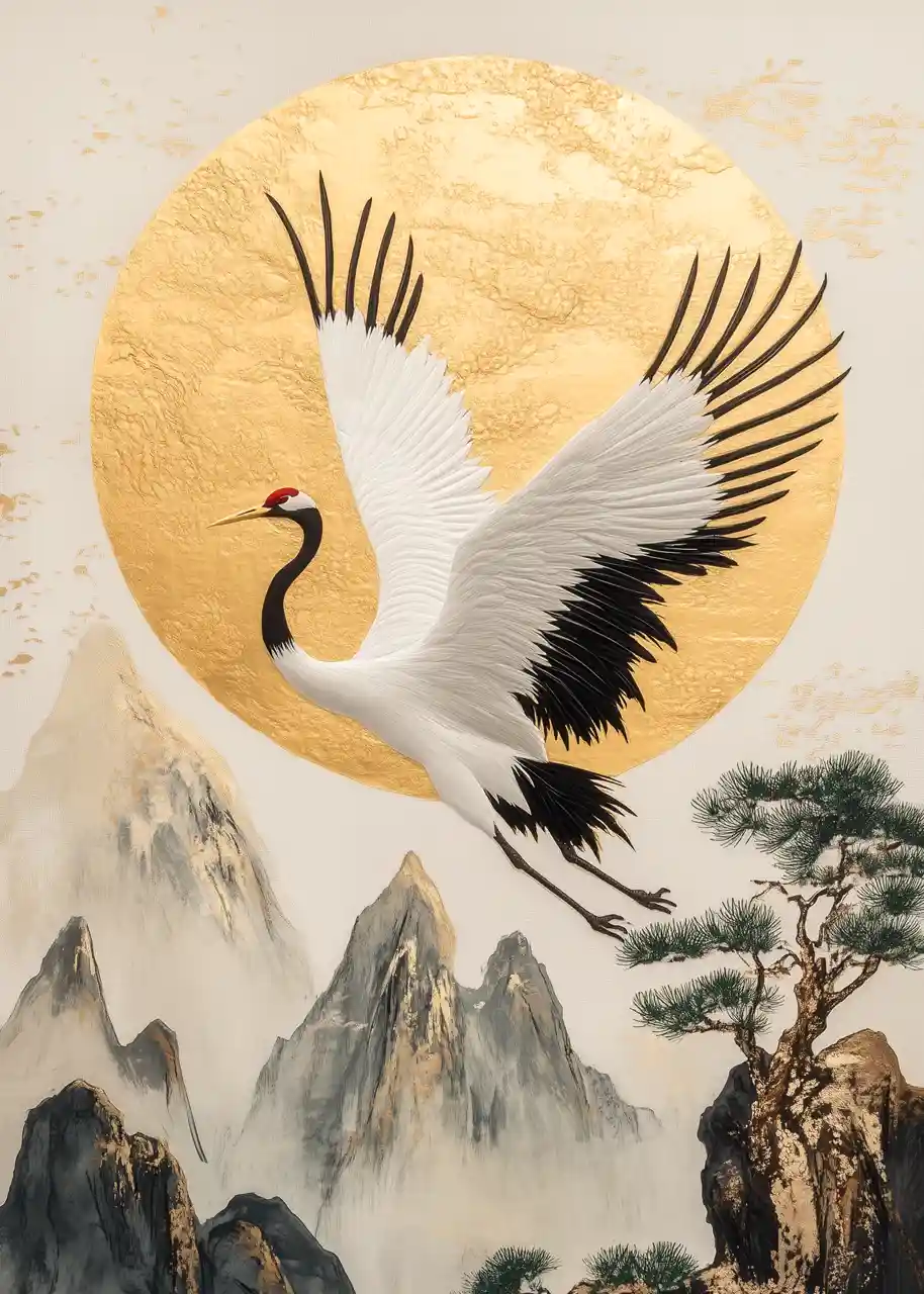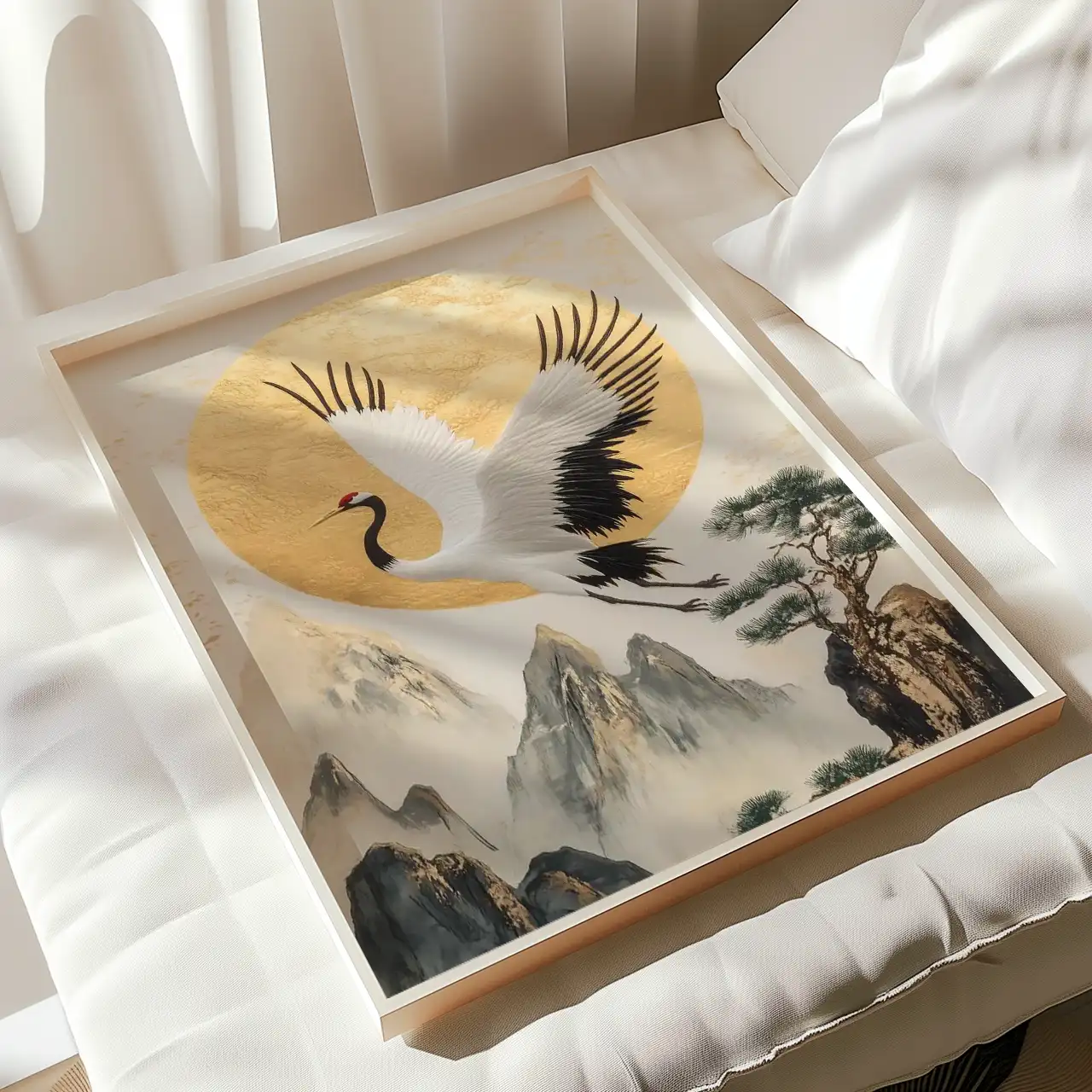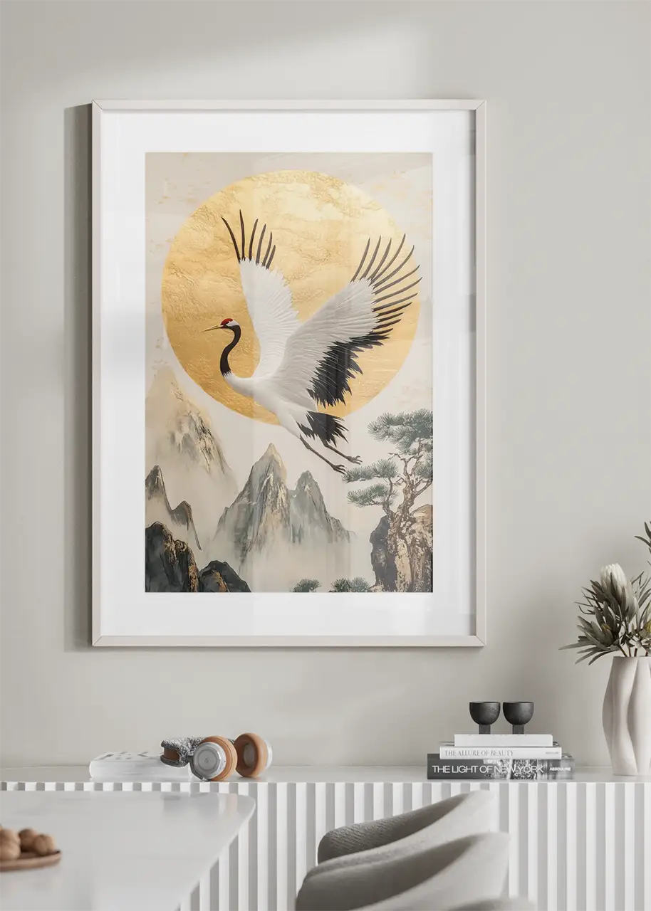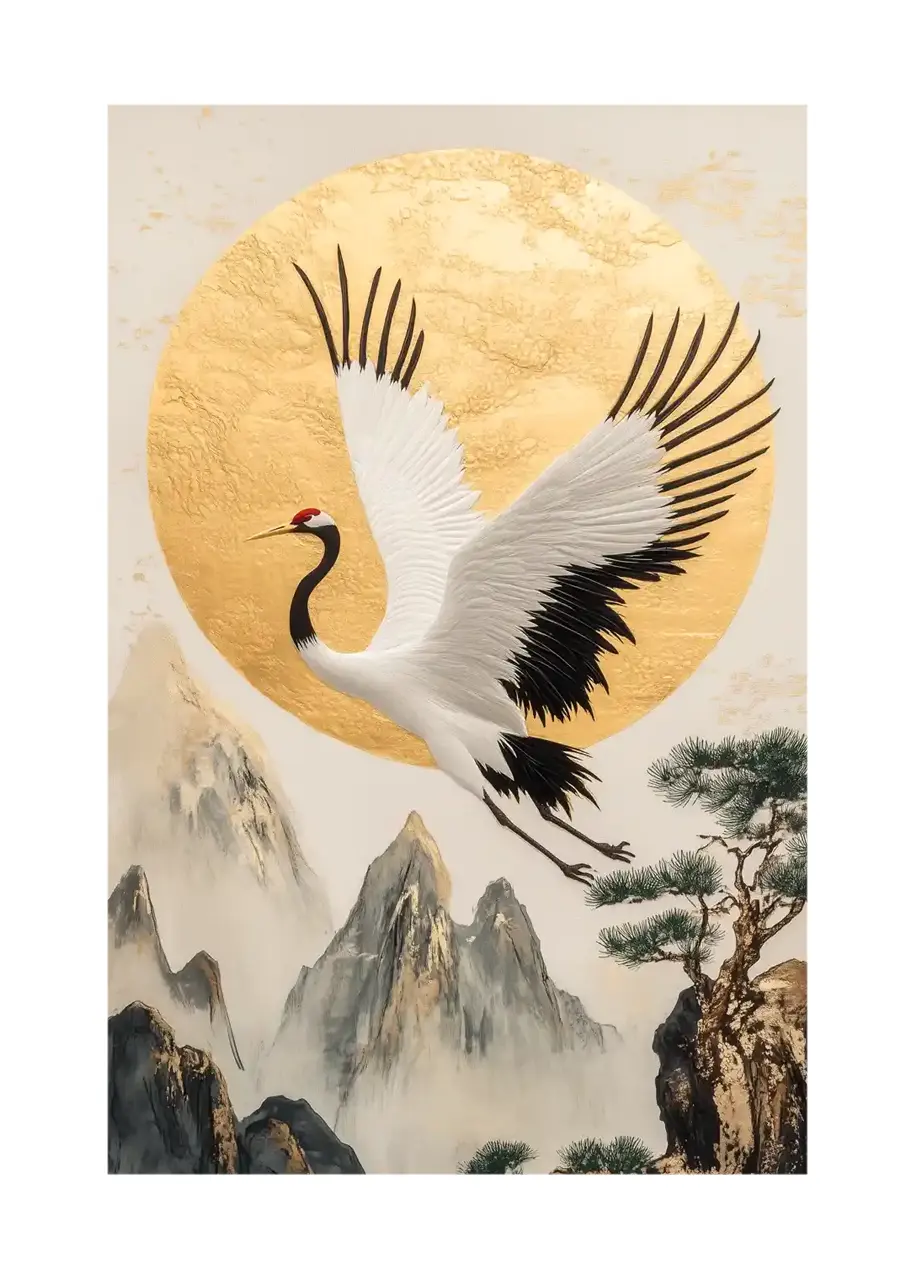 Plakat przedstawia majestatycznego żurawia z rozpostartymi skrzydłami, dumnie przelatującego nad skalistymi wzniesieniami. W tle rozciąga się pejzaż inspirowany tradycyjnym malarstwem japońskim – złote słońce, otoczone delikatnymi chmurami, rozświetla całą kompozycję, dodając jej niezwykłego blasku i elegancji. Subtelne detale, takie jak tekstura piór żurawia, złote refleksy oraz delikatne akcenty natury, nadają plakatowi wyjątkowego charakteru.