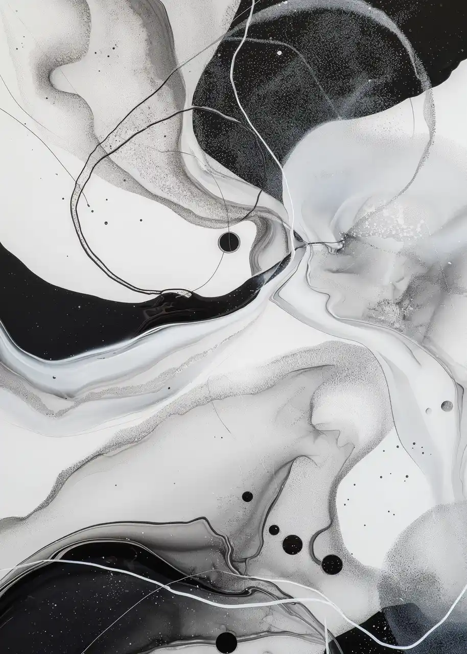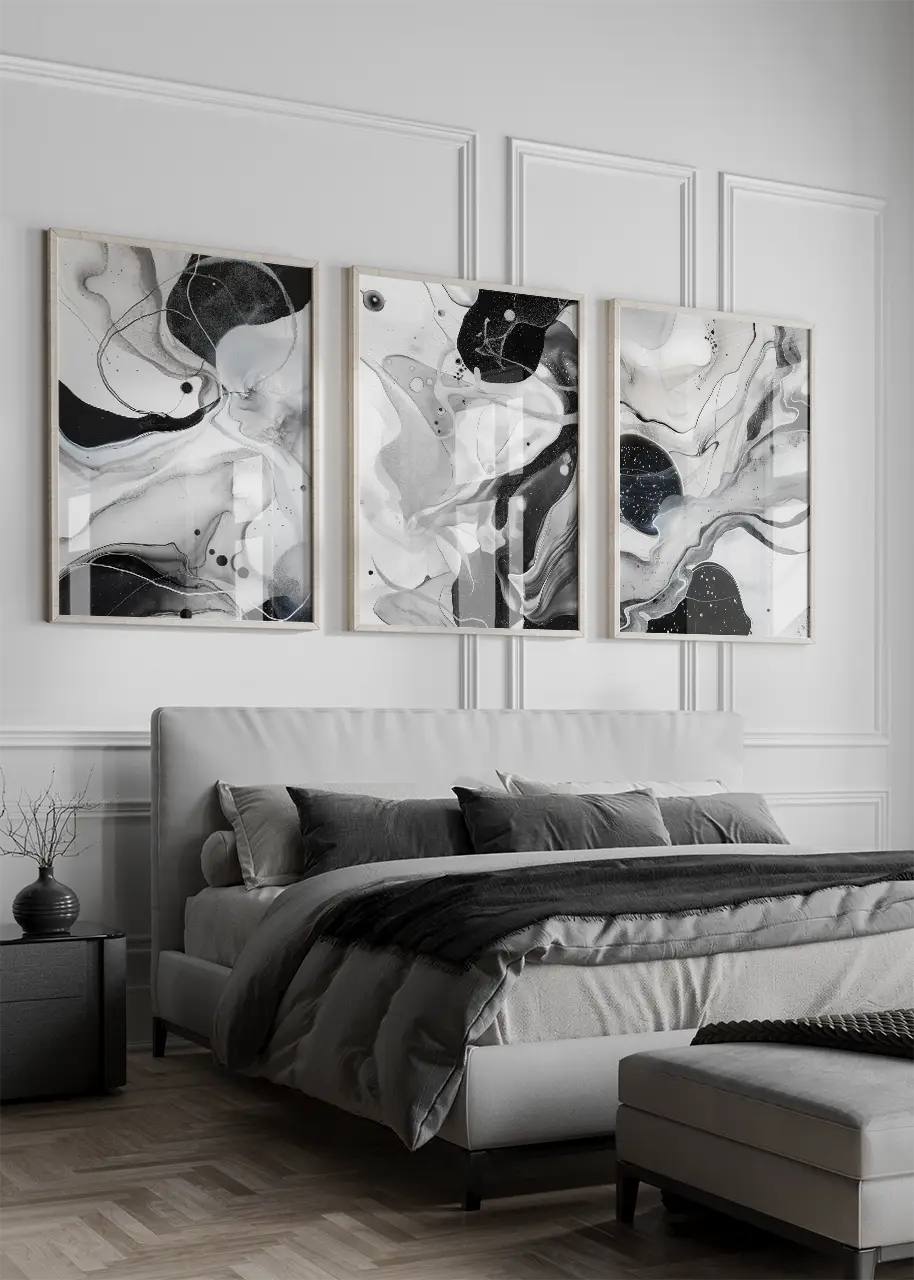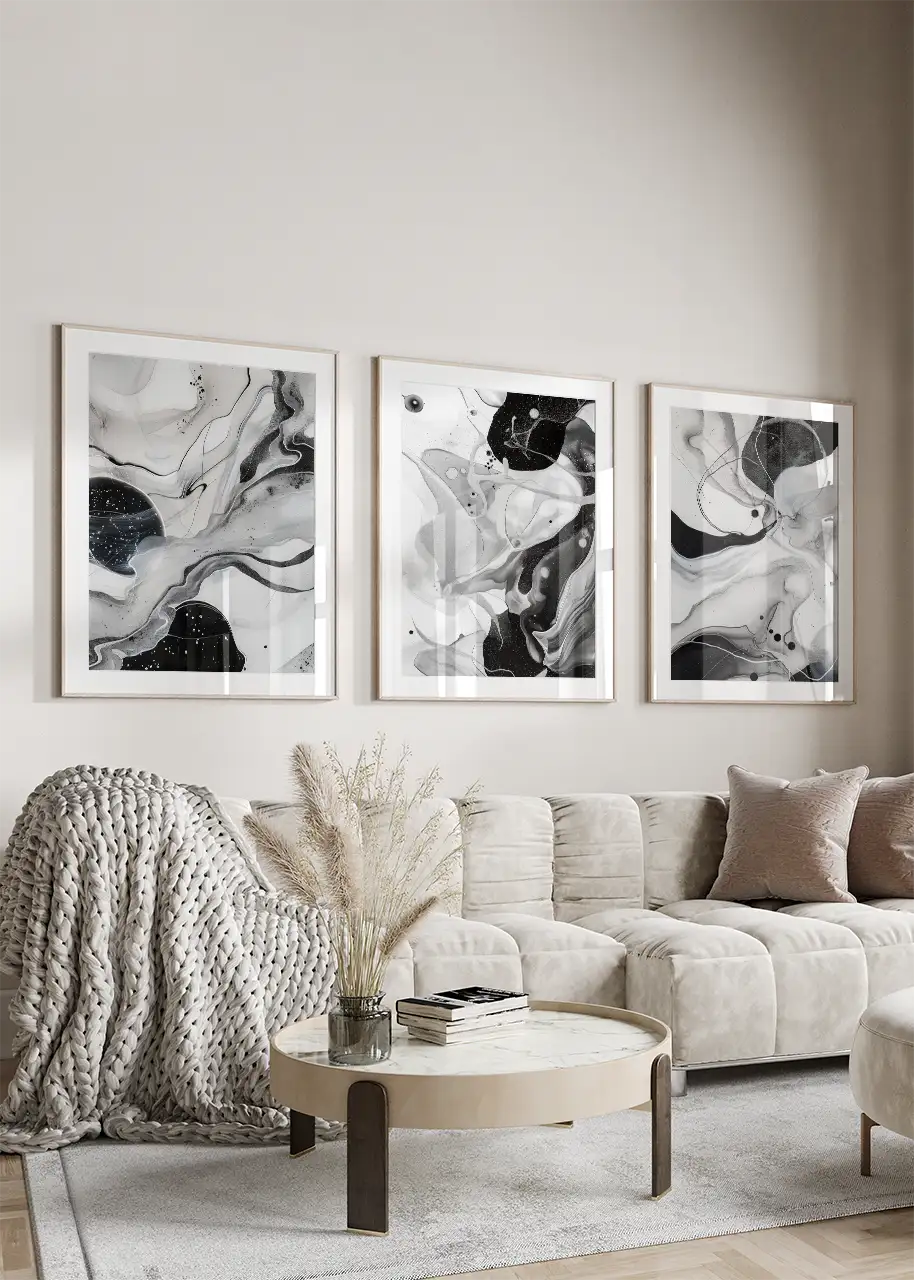 Zestaw trzech czarno-białych plakatów abstrakcyjnych do salonu