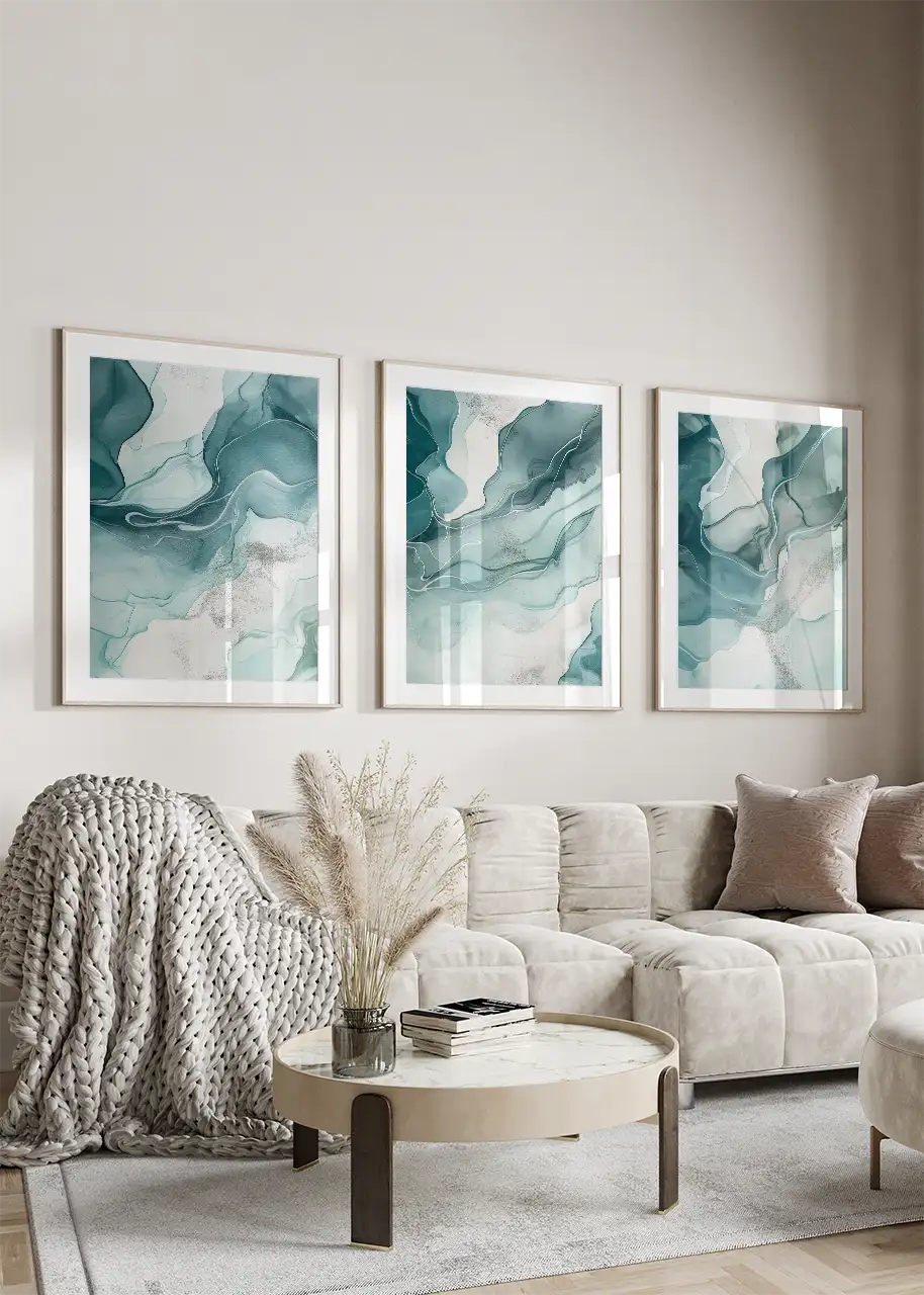 Zestaw trzech turkusowych plakatów abstrakcyjnych